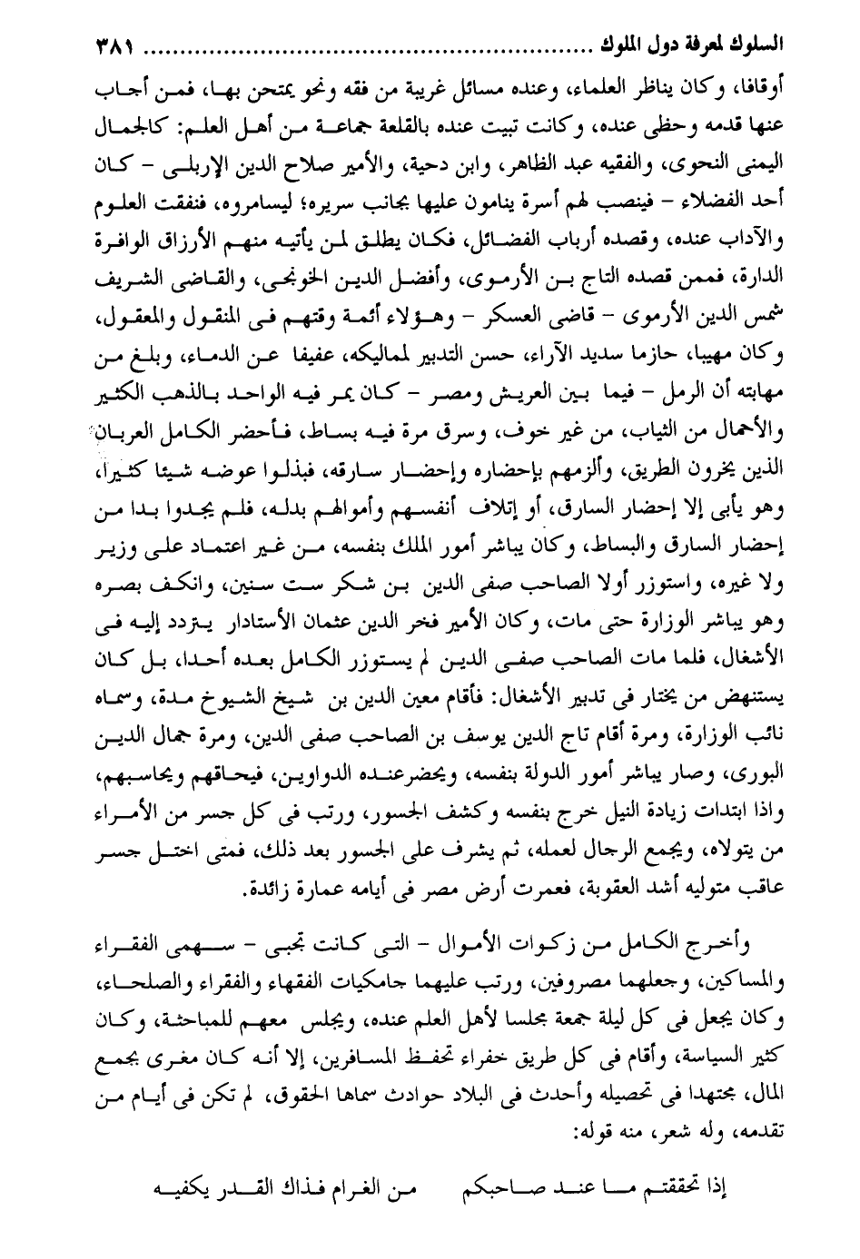 أوقافاً وَكَانَ يناظر الْعلمَاء وَعِنْده مسَائِل غَرِيبَة من فقه وَنَحْو يمْتَحن بهَا فَمن أجَاب عَنْهَا قدمه وحظي عِنْده وَكَانَت تبيت عِنْده بالقلعة جمَاعَة من أهل الْعلم: كالجمال اليمني النَّحْوِيّ والفقيه عبد الظَّاهِر وَابْن دحْيَة والأمير صَلَاح الدّين الإربلي - كَانَ أحد الْفُضَلَاء - فينصب لَهُم أسرة ينامون عَلَيْهَا بِجَانِب سَرِيره ليسامروه فنفقت الْعُلُوم والآداب عِنْده وقصده أَرْبَاب الْفَضَائِل فَكَانَ يُطلق لمن يَأْتِيهِ مِنْهُم الأرزاق الوافرة الدارة فَمِمَّنْ قَصده التَّاج بن الأرموي وَأفضل الدّين الخونجي وَالْقَاضِي الشريف شمس الدّين الأرموي - قَاضِي الْعَسْكَر - وَهَؤُلَاء أَئِمَّة وقتهم فِي الْمَنْقُول والمعقول وَكَانَ مهيباً حازماً سديد الآراء حسن التَّدْبِير لمماليكه عفيفاً عَن الدِّمَاء وَبلغ من مهابته أَن الرمل - فِيمَا بَين الْعَريش ومصر - كَانَ يمر فِيهِ الْوَاحِد بِالذَّهَب الْكثير والأحمال من الثِّيَاب من غير خوف وسرق مرّة فِيهِ بِسَاط فَاحْضُرْ الْكَامِل العربان الَّذين يخرون الطَّرِيق وألزمهم بإحضاره وإحضار سارقه فبذلوا عوضه شَيْئا كثيرا وَهُوَ يَأْبَى إِلَّا إِحْضَار السَّارِق أَو إِتْلَاف أنفسهم وَأَمْوَالهمْ بدله فَلم يَجدوا بدا من إِحْضَار السَّارِق والبساط وَكَانَ يُبَاشر أُمُور الْملك بِنَفسِهِ من غير اعْتِمَاد على وَزِير وَلَا غَيره واستوزر أَولا الصاحب صفى الدّين بن شكر سِتّ سِنِين وانكف بَصَره وَهُوَ يُبَاشر الوزارة حَتَّى مَاتَ وَكَانَ الْأَمِير فَخر الدّين عُثْمَان الأستادار يتَرَدَّد إِلَيْهِ فِي الأشغال فَلَمَّا مَاتَ الصاحب صفي الدّين لم يستوزر الْكَامِل بعده أحدا بل كَانَ يستنهض من يخْتَار فِي تَدْبِير الأشغال: فَأَقَامَ معِين الدّين بن شيخ الشُّيُوخ مُدَّة وَسَماهُ نَائِب الوزارة وَمرَّة أَقَامَ تَاج الدّين يُوسُف بن الصاحب صفي الدّين وَمرَّة جمال الدّين البوري وَصَارَ يُبَاشر أُمُور الدولة بِنَفسِهِ ويحضر عِنْده الدَّوَاوِين فيحاقهم ويحاسبهم وَإِذا ابتدأت زِيَادَة النّيل خرج بِنَفسِهِ وكشف الجسور ورتب فِي كل جسر من الْأُمَرَاء من يَتَوَلَّاهُ وَيجمع الرِّجَال لعمله ثمَّ يشرف على الجسور بعد ذَلِك فَمَتَى اخْتَلَّ جسر عاقب متوليه أَشد الْعقُوبَة فعمرت أَرض مصر فِي أَيَّامه عمَارَة زَائِدَة. وَأخرج الْكَامِل من زكوات الْأَمْوَال - الَّتِي كَانَت تجبى - سهمي الْفُقَرَاء وَالْمَسَاكِين وجعلهما مصروفين ورتب عَلَيْهِمَا جامكيات الْفُقَهَاء والفقراء والصلحاء وَكَانَ يَجْعَل فِي كل لَيْلَة جُمُعَة مَجْلِسا لأهل الْعلم عِنْده وَيجْلس مَعَهم للمباحثة وَكَانَت كثير السياسة وَأقَام فِي كل طَرِيق خفراء تحفظ الْمُسَافِرين إِلَّا أَنه كَانَ معري بِجمع المَال مُجْتَهدا فِي تَحْصِيله وأحدث فِي الْبِلَاد حوادث سَمَّاهَا الْحُقُوق لم تكن فِي أَيَّام من تقدمه وَله شعر مِنْهُ قَوْله: إِذا تحققتم مَا عِنْد صَاحبكُم من الغرام فَذَاك الْقدر يَكْفِيهِ