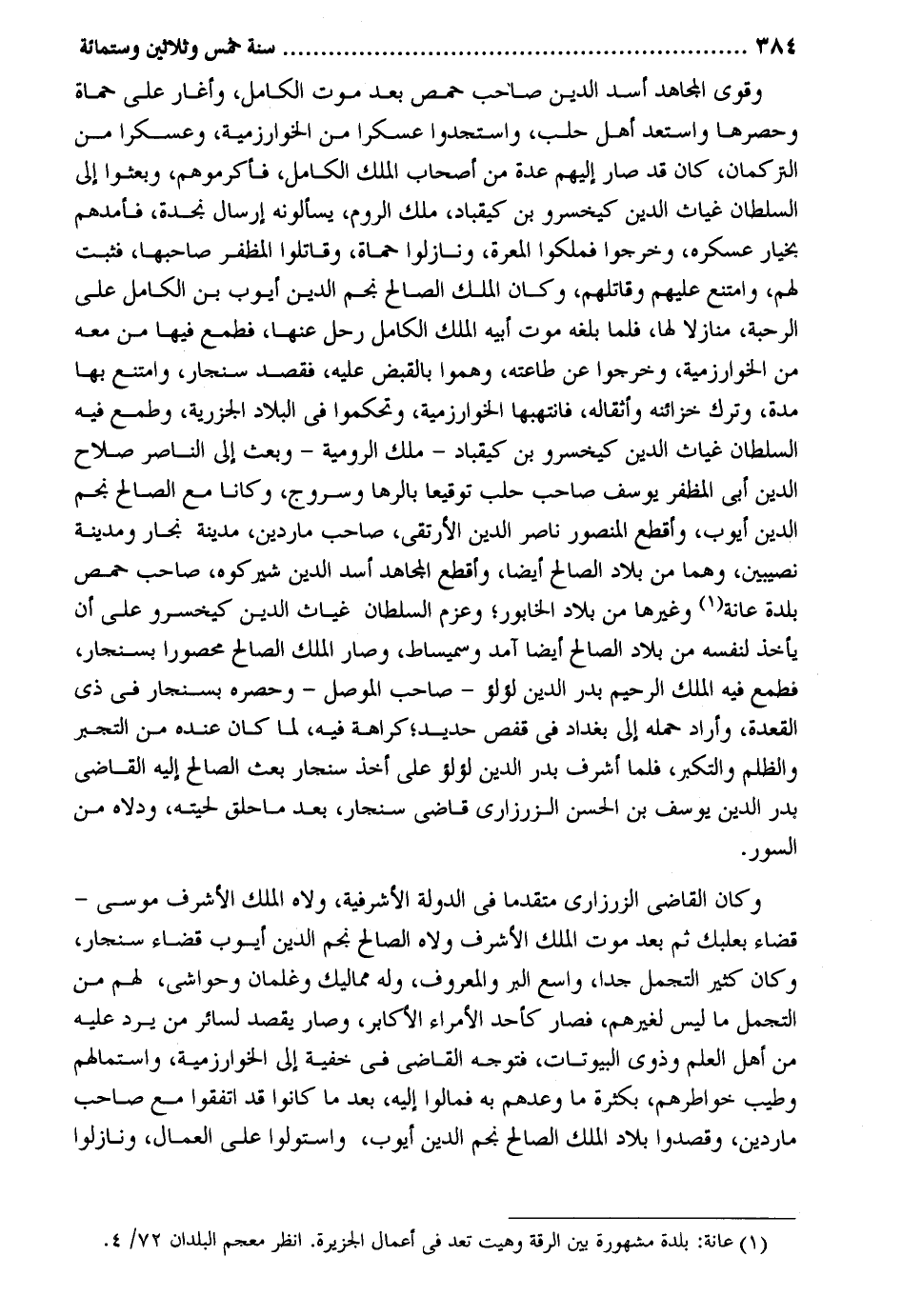 وَقَوي الْمُجَاهِد أَسد الدّين صاخب حمص بعد موت الْكَامِل وأغار على حماة وحصرها واستعد أهل حلب واستجدوا عسكرا من الخوارزمية وعسكراً من الزكمان كَانَ قد صَار إِلَيْهِم عدَّة من أَصْحَاب الْملك الْكَامِل فأكرموهم وبعثوا إِلَى السُّلْطَان غياث الدّين كيخسرو بن كيقباد ملك الرّوم يسألونه إرْسَال نجدة فَأَمَدَّهُمْ بِخِيَار عسكره وَخَرجُوا فملكوا المعرة ونازلوا حماة وقاتلوا المظفر صَاحبهَا فَثَبت لَهُم وَامْتنع عَلَيْهِم وَقَاتلهمْ وَكَانَ الْملك الصَّالح نجم الدّين أَيُّوب بن الْكَامِل على الرحبة منازلاً لَهَا فَلَمَّا بلغه موت أَبِيه الْملك الْكَامِل رَحل عَنْهَا فطمع فِيهَا من مَعَه من الخوارزمية وَخَرجُوا عَن طَاعَته وهموا بِالْقَبْضِ عَلَيْهِ فقصد سنجار وَامْتنع بهَا مُدَّة وَترك خزائنه وأثقاله فأنتهبها الخوارزمية وتحكموا فِي الْبِلَاد الجزرية وطمع فِيهِ السُّلْطَان غياث الدّين كيخسرو بن كيقباد - ملك الرومية - وَبعث إِلَى النَّاصِر صَلَاح الدّين أبي المظفر يُوسُف صَاحب حلب توقيعاً بالرها وسروج وَكَانَا مَعَ الصَّالح نجم الدّين أَيُّوب وأقطع الْمَنْصُور نَاصِر الدّين الأرتقي صَاحب ماردين مَدِينَة نجار ومدينة نَصِيبين وهما من بِلَاد الصَّالح أَيْضا وأقطع الْمُجَاهِد أَسد الدّين شيركوه صَاحب حمص بَلْدَة عانة وَغَيرهَا من بِلَاد الخابور وعزم السُّلْطَان غياث الدّين كيخسرو على أَن يَأْخُذ لنَفسِهِ من بِلَاد الصَّالح أَيْضا آمد وسميساط وَصَارَ الْملك الصَّالح محصوراً بسنجار فطمع فِيهِ الْملك الرَّحِيم بدر الدّين لُؤْلُؤ - صَاحب الْموصل - وحصره بسنجار فِي ذِي الْقعدَة وَأَرَادَ حمله إِلَى بَغْدَاد فِي قفص جَدِيد كَرَاهَة فِيهِ لما كَانَ عِنْده من التجبر وَالظُّلم والمكبر فَلَمَّا أشرف بدر الدّين لُؤْلُؤ على أَخذ سنجار بعث الصَّالح إِلَيْهِ القَاضِي بدر الدّين يُوسُف بن الْحسن الزرزاري قَاضِي سنجار بعد مَا حلق لحيته وَدَلاهُ من السُّور. وَكَانَ القَاضِي الزرزاري مُتَقَدما فِي الدولة الأشرفية ولاه الْملك الْأَشْرَف مُوسَى قَضَاء بعلبك ثمَّ بعد موت الْملك الْأَشْرَف ولاه الصَّالح نجم الدّين أَيُّوب قَضَاء سنجار وَكَانَ كثير التجمل جدا وَاسع الْبر وَالْمَعْرُوف وَله مماليك وغلمان وحواشي لَهُم من التجمل مَا لَيْسَ لغَيرهم فَصَارَ كَأحد الْأُمَرَاء الأكابر وَصَارَ يقْصد لسَائِر من يرد عَلَيْهِ من أهل الْعلم وَذَوي البيوتات فَتوجه القَاضِي فِي خُفْيَة إِلَى الخوارزمية واستمالهم وَطيب خواطرهم بِكَثْرَة مَا وعدهم بِهِ فمالوا إِلَيْهِ بعد مَا كَانُوا قد اتَّفقُوا مَعَ صَاحب ماردين وقصدوا بِلَاد الْملك الصَّالح نجم الدّين أَيُّوب واستولوا على الْعمَّال ونازلوا