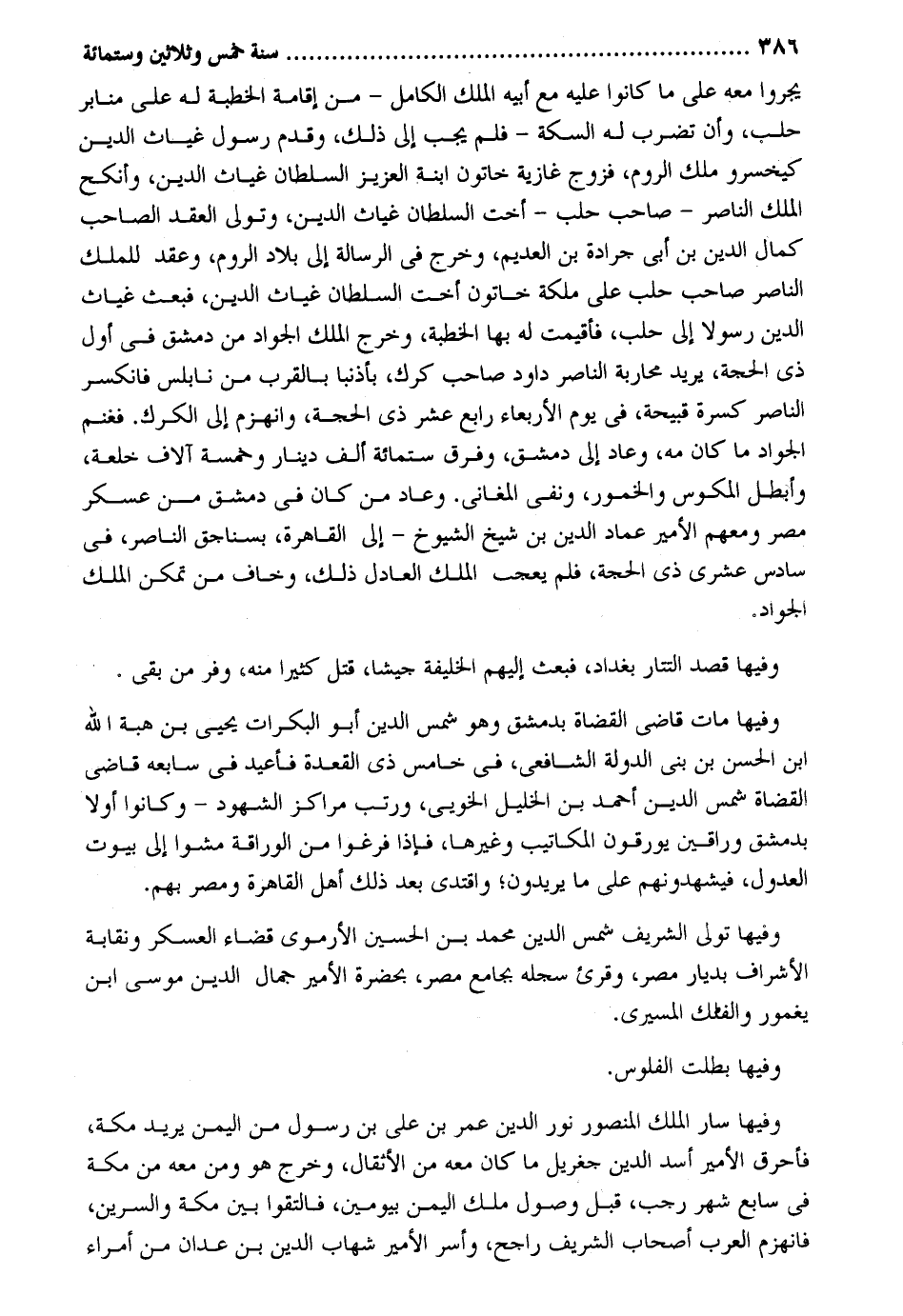 يجروا مَعَه على مَا كَانُوا عَلَيْهِ مَعَ أَبِيه الْملك الْكَامِل - من إِقَامَة الْخطْبَة لَهُ على مَنَابِر حلب وَأَن تضرب لَهُ السِّكَّة - فَلم يجب إِلَى ذَلِك وَقدم رَسُول غياث الدّين كيخسرو ملك الرّوم فزوج غَازِيَة خاتون ابْنة الْعَزِيز السُّلْطَان غياث الدّين وأنكح الْملك النَّاصِر - صَاحب حلب - أُخْت السُّلْطَان غياث الدّين وَتَوَلَّى العقد الصاحب كَمَال الدّين بن أبي جَرَادَة بن العديم وَخرج فِي الرسَالَة إِلَى بِلَاد الرّوم وَعقد للْملك النَّاصِر صَاحب حلب على ملكة خاتون أُخْت السُّلْطَان غياث الدّين فَبعث غياث الدّين رَسُولا إِلَى حلب فأقيمت لَهُ بهَا الْخطْبَة وَخرج الْملك الْجواد من دمشق فِي أول ذِي الْحجَّة يُرِيد محاربة النَّاصِر دَاوُد صَاحب كرك بأذنبا بِالْقربِ من نابلس فانكسر النَّاصِر كسرة قبيحة فِي يَوْم الْأَرْبَعَاء رَابِع عشر ذِي الْحجَّة وَانْهَزَمَ إِلَى الكرك. فغنم الْجواد مَا كَانَ مَه وَعَاد إِلَى دمشق وَفرق سِتّمائَة ألف دِينَار وَخَمْسَة آلَاف خلعة وأبطل المكوس وَالْخُمُور وَنفى المغاني. وَعَاد من كَانَ فِي دمشق من عَسْكَر مصر وَمَعَهُمْ الْأَمِير عماد الدّين بن شيخ الشُّيُوخ إِلَى الْقَاهِرَة بسناجق النَّاصِر فِي سادس عشري ذِي الْحجَّة فَلم يعجب الْملك الْعَادِل ذَلِك وَخَافَ من تمكن الْملك الْجواد. وفيهَا قصد التتار بَغْدَاد فَبعث إِلَيْهِم الْخَلِيفَة جَيْشًا قتل كثيرا مِنْهُ وفر من بَقِي. وفيهَا مَاتَ قَاضِي الْقُضَاة بِدِمَشْق وَهُوَ شمس الدّين أَبُو البكرات يحيي بن هبة الله ابْن الْحسن بن بني الدولة الشَّافِعِي فِي خَامِس ذِي الْقعدَة فأعيد فِي سابعه قَاضِي الْقُضَاة شمس الدّين أَحْمد بن الْخَلِيل الخويي ورتب مراكز الشُّهُود - وَكَانُوا أَولا بِدِمَشْق وراقين يورقون المكاتيب وَغَيرهَا فَإِذا فرغوا من الوراقة مَشوا إِلَى بيُوت الْعُدُول فيشهدونهم على مَا يُرِيدُونَ واقتدى بعد ذَلِك أهل الْقَاهِرَة ومصر بهم. وفيهَا تولى الشريف شمس الدّين مُحَمَّد بن الْحسن الأرموي قَضَاء الْعَسْكَر ونقابة الْأَشْرَاف بديار مصر وَقُرِئَ سجله بِجَامِع مصر بِحَضْرَة الْأَمِير جمال الدّين مُوسَى ابْن يغمور وَالْملك المسيري. وفيهَا بطلت الْفُلُوس. وفيهَا سَار الْملك الْمَنْصُور نور الدّين عمر بن عَليّ بن رَسُول من الْيمن يُرِيد مَكَّة أحرق الْأَمِير أَسد الدّين جغريل مَا كَانَ مَعَه من الأثقال وَخرج هُوَ رمن مَعَه من مَكَّة فِي سَابِع شهر رَجَب قبل وُصُول ملك الْيمن بيومين فَالْتَقوا بَين مَكَّة والسرين انهزم الْعَرَب أَصْحَاب الشريف رَاجِح وَأسر الْأَمِير شهَاب الدّين بن عدان من أُمَرَاء