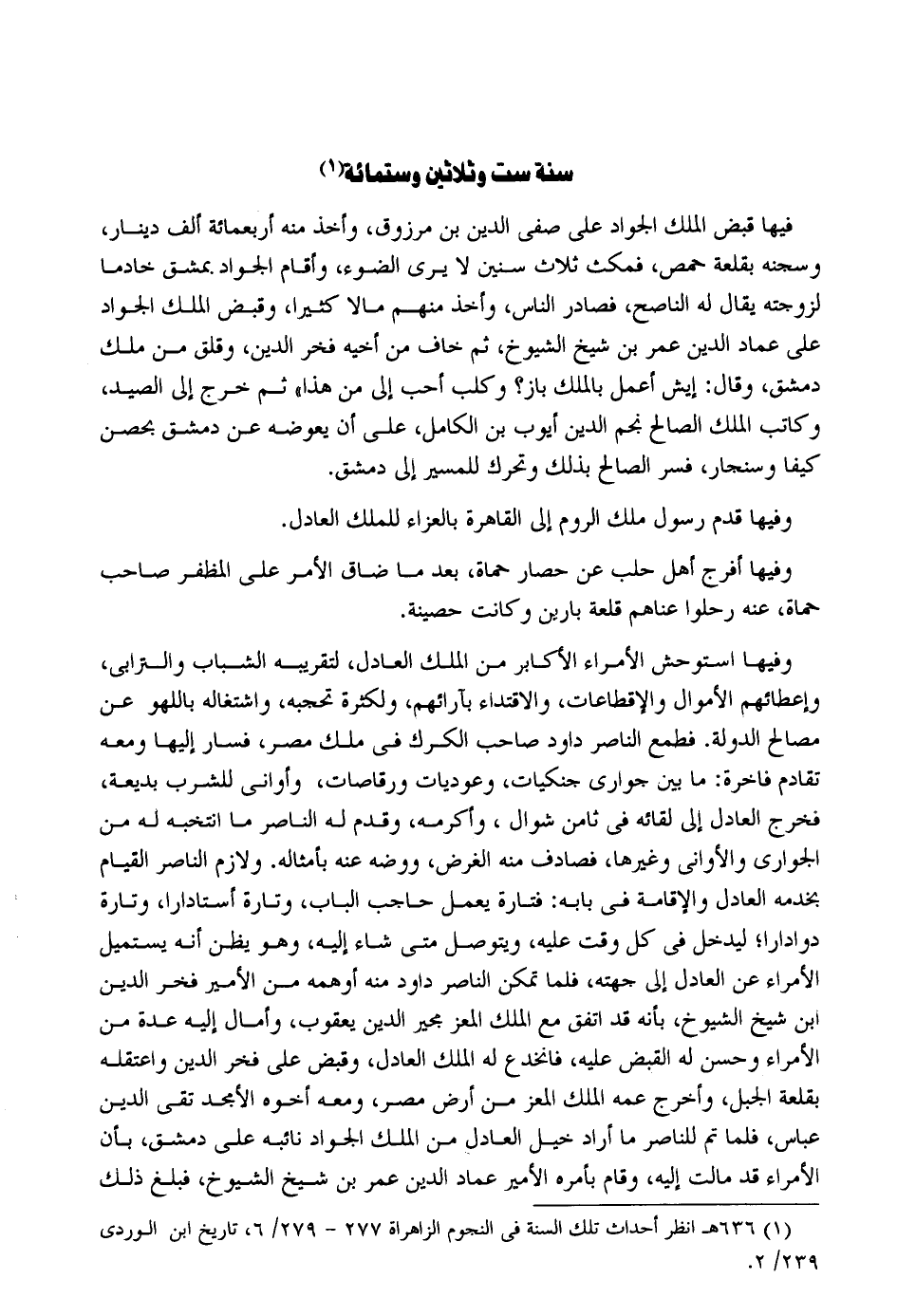 سنة سِتّ وَثَلَاثِينَ وسِتمِائَة فِيهَا قبض الْملك الْجواد على صفي الدّين بن مَرْزُوق وَأخذ مِنْهُ أَرْبَعمِائَة ألف دِينَار وسجنه بقلعة حمص فَمَكثَ ثَلَاث سِنِين لَا يرى الضَّوْء وَأقَام الْجواد بِدِمَشْق خَادِمًا لزوجته يُقَال لَهُ الناصح فصادر النَّاس وَأخذ مِنْهُم مَالا كثيرا وَقبض الْملك الْجواد على عماد الدّين عمر بن شيخ الشُّيُوخ ثمَّ خَافَ من أَخِيه فَخر الدّين وقلق من ملك دمشق وَقَالَ: إيش أعمل بِالْملكِ باز وكلب أحب إِلَى من هَذَا ثمَّ خرج إِلَى الصَّيْد وَكَاتب الْملك الصَّالح نجم الدّين أَيُّوب بن الْكَامِل على أَن يعوضه عَن دمشق بحصن كيفا وسنجار فسر الصَّالح بذلك وتحرك للمسير إِلَى دمشق. وفيهَا قدم رَسُول ملك الرّوم إِلَى الْقَاهِرَة بالعزاء للْملك الْعَادِل. وفيهَا أفرج أهل حلب عَن حِصَار حماة بعد مَا ضَاقَ الْأَمر على المظفر صَاحب حماة عَنهُ رحلوا عناهم قلعة بارين وَكَانَت حَصِينَة. وفيهَا استوحش الْأُمَرَاء الأكابر من الْملك الْعَادِل لتقريبه الشَّبَاب والترابي وإعطائهم الْأَمْوَال والإقطاعات والاقتداء بآرائهم ولكثرة تحجبه واشتغاله باللهو عَن مصَالح الدولة. فطمع النَّاصِر دَاوُد صَاحب الكرك فِي ملك مصر فَسَار إِلَيْهَا وَمَعَهُ تقادم فاخرة: مَا بَين جواري جنكيات وعوديات ورقاصات وأواني للشُّرْب بديعة فَخرج الْعَادِل إِلَى لِقَائِه فِي ثامن شَوَّال وأكرمه وَقدم لَهُ النَّاصِر مَا انتخبه من الْجَوَارِي والأواني وَغَيرهَا فصادف مِنْهُ الْغَرَض ووضه عَنهُ بأمثاله. ولازم النَّاصِر الْقيام بخدمه الْعَادِل وَالْإِقَامَة فِي بَابه: فَتَارَة يعْمل حَاجِب الْبَاب وَتارَة أستاداراً وَتارَة دواداراً ليدْخل فِي كل وَقت عَلَيْهِ ويتوصل مَتى شَاءَ إِلَيْهِ وَهُوَ يظنّ أَنه يستميل الْأُمَرَاء عَن الْعَادِل إِلَى جِهَته فَلَمَّا تمكن النَّاصِر دَاوُد مِنْهُ أَوْهَمهُ من الْأَمِير فَخر الدّين ابْن شيخ الشُّيُوخ بِأَنَّهُ قد اتّفق مَعَ الْملك الْمعز مجير الدّين يَعْقُوب وأمال إِلَيْهِ عدَّة من الْأُمَرَاء وَحسن لَهُ الْقَبْض عَلَيْهِ فانخدع لَهُ الْملك الْعَادِل وَقبض على فَخر الدّين واعتقله بقلعة الْجَبَل وَأخرج عَمه الْملك الْمعز من أَرض مصر وَمَعَهُ أَخُوهُ الأمجد تَقِيّ الدّين عَبَّاس فَلَمَّا تمّ للناصر مَا أَرَادَ خيل الْعَادِل من الْملك الْجواد نَائِبه على دمشق بِأَن الْأُمَرَاء قد مَالَتْ إِلَيْهِ وَقَامَ بأَمْره الْأَمِير عماد الدّين عمر بن شيخ الشُّيُوخ فَبلغ ذَلِك
