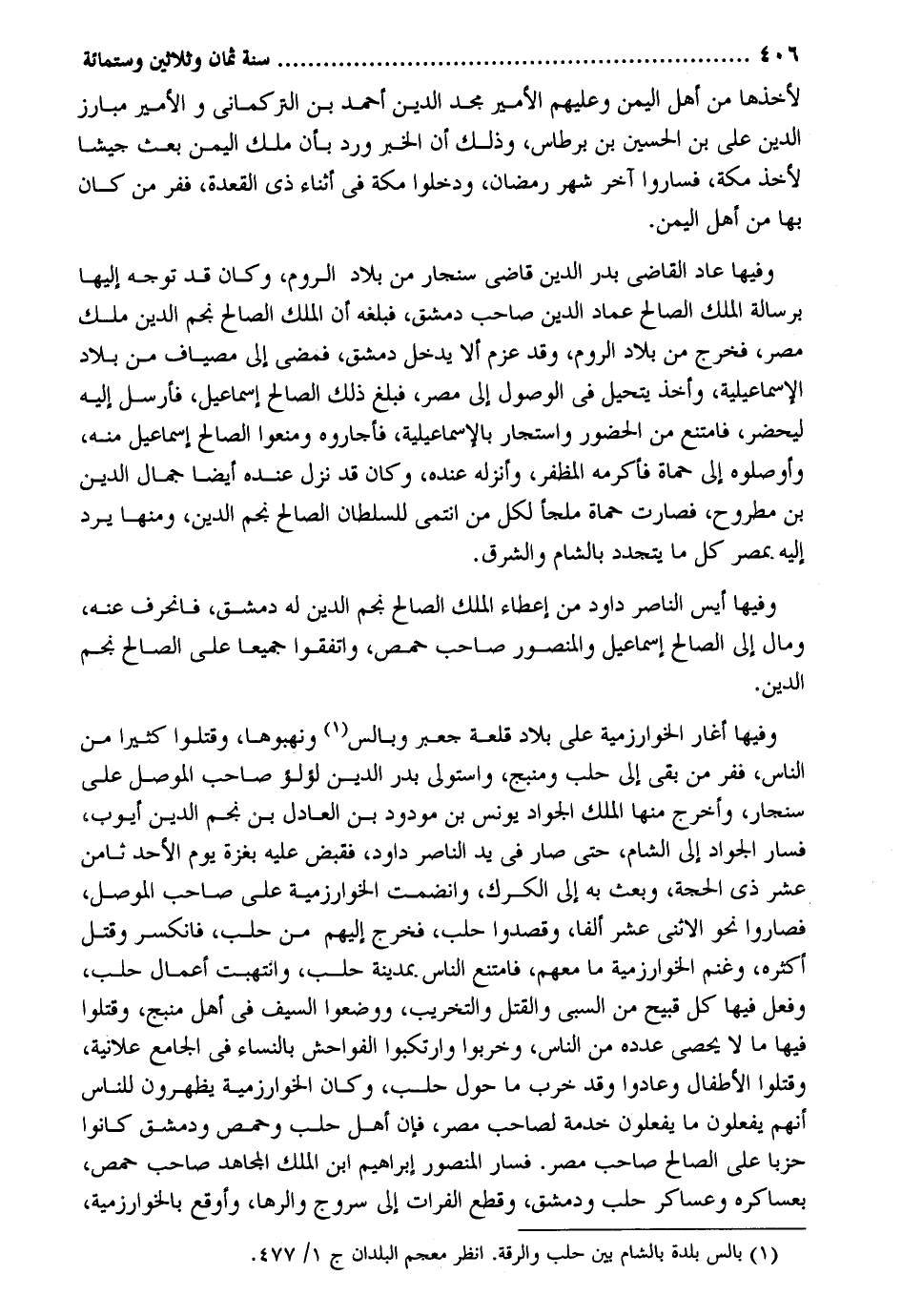 لأخذها من أهل الْيمن وَعَلَيْهِم الْأَمِير مجد الدّين بن أَحْمد بن التركماني والأمير مبارز الدّين عَليّ بن الْحسن بن برطاس وَذَلِكَ أَن الْخَيْر ورد بِأَن ملك الْيمن بعث جَيْشًا لأخذ مَكَّة فَسَارُوا آخر شهر رَمَضَان ودخلوا مَكَّة فِي أثْنَاء ذِي الْقعدَة ففر من كَانَ بهَا من أهل الْيمن. وفيهَا عَاد القَاضِي بدر الدّين قَاضِي سنجار من بِلَاد الرّوم وَكَانَ قد توجه إِلَيْهَا برسالة الْملك الصَّالح عماد الدّين صَاحب دمشق فَبَلغهُ أَن الْملك الصَّالح نجم الدّين ملك مصر فَخرج من بِلَاد الرّوم وَقد عزم أَلا يدْخل دمشق فَمضى إِلَى مصياف من بِلَاد الإسماعيلية وَأخذ يتحيل فِي الْوُصُول إِلَى مصر فَبلغ ذَلِك الصَّالح إِسْمَاعِيل فَأرْسل إِلَيْهِ ليحضر فَامْتنعَ من الْحُضُور وأستجار بالإسماعيلية فأجاروه وَمنعُوا الصَّالح إِسْمَاعِيل مِنْهُ وأوصلوه إِلَى حماة فَأكْرمه المظفر وأنزله عِنْده وَكَانَ قد نزل عِنْده أَيْضا جمال الدّين بن مطروح فَصَارَت حماة ملْجأ لكل من انْتَمَى للسُّلْطَان الصَّالح نجم الدّين وَمِنْهَا يرد إِلَيْهِ عصر كل مَا يَتَجَدَّد بِالشَّام والشرق. وفيهَا أيس النَّاصِر دَاوُد من إِعْطَاء الْملك الصَّالح نجم الدّين لَهُ دمشق فانحرف عَنهُ وَمَال إِلَى الصَّالح إِسْمَاعِيل والمنصور صَاحب حمص وَاتَّفَقُوا جَمِيعًا على الصَّالح نجم الدّين. وفيهَا أغار الخوارزمية على بِلَاد قلعة جعبر وبالس ونهبوها وَقتلُوا كثيرا من النَّاس ففر من بَقِي إِلَى حلب ومنبج وَاسْتولى بدر الدّين لُؤْلُؤ صَاحب الْموصل على شجار وَأخرج مِنْهَا الْملك الْجواد يُونُس بن مودود بن الْعَادِل بن نجم الدّين أَيُّوب فَسَار الْجواد إِلَى الشَّام حَتَّى صَار فِي يَد النَّاصِر دَاوُد فَقبض عَلَيْهِ بغزة يَوْم الْأَحَد ثامن عشر ذِي الْحجَّة وَبعث بِهِ إِلَى الكرك وانضمت الخوارزمية على صَاحب الْموصل فصاروا نَحْو الاثْنَي عشر ألفا وقصدوا حلب فَخرج إِلَيْهِم من حلب فانكسر وَقتل أَكْثَره وغنم الخوارزمية مَا مَعَهم فَامْتنعَ النَّاس بِمَدِينَة حلب وانتهبت أَعمال حلب وَفعل فِيهَا كل قَبِيح من السَّبي وَالْقَتْل والتخريب وَوَضَعُوا السَّيْف فِي أهل منبج وَقتلُوا فِيهَا مَا لَا يُحْصى عدده من النَّاس وخربوا وارتكبوا الْفَوَاحِش بِالنسَاء فِي الْجَامِع عَلَانيَة وَقتلُوا الْأَطْفَال وعادوا وَقد خرب مَا حول حلب وَكَانَ الخوارزمية يظهرون للنَّاس أَنهم يَفْعَلُونَ مَا يَفْعَلُونَ خدمَة لصَاحب مصر فَإِن أهل حلب وحمص ودمشق كَانُوا حزباً على الصَّالح صَاحب مصر. فَسَار الْمَنْصُور إِبْرَاهِيم ابْن الْملك الْمُجَاهِد صَاحب حمص عساكره وعساكر حلب ودمشق وَقطع الْفُرَات إِلَى سروج والرها وأوقع بالخوارزمية