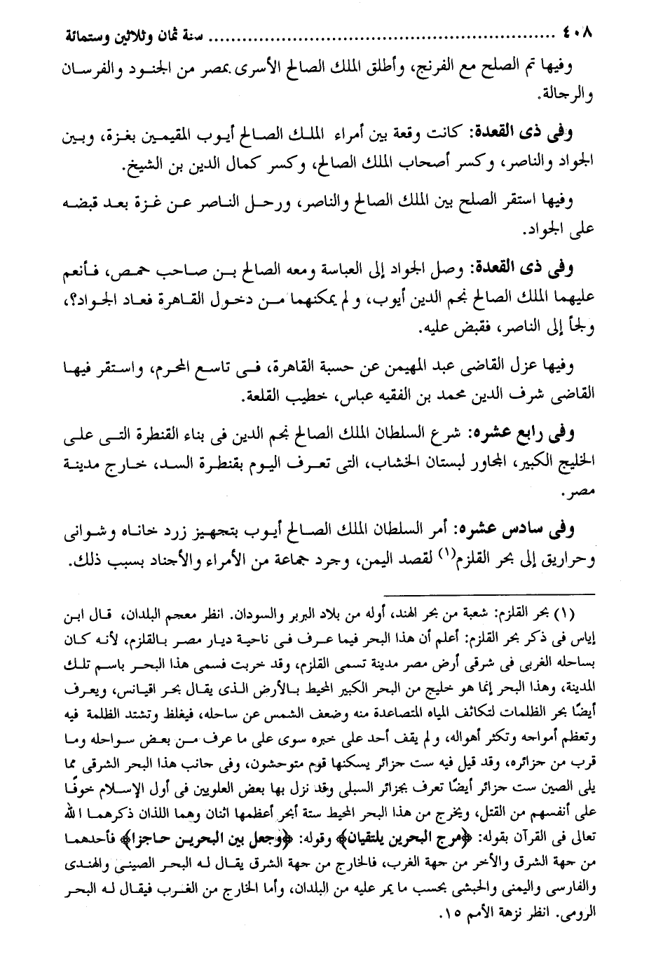 وفيهَا تمّ الصُّلْح مَعَ الفرنج وَأطلق الْملك الصَّالح الأسرى بِمصْر من الْجنُود والفرسان والرجالة. وَفِي ذِي الْقعدَة: كَانَت وقْعَة بَين أُمَرَاء الْملك الصَّالح أَيُّوب المقيمين بغزة وَبَين الْجواد والناصر وَكسر أَصْحَاب الْملك الصَّالح وَكسر كَمَال الدّين بن الشَّيْخ. وفيهَا اسْتَقر الصُّلْح بَين الْملك الصَّالح والناصر ورحل النَّاصِر عَن غَزَّة بعد قَبضه على الْجواد. وَفِي ذِي الْقعدَة: وصل الْجواد إِلَى العباسة وَمَعَهُ الصَّالح بن صَاحب حمص فأنعم عَلَيْهِمَا الْملك الصَّالح نجم الدّين أَيُّوب وَلم يمكنهما من دُخُول الْقَاهِرَة فَعَاد الْجواد ولجأ إِلَى النَّاصِر فَقبض عَلَيْهِ. وفيهَا عزل القَاضِي عبد الْمُهَيْمِن عَن حسبَة الْقَاهِرَة فِي تَاسِع الْمحرم وَاسْتقر فِيهَا القَاضِي شرف الدّين مُحَمَّد بن الْفَقِيه عَبَّاس خطيب القلعة. وَفِي رَابِع عشره: شرع السُّلْطَان الْملك الصَّالح نجم الدّين فِي بِنَاء القنطرة الَّتِي على الخليج الْكَبِير المجاور لبستان الخشاب الَّتِي تعرف الْيَوْم بقنطرة السد خَارج مَدِينَة مصر. وَفِي سادس عشره أَمر السُّلْطَان الْملك الصَّالح أَيُّوب بتجهيز زرد خاناه وشواني وحراريق إِلَى بَحر القلزم لقصد الْيمن وجرد جمَاعَة من الْأُمَرَاء والأجناد بِسَبَب ذَلِك.