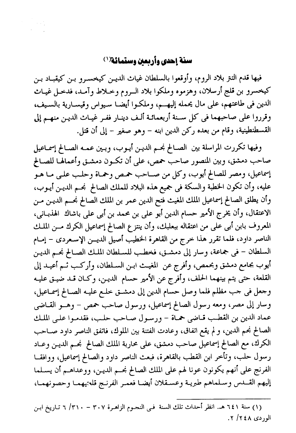 سنة إِحْدَى وَأَرْبَعين وسِتمِائَة فِيهَا قدم التتر بِلَاد الرّوم وأوقعوا بالسلطان غياث الدّين كيخسرو بن كيقباد بن يخسرو بن قلج أرسلان وهزموه وملكوا بِلَاد الرّوم وخلاط وآمد فَدخل غياث الدّين فِي طاعتهم على مَال يحملهُ إِلَيْهِم وملكوا أَيْضا سيواس وقيسارية بِالسَّيْفِ وقرروا على صَاحبهمَا فِي كل سنة أَرْبَعمِائَة ألف دِينَار ففر غياث الدّين مِنْهُم إِلَى الْقُسْطَنْطِينِيَّة وَقَامَ من بعده ركن الدّين ابْنه - وَهُوَ صَغِير - إِلَى أَن قتل. وفيهَا تَكَرَّرت المراسلة بَين الصَّالح نجم الدّين أَيُّوب وَبَين عَمه الصَّالح إِسْمَاعِيل صَاحب دمشق وَبَين الْمَنْصُور صَاحب حمص على أَن تكون دمشق وأعمالها للصالح إِسْمَاعِيل ومصر للصالح أَيُّوب وكل من صَاحب حمص وحماة وحلب على مَا هُوَ عَلَيْهِ وَأَن تكون الخطة وَالسِّكَّة فِي جَمِيع هَذِه الْبِلَاد للْملك الصَّالح نجم الدّين أَيُّوب وَأَن يُطلق الصَّالح إِسْمَاعِيل الْملك المغيث فتح الدّين عمر بن الْملك الصَّالح نجم الدّين من الاعتقال وَأَن يخرج الْأَمِير حسام الدّين أَبُو عَليّ بن مُحَمَّد بن أبي عَليّ باشاك الهذباني الْمَعْرُوف بِابْن أبي عَليّ من اعتقاله ببعلبك وَأَن ينتزع الصَّالح إِسْمَاعِيل الكرك من الْملك النَّاصِر دَاوُد فَلَمَّا تقرر هَذَا خرج من الْقَاهِرَة الْخطب أصيل الدّين الإسعردي - إِمَام السُّلْطَان - فِي جمَاعَة وَسَار إِلَى دمشق فَخَطب للسُّلْطَان الْملك الصَّالح نجم الدّين أَيُّوب بِجَامِع دمشق وبحمص وَأَفْرج عَن المغيث ابْن السُّلْطَان وأركب ثمَّ أُعِيد إِلَى القلعة حَتَّى يتم بَينهمَا الْحلف وَأَفْرج عَن الْأَمِير حسام الدّين وَكَانَ قد ضيق عَلَيْهِ وَجعل فِي جب مظلم فَلَمَّا وصل حسام الدّين إِلَى دمشق خلع عَلَيْهِ الصَّالح إِسْمَاعِيل وَسَار إِلَى مصر وَمَعَهُ رَسُول الصَّالح إِسْمَاعِيل وَرَسُول صَاحب حمص - وَهُوَ القَاضِي عماد الدّين بن القطب قَاضِي حماة - وَرَسُول صَاحب حلب فقدموا على الْملك الصَّالح نجم الدّين وَلم يَقع اتِّفَاق وعادت الْفِتْنَة بَين الْمُلُوك فاتفق النَّاصِر دَاوُد صَاحب الكرك مَعَ الصَّالح إِسْمَاعِيل صَاحب دمشق على محاربة الْملك الصَّالح نجم الدّين وَعَاد رَسُول حلب وَتَأَخر ابْن القطب بِالْقَاهِرَةِ فَبعث النَّاصِر دَاوُد والصالح إِسْمَاعِيل ووافقا الفرنج على أَنهم يكونُونَ عوناً لَهُم على الْملك الصَّالح نجم الدّين ووعداهم أَن يسلما إِلَيْهِم الْقُدس وسلماهم طبرية وعسقلان أَيْضا فعمر الفرنج قلعتيهما وحصونهما
