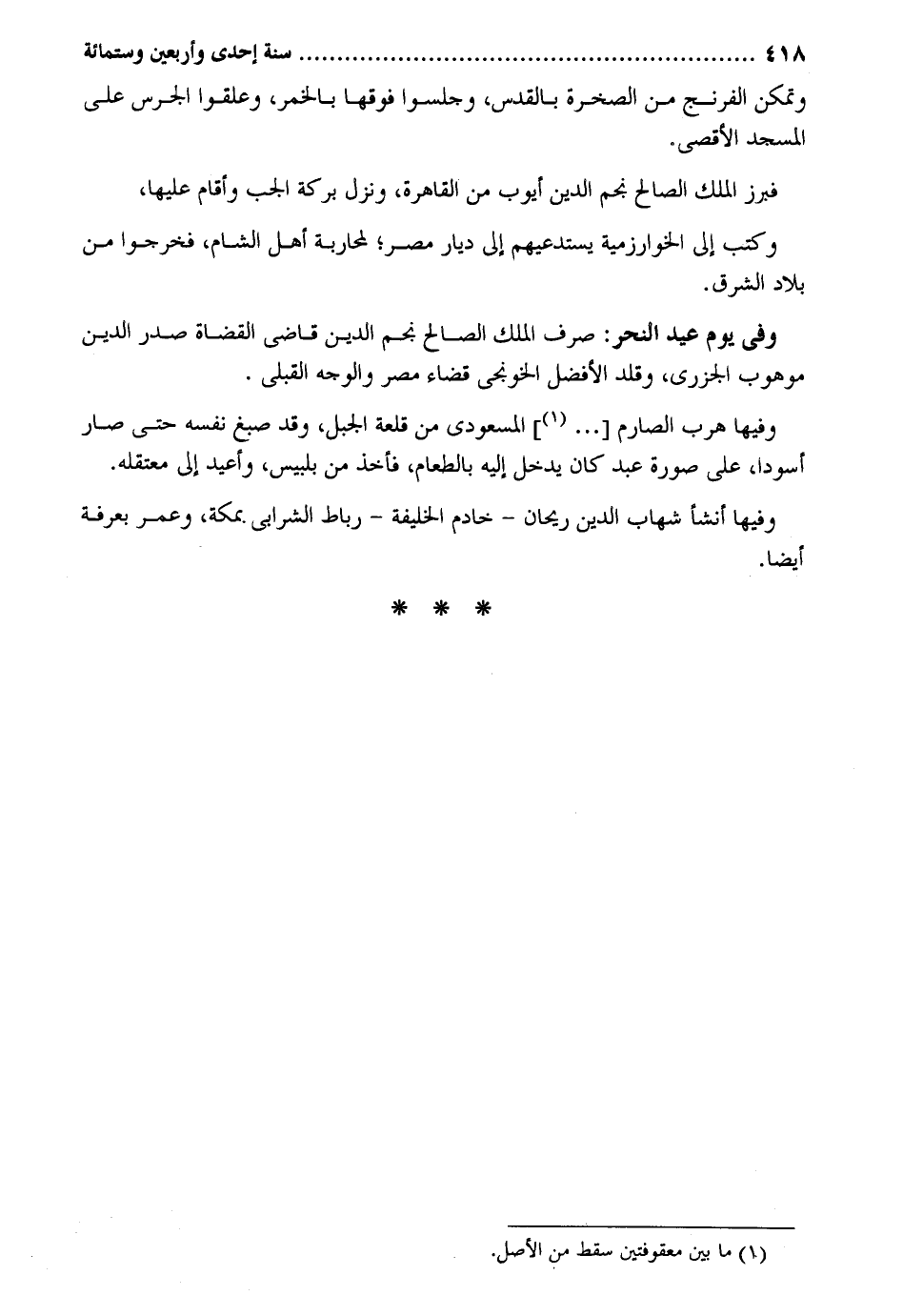 وَتمكن الفرنج من الصَّخْرَة بالقدس وجلسوا فَوْقهَا بِالْخمرِ وعلقوا الجرس على الْمَسْجِد الْأَقْصَى. فبرز الْملك الصَّالح نجم الدّين أَيُّوب من الْقَاهِرَة وَنزل بركَة الْجب وَأقَام عَلَيْهَا وَكتب إِلَى الخوارزمية يستدعيهم إِلَى ديار مصرة لمحاربة أهل الشَّام فَخَرجُوا من بِلَاد الشرق. وَفِي يَوْم عيد النَّحْر: صرف الْملك الصَّالح نجم الدّين قَاضِي الْقُضَاة صدر الدّين موهوب الْجَزرِي وقلد الْأَفْضَل الخونجي قَضَاء مصر وَالْوَجْه القبلي. وفيهَا هرب الصارم المَسْعُودِيّ من قلعة الْجَبَل وَقد صبغ نَفسه حَتَّى صَار أسوداً على صُورَة عبد كَانَ يدْخل إِلَيْهِ بِالطَّعَامِ فَأخذ من بلبيس وأعيد إِلَى معتقله. وفيهَا أنشأ شهَاب الدّين ريحَان - خَادِم الْخَلِيفَة - رِبَاط الشرابي بِمَكَّة وَعمر بِعَرَفَة أَيْضا.