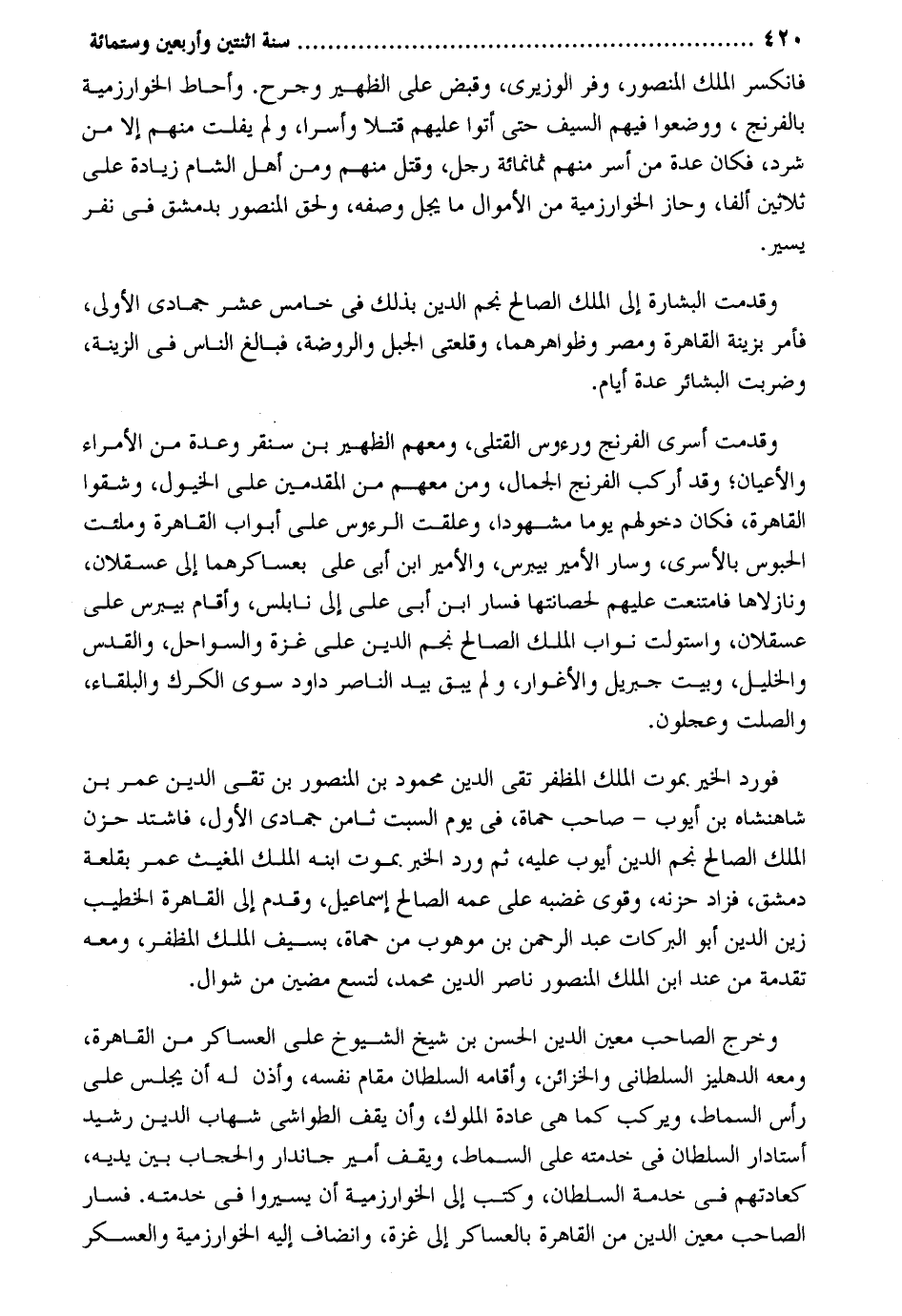 فانكسر الْملك الْمَنْصُور وفر الوزيري وَقبض على الظهير وجرح. وأحاط الخوارزمية بالفرنج وَوَضَعُوا فيهم السَّيْف حَتَّى أَتَوا عَلَيْهِم قتلا وأسراً وَلم يفلت مِنْهُم إِلَّا من شرد فَكَانَ عدَّة من أسر مِنْهُم ثَمَانمِائَة رجل وَقتل مِنْهُم وَمن أهل الشَّام زِيَادَة على ثَلَاثِينَ ألفا وَحَازَ الخوارزمية من الْأَمْوَال مَا يجل وَصفه وَلحق الْمَنْصُور بِدِمَشْق فِي نفر يسير. وقدمت الْبشَارَة إِلَى الْملك الصَّالح نجم الدّين بذلك فِي خَامِس عشر جُمَادَى الأولى فَأمر بزينة الْقَاهِرَة ومصر وظواهرهما وقلعتي الْجَبَل وَالرَّوْضَة فَبَالغ النَّاس فِي الزِّينَة وَضربت البشائر عدَّة أَيَّام. وقدمت أسرى الفرنج ورءوس الْقَتْلَى وَمَعَهُمْ الظهير بن سنقر وعدة من الْأُمَرَاء والأعيان وَقد أركب الفرنج الْجمال وَمن مَعَهم من المقدمين على الْخُيُول وشقوا الْقَاهِرَة فَكَانَ دُخُولهمْ يَوْمًا مشهوداً وعلقت الرُّءُوس على أَبْوَاب الْقَاهِرَة وملئت الحبوس بالأسرى وَسَار الْأَمِير بيبرس والأمير ابْن أبي عَليّ بعساكرهما إِلَى عسقلان ونازلاها فامتنعت عَلَيْهِم لحصانتها فَسَار ابْن أبي عَليّ إِلَى نابلس وَأقَام بيبرس على عسقلان واستولت نواب الْملك الصَّالح نجم الدّين على غَزَّة والسواحل والقدس والخليل وَبَيت جِبْرِيل والأغوار وَلم يبْق بيد النَّاصِر دَاوُد سوى الكرك والملقاء والصلت وعجلون. فورد الْخَيْر بِمَوْت الْملك المظفر تَقِيّ الدّين مَحْمُود بن الْمَنْصُور بن تَقِيّ الدّين عمر بن شاهنشاه بن أَيُّوب صَاحب حماة فِي يَوْم السبت ثامن جُمَادَى الأول فَاشْتَدَّ حزن الْملك الصَّالح نجم الدّين أَيُّوب عَلَيْهِ ثمَّ ورد الْخَبَر بِمَوْت ابْنه الْملك المغيث عمر بقلعة دمشق فَزَاد حزنه وَقَوي غَضَبه على عَمه الصَّالح إِسْمَاعِيل وَقدم إِلَى الْقَاهِرَة الْخَطِيب زين الدّين أَبُو البركات عبد الرَّحْمَن بن موهوب من حماة بِسيف الْملك المظفر وَمَعَهُ تقدمة من عِنْد ابْن الْملك الْمَنْصُور نَاصِر الدّين مُحَمَّد لتسْع مضين من شَوَّال. وَخرج الصاحب معِين الدّين الْحسن بن شيخ الشُّيُوخ على العساكر من الْقَاهِرَة وَمَعَهُ الدهليز السلطاني والخزائن وأقامه السُّلْطَان مقَام نَفسه وَأذن لَهُ أَن يجلس على رَأس السماط ويركب كَمَا هِيَ عَادَة الْمُلُوك وَأَن يقف الطواشي شهَاب الدّين رشيد أستادار السُّلْطَان فِي خدمته على السماط وَيقف أَمِير جاندار والحجاب بَين يَدَيْهِ كعادتهم فِي خدمَة السُّلْطَان وَكتب إِلَى الخوارزمية أَن يَسِيرُوا فِي خدمته. فَسَار الصاحب معِين الدّين من الْقَاهِرَة بالعساكر إِلَى غَزَّة وانضاف إِلَيْهِ الخوارزمية والعسكر