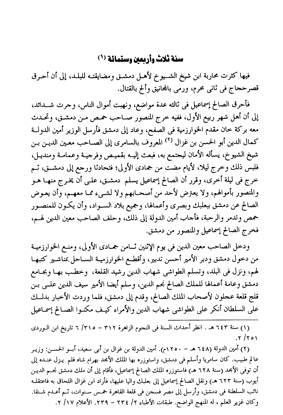 سنة ثَالِث وَأَرْبَعين وسِتمِائَة فِيهَا كثرت محاربة ابْن شيخ الشُّيُوخ لأهل دمشق ومضايقته للبلد إِلَى أَن أحرق قصر حجاج فِي ثَانِي محرم وَرمي بالمجانيق وألح بِالْقِتَالِ. فَأحرق الصَّالح إِسْمَاعِيل فِي ثالثه عدَّة مَوَاضِع ونهبت أَمْوَال النَّاس وَجَرت شَدَائِد إِلَى أَن أهل شهر ربيع الأول فَفِيهِ خرج الْمَنْصُور صَاحب حمص من دمشق وتحدث مَعَه بركَة خَان مقدم الخوارزمية فِي الصفح وَعَاد إِلَى دمشق فَأرْسل الْوَزير أَمِين الدولة كَمَال الدّين أَبُو الْحسن بن غزال الْمَعْرُوف بالسامري إِلَى الصاحب معِين الدّين بن شيخ الشُّيُوخ يسْأَله الْأمان ليجتمع بِهِ فَبعث إِلَيْهِ بقميص وفرجية وعمامة ومنديل فَلبس ذَلِك وَخرج لَيْلًا لأيام مَضَت من جُمَادَى الأولى فتحادثا وَرجع إِلَى دمشق ثمَّ خرج فِي لَيْلَة أُخْرَى وَقرر أَن الصَّالح إِسْمَاعِيل يسلم دمشق على أَن يخرج مِنْهَا هُوَ والمنصور بِأَمْوَالِهِمْ وَلَا يعرض لأحد من أَصْحَابهم وَلَا لشَيْء مِمَّا مَعَهم وَأَن يعوض الصَّالح عَن دمشق ببعلبك وَبصرى وأعمالها وَجَمِيع بِلَاد السوَاد وَأَن يكون للمنصور حمص وتدمر والرحبة فَأجَاب أَمِين الدولة إِلَى ذَلِك وَحلف الصاحب معِين الدّين لَهُم فَخرج الصَّالح إِسْمَاعِيل والمنصور من دمشق. وَدخل الصاحب معِين الدّين فِي يَوْم الِاثْنَيْنِ ثامن جُمَادَى الأولى وَمنع الخوارزمية من دُخُول دمشق ودبر الْأَمِير أحسن تَدْبِير وأقطع الخوارزمية السَّاحِل بمناشير كتبهَا لَهُم وَنزل فِي الْبَلَد وتسلم الطواشي شهَاب الدّين رشيد القلعة وخطب بهَا وبجامع دمشق وَعَامة أَعمالهَا للْملك الصَّالح نجم الدّين وَسلم أَيْضا الْأَمِير سيف الدّين عَليّ بن قلج قلعة عجلون لأَصْحَاب الْملك الصَّالح وَقدم إِلَى دمشق فَلَمَّا وَردت الْأَخْبَار بذلك على السُّلْطَان أنكر على الطواشي شهَاب الدّين والأمراء كَيفَ مكنوا الصَّالح إِسْمَاعِيل