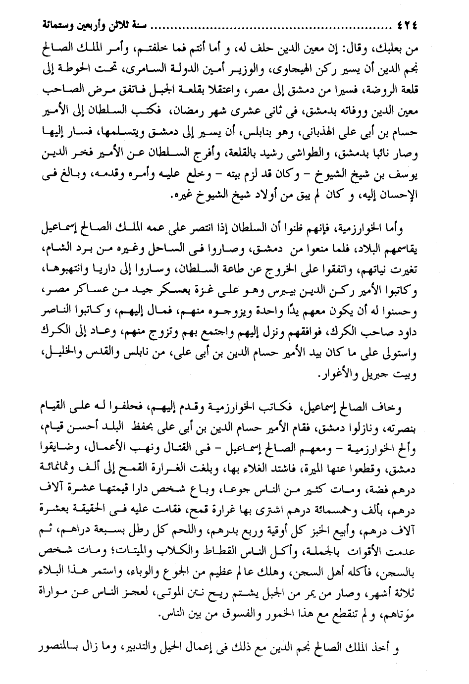 من بعلبك وَقَالَ: إِن معِين الدّين حلف لَهُ وَأما أَنْتُم فَمَا خَلفْتُمْ وَأمر الْملك الصَّالح نجم الدّين أَن يسير ركن الهيجاوي والوزير أَمِين الدولة السامري تَحت الحوطة إِلَى قلعة الرَّوْضَة فسيرا من دمشق إِلَى مصر واعتقلا بقلعة الْجَبَل فاتفق مرض الصاحب معِين الدّين ووفاته بِدِمَشْق فِي ثَانِي عشري شهر رَمَضَان فَكتب السُّلْطَان إِلَى الْأَمِير حسام بن أبي عَليّ الهذباني وَهُوَ بنابلس أَن يسير إِلَى دمشق ويتسلمها فَسَار إِلَيْهَا وَصَارَ نَائِبا بِدِمَشْق والطواشي رشيد بالقلعة وَأَفْرج السُّلْطَان عَن الْأَمِير فَخر الدّين يُوسُف بن شيخ الشُّيُوخ - وَكَانَ قد لزم بَيته - وخلع عَلَيْهِ وَأمره وَقدمه وَبَالغ فِي الْإِحْسَان إِلَيْهِ وَكَانَ لم يبْق من أَوْلَاد شيخ الشُّيُوخ غَيره. وَأما الخوارزمية فَإِنَّهُم ظنُّوا أَن السُّلْطَان إِذا انتصر على عَمه الْملك الصَّالح إِسْمَاعِيل يقاسمهم الْبِلَاد فَلَمَّا منعُوا من دمشق وصاروا فِي السَّاحِل وَغَيره من برد الشَّام تَغَيَّرت نياتهم وَاتَّفَقُوا على الْخُرُوج عَن طَاعَة السُّلْطَان وَسَارُوا إِلَى داريا وانتهبوها وكاتبوا الْأَمِير ركن الدّين بيبرس وَهُوَ على غَزَّة بعسكر جيد من عَسَاكِر مصر وحسنوا لَهُ أَن يكون مَعَهم يدا وَاحِدَة ويزوجوه مِنْهُم فَمَال إِلَيْهِم وكاتبوا النَّاصِر دَاوُد صَاحب الكرك فوافقهم وَنزل إِلَيْهِم وَاجْتمعَ بهم وَتزَوج مِنْهُم وَعَاد إِلَى الكرك وَاسْتولى على مَا كَانَ بيد الْأَمِير حسام الدّين بن أبي عَليّ من نابلس والقدس والخليل وَبَيت جِبْرِيل والأغوار. وَخَافَ الصَّالح إِسْمَاعِيل فكاتب الخوارزمية وَقدم إِلَيْهِم فَحَلَفُوا لَهُ على الْقيام بنصرته ونازلوا دمشق فَقَامَ الْأَمِير حسام الدّين بن أبي عَليّ بِحِفْظ الْبَلَد أحسن قيام وألح الخوارزمية - وَمَعَهُمْ الصَّالح إِسْمَاعِيل - فِي الْقِتَال وَنهب الْأَعْمَال وضايقوا دمشق وَقَطعُوا عَنْهَا الْميرَة فَاشْتَدَّ الغلاء بهَا وَبَلغت الغرارة الْقَمْح إِلَى ألف وَثَمَانمِائَة دِرْهَم فضَّة وَمَات كثير من النَّاس جوعا وَبَاعَ شخص دَارا قيمتهَا عشرَة آلَاف دِرْهَم بِأَلف وَخَمْسمِائة دِرْهَم اشْترِي بهَا غرارة قَمح فَقَامَتْ عَلَيْهِ فِي الْحَقِيقَة بِعشْرَة آلَاف دِرْهَم وأبيع الْخبز كل أُوقِيَّة وَربع بدرهم وَاللَّحم كل رَطْل بسبعة دَرَاهِم ثمَّ عدمت الأقوات بِالْجُمْلَةِ وَأكل النَّاس القطط وَالْكلاب وَالْمَيتَات وَمَات شخص بالسجن فَأَكله أهل السجْن وَهلك عَالم عَظِيم من الْجُوع والوباء وَاسْتمرّ هَذَا الْبلَاء ثَلَاثَة أشهر وَصَارَ من يمر من الْجَبَل يشْتم ريح نَتن الْمَوْتَى لعجز النَّاس عَن مواراة موتاهم وَلم تَنْقَطِع مَعَ هَذَا الْخُمُور والفسوق من بَين النَّاس. وَأخذ الْملك الصَّالح نجم الدّين مَعَ ذَلِك فِي أَعمال الْحِيَل وَالتَّدْبِير وَمَا زَالَ بالمنصور