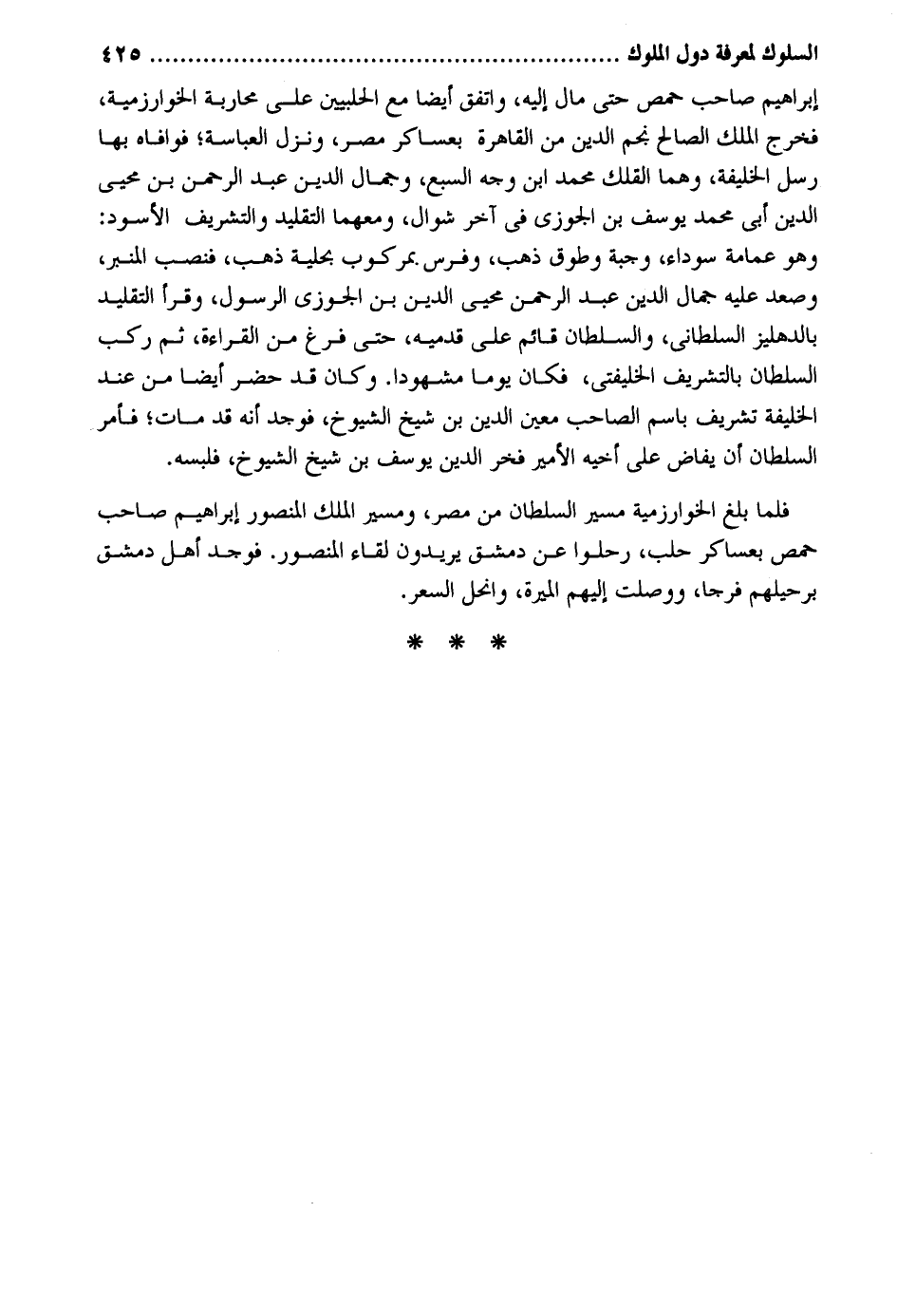 إِبْرَاهِيم صَاحب حمص حَتَّى مَال إِلَيْهِ وَاتفقَ أَيْضا مَعَ الحلبيين على محاربة الخوارزمية فَخرج الْملك الصَّالح نجم الدّين من الْقَاهِرَة بعساكر مصر وَنزل العباسة فوافاه بهَا رسل الْخَلِيفَة وهما الْملك مُحَمَّد ابْن وَجه السَّبع وجمال الدّين عبد الرَّحْمَن بن محيي الدّين أبي مُحَمَّد يُوسُف بن الْجَوْزِيّ فِي آخر شَوَّال ومعهما التَّقْلِيد والتشريف الْأسود: وَهُوَ عِمَامَة سَوْدَاء وجبة وطوق ذهب وَفرس بمركوب بحلية ذهب فنصب الْمِنْبَر وَصعد عَلَيْهِ جمال الدّين عبد الرَّحْمَن محيي الدّين بن الْجَوْزِيّ الرَّسُول وَقَرَأَ التَّقْلِيد بالدهليز السلطاني وَالسُّلْطَان قَائِم على قَدَمَيْهِ حَتَّى فرغ من الْقِرَاءَة ثمَّ ركب السُّلْطَان بالتشريف الخليفتي فَكَانَ يَوْمًا مشهوداً. وَكَانَ قد حضر أَيْضا من عِنْد الْخَلِيفَة تشريف باسم الصاحب معِين الدّين بن شيخ الشُّيُوخ فَوجدَ أَنه قد مَاتَ فَأمر السُّلْطَان أَن يفاض على أَخِيه الْأَمِير فَخر الدّين يُوسُف بن شيخ الشُّيُوخ فلبسه. فَلَمَّا بلغ الخوارزمية مسير السُّلْطَان من مصر ومسير الْملك الْمَنْصُور إِبْرَاهِيم صَاحب حمص بعساكر حلب رحلوا عَن دمشق يُرِيدُونَ لِقَاء الْمَنْصُور. فَوجدَ أهل دمشق برحيلهم فرجا ووصلت إِلَيْهِم الْميرَة وانحل السّعر.