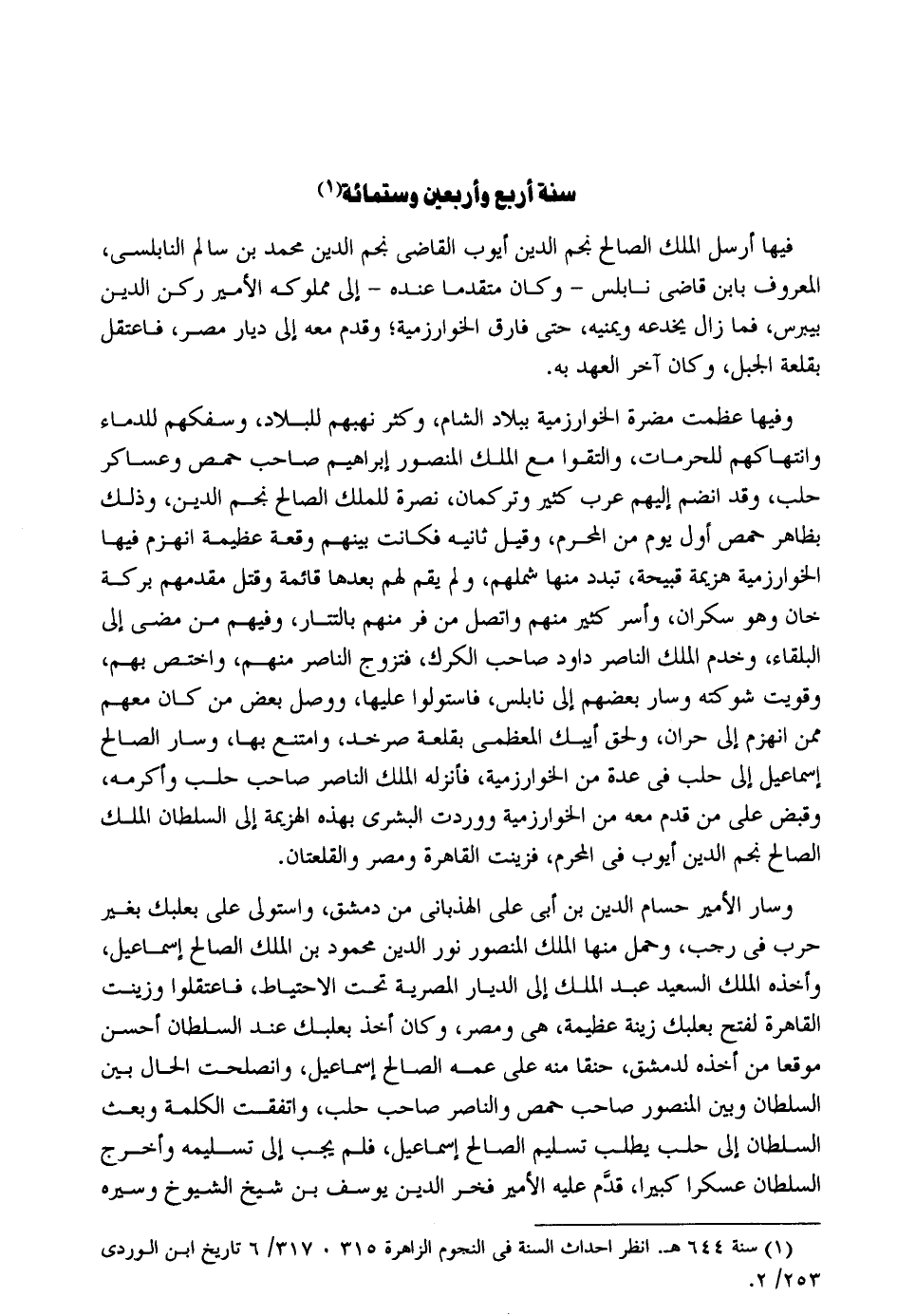 فِيهَا أرسل الْملك الصَّالح نجم الدّين أَيُّوب القَاضِي نجم الدّين مُحَمَّد بن سَالم النابلسي الْمَعْرُوف بِابْن قَاضِي نابلس - وَكَانَ مُتَقَدما عِنْده - إِلَى مَمْلُوكه الْأَمِير ركن الدّين بييرس فَمَا زَالَ يخدعه ويمنيه حَتَّى فَارق الخوارزمية وَقدم مَعَه إِلَى ديار مصر فاعتقل بقلعة الْجَبَل وَكَانَ آخر الْعَهْد وفيهَا عظمت مضرَّة الخوارزمية بِبِلَاد الشَّام وَكثر نهبهم للبلاد وسفكهم للدماء وانتهاكهم للحرمات والتقوا مَعَ الْملك الْمَنْصُور إِبْرَاهِيم صَاحب حمص وعساكر حلب وَقد انْضَمَّ إِلَيْهِم عرب كثير وتركمان نصْرَة للْملك الصَّالح نجم الدّين وَذَلِكَ بِظَاهِر حمص أول يَوْم من الْمحرم وَقيل ثَانِيه فَكَانَت بَينهم وقْعَة عَظِيمَة انهزم فِيهَا الخوارزمية هزيمَة قبيحة تبدد مِنْهَا شملهم وَلم يقم لَهُم بعْدهَا قَائِمَة وَقتل مقدمهم بركَة خَان وَهُوَ سَكرَان وَأسر كثير مِنْهُم واتصل من فر مِنْهُم بالتتار وَفِيهِمْ من مضى إِلَى البلقاي وخدم الْملك النَّاصِر دَاوُد صَاحب الكرك فَتزَوج النَّاصِر مِنْهُم واختص بهم وقويت شوكته وَسَار بَعضهم إِلَى نابلس فاستولوا عَلَيْهَا وَوصل بعض من كَانَ مَعَهم مِمَّن انهزم إِلَى حران وَلحق أيبك المعظمي بقلعة صرخد وَامْتنع بهَا وَسَار الصَّالح إِسْمَاعِيل إِلَى حلب فِي عدَّة من الخوارزمية فأنزله الْملك النَّاصِر صَاحب حلب وأكرمه وَقبض على من قدم مَعَه من الخوارزمية ووردت الْبُشْرَى بِهَذِهِ الْهَزِيمَة إِلَى السُّلْطَان الْملك الصَّالح نجم الدّين أَيُّوب فِي الْمحرم فزينت الْقَاهِرَة ومصر والقلعتان. وَسَار الْأَمِير حسام الدّين بن أبي عَليّ الهذباني من دمشق وَاسْتولى على بعلبك بِغَيْر حَرْب فِي رَجَب وَحمل مِنْهَا الْملك الْمَنْصُور نور الدّين مَحْمُود بن الْملك الصَّالح إِسْمَاعِيل وَأَخذه الْملك السعيد عبد الْملك إِلَى الديار المصرية تَحت الِاحْتِيَاط فاعتقلوا وزينت الْقَاهِرَة لفتح بعلبك زِينَة عَظِيمَة هِيَ ومصر وَكَانَ أَخذ بعلبك عِنْد السُّلْطَان أحسن موقعاً من أَخذه لدمشق حنقا مِنْهُ على عَمه الصَّالح إِسْمَاعِيل وانصلحت الْحَال بَين السُّلْطَان وَبَين الْمَنْصُور صَاحب حمص والناصر صَاحب حلب واتفقت الْكَلِمَة وَبعث السُّلْطَان إِلَى حلب يطْلب تَسْلِيم الصَّالح إِسْمَاعِيل فَلم يجب إِلَى تَسْلِيمه وَأخرج السُّلْطَان عسكراً كَبِيرا قدم عَلَيْهِ الْأَمِير فَخر الدّين يُوسُف بن شيخ الشُّيُوخ وسيره