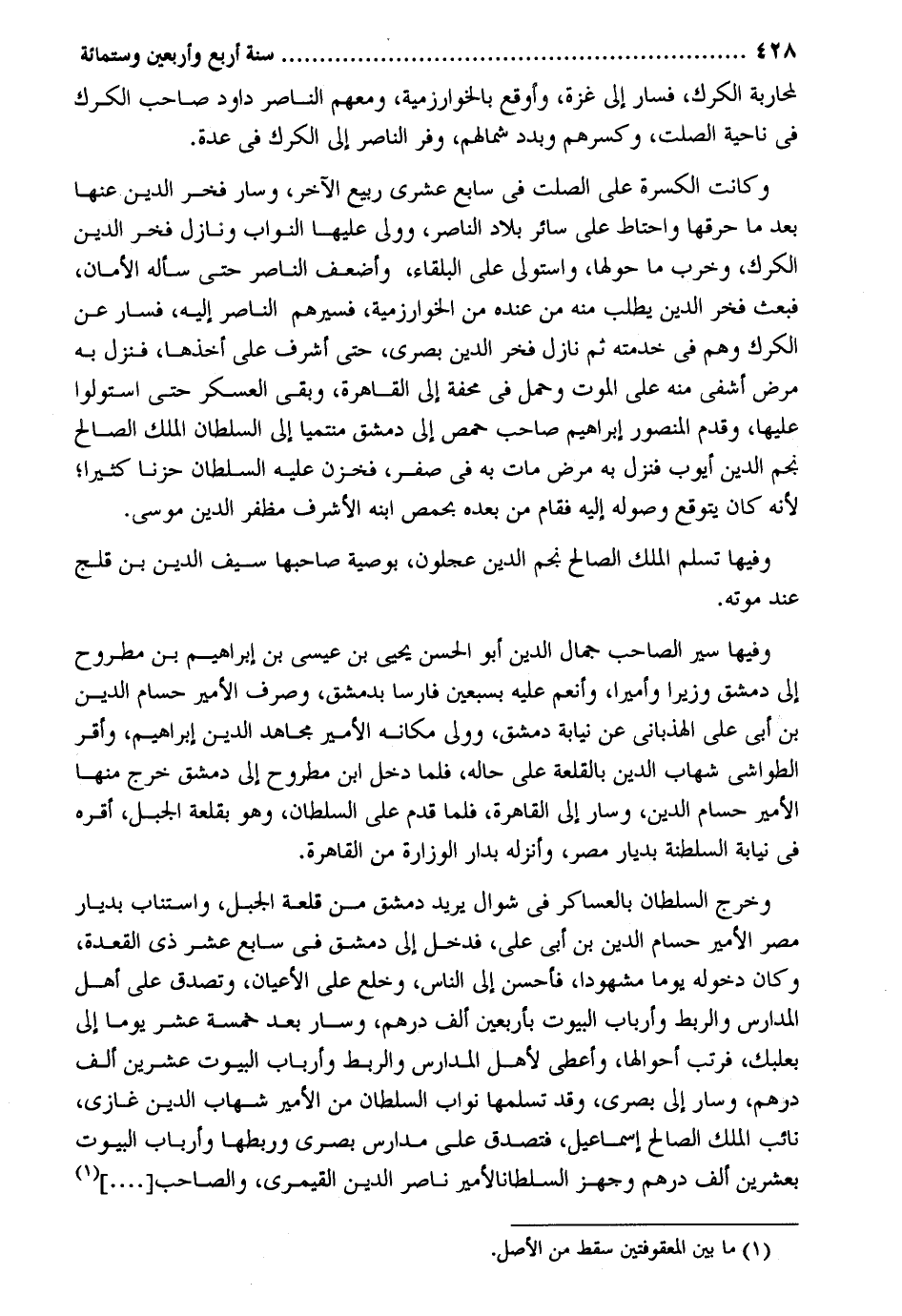 لمحاربة الكرك فَسَار إِلَى غَزَّة وأوقع بالخوارزمية وَمَعَهُمْ النَّاصِر دَاوُد صَاحب الكرك فِي نَاحيَة الصَّلْت وكسرهم وبدد شمالهم وفر النَّاصِر إِلَى الكرك فِي عدَّة. وَكَانَت الكسرة على الصَّلْت فِي سَابِع عشري ربيع الآخر وَسَار فَخر الدّين عَنْهَا بعد مَا حرقها واحتاط على سَائِر بِلَاد النَّاصِر وَولي عَلَيْهَا النواب ونازل فَخر الدّين الكرك وَخرب مَا حولهَا وَاسْتولى على البلقاء وأضعف النَّاصِر حَتَّى سَأَلَهُ الْأمان فَبعث فَخر الدّين يطْلب مِنْهُ من عِنْده من الخوارزمية فسيرهم النَّاصِر إِلَيْهِ فَسَار عَن الكرك وهم فِي خدمته ثمَّ نَازل فَخر الدّين بصرى حَتَّى أشرد على أَخذهَا فَنزل بِهِ مرض أشفى مِنْهُ على الْمَوْت وَحمل فِي محفة إِلَى الْقَاهِرَة وَبَقِي الْعَسْكَر حَتَّى استولوا عَلَيْهَا وَقدم الْمَنْصُور إِبْرَاهِيم صَاحب حمص إِلَى دمشق منتمياً إِلَى السُّلْطَان الْملك الصَّالح نجم الدّين أَيُّوب فَنزل بِهِ مرض مَاتَ بِهِ فِي صفر فخزن عَلَيْهِ السُّلْطَان حزنا كثيرا لِأَنَّهُ كَانَ يتَوَقَّع وُصُوله إِلَيْهِ فَقَامَ من بعده بحمص ابْنه الْأَشْرَف مظفر الدّين وفيهَا تسلم الْملك الصَّالح نجم الدّين عجلون بِوَصِيَّة صَاحبهَا سيف الدّين بن قلج عِنْد مَوته. وفيهَا سير الصاحب جمال الدّين أَبُو الْحسن يحيى بن عِيسَى بن إِبْرَاهِيم بن مطروح إِلَى دمشق وزيراً وأميراً وأنعم عَلَيْهِ بسبعين فَارِسًا بِدِمَشْق وَصرف الْأَمِير حسام الدّين بن أبي عَليّ الهذباني عَن نِيَابَة دمشق وَولى مَكَانَهُ الْأَمِير مُجَاهِد الدّين إِبْرَاهِيم وَأقر الطواشي شهَاب الدّين بالقلعة على حَاله فَلَمَّا دخل ابْن مطروح إِلَى دمشق خرج مِنْهَا الْأَمِير حسام الدّين وَسَار إِلَى الْقَاهِرَة فَلَمَّا قدم على السُّلْطَان وَهُوَ بقلعة الْجَبَل أقره فِي نِيَابَة السلطنة بديار مصر وأنزله بدار الوزارة من الْقَاهِرَة. وَخرج السُّلْطَان بالعساكر فِي شَوَّال يُرِيد دمشق من قلعة الْجَبَل واستناب بديار مصر الْأَمِير حسام الدّين بن أبي عَليّ فَدخل إِلَى دمشق فِي سَابِع عشر ذِي الْقعدَة وَكَانَ دُخُوله يَوْمًا مشهوداً فَأحْسن إِلَى النَّاس وخلع على الْأَعْيَان وَتصدق على أهل الْمدَارِس والربط وأرباب الْبيُوت بِأَرْبَعِينَ ألف دِرْهَم وَسَار بعد خَمْسَة عشر يَوْمًا إِلَى بعلبك فرتب أحوالها وَأعْطى لأهل الْمدَارِس والربط وأرباب الْبيُوت عشْرين ألف دِرْهَم وَسَار إِلَى بصرى وَقد تسلمها نواب السُّلْطَان من الْأَمِير شهَاب الدّين غَازِي تائب الْملك الصَّالح إِسْمَاعِيل فَتصدق على مدارس بصرى وربطها وأرباب الْبيُوت بِعشْرين ألف دِرْهَم وجهز السُّلْطَان الْأَمِير نَاصِر الدّين القيمري والصاحب