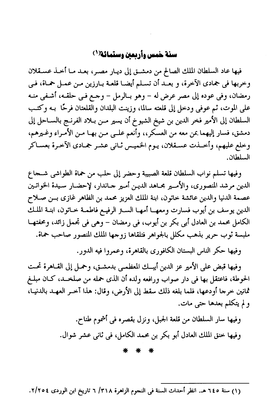 سنة خمس وَأَرْبَعين وسِتمِائَة فِيهَا عَاد السُّلْطَان الْملك الصَّالح من دمشق إِلَى ديار مصر بعد مَا أَخذ عسقلان وخربها فِي جُمَادَى الْآخِرَة وَبعد أَن تسلم أَيْضا قلعة بارزين من عمل حماة فِي رَمَضَان وَفِي عوده إِلَى مصر عرض لَهُ - وَهُوَ بالرمل - وجع فِي حلقه أشفى مِنْهُ على الْمَوْت ثمَّ عوفي وَدخل إِلَى قلعته سالما وزينت الْبلدَانِ والقلعتان فَرحا بِهِ وَكتب السُّلْطَان إِلَى الْأَمِير فَخر الدّين بن شيخ الشُّيُوخ أَن يشر من بِلَاد الفرنج بالسَّاحل إِلَى دمشق فَسَار إِلَيْهِمَا بِمن مَعَه من الْعَسْكَر وأنعم على من بهَا من الْأُمَرَاء وَغَيرهم وخلع عَلَيْهِم وَأخذت عسقلان يَوْم الْخَمِيس ثَانِي عشر جُمَادَى الْآخِرَة بعساكر السُّلْطَان. وفيهَا تسلم نواب السُّلْطَان قلعة الصبيبة وَحضر إِلَى حلب من حماة الطواشي شُجَاع الدّين مرشد المنصوري والأمير مُجَاهِد الدّين أَمِير جاندار لإحضار سيدة الخواتين عصمَة الدُّنْيَا وَالدّين عَائِشَة خاتون ابْنة الْملك الْعَزِيز مُحَمَّد بن الظَّاهِر غَازِي بن صَلَاح الدّين يُوسُف بن أَيُّوب فسارت وَمَعَهَا أمهَا السّتْر الرفيع فَاطِمَة خاتون ابْنة الْملك الْكَامِل مُحَمَّد بن الْعَادِل أبي بكر بن أَيُّوب فِي رَمَضَان وَهِي فِي تجمل زَائِد ومحفتها ملبسة ثوب حَرِير بِذَهَب مكلل بالجواهر فتلقاها زَوجهَا الْملك الْمَنْصُور صَاحب حماة. وفيهَا حكر النَّاس الْبُسْتَان الكافوري بِالْقَاهِرَةِ وعمروا فِيهِ الدّور. وفيهَا قبض على الْأَمِير عز الدّين أيبك المعظمي بِدِمَشْق وَحمل إِلَى الْقَاهِرَة تَحت الحوطة فاعتقل بهَا فِي دَار صَوَاب ورافعه وَلَده أَن الَّذِي حمله من صلخد كَانَ مبلغ ثَمَانِينَ خرجا أودعها فَلَمَّا بلغه ذَلِك سقط إِلَى الأَرْض وَقَالَ: هَذَا آخر الْعَهْد بالدنيا وَلم يتَكَلَّم بعْدهَا حَتَّى مَاتَ. وفيهَا سَار السُّلْطَان من قلعة الْجَبَل وَنزل بقصره فِي أشموم طناح. وفيهَا خنق الْملك الْعَادِل أَبُو بكر بن مُحَمَّد الْكَامِل فِي ثَانِي عشر شَوَّال.