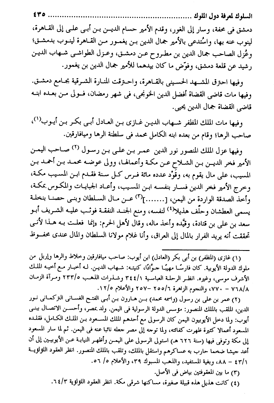 دمشق فِي محفة وَسَار إِلَى الْغَوْر وَقدم الْأَمِير حسام الدّين بن أبي عَليّ إِلَى الْقَاهِرَة لينوب عَنهُ بهَا واستدعي بالأمير جمال الدّين بن يغمور من الْقَاهِرَة لينوب بِدِمَشْق وعزل الصاحب جمال الدّين بن مطروح عَن دمشق وعزل الطواشي شهَاب الدّين رشيد عَن قلعة دمشق وفوض مَا كَانَ بيدهما للأمير جمال الدّين بن يغمور. وفيهَا احْتَرَقَ المشهد الْحُسَيْنِي بِالْقَاهِرَةِ واحترقت المنارة الشرقية بِجَامِع دمشق. وفيهَا مَاتَ قَاضِي الْقُضَاة أفضل الدّين الخونجي فِي شهر رَمَضَان فولي من بعده ابْنه قَاضِي الْقُضَاة جمال الدّين يحيى. وفيهَا مَاتَ الْملك المظفر شهَاب الدّين غَازِي بن الْعَادِل أبي بكر بن أَيُّوب صَاحب الرها وَقَامَ من بعده ابْنه الْكَامِل مُحَمَّد فِي سلطة الرها وميافارقين. وفيهَا عزل الْملك الْمَنْصُور نور الدّين عمر بن عَليّ بن رَسُول صَاحب الْيمن الْأَمِير فَخر الدّين بن الشلاح عَن مَكَّة وأعمالها وَولي عوضه مُحَمَّد بن أَحْمد بن الْمسيب على مَال يقوم بِهِ وقود عدده مائَة فرس كل سنة فَقدم ابْن الْمسيب مَكَّة وَخرج الْأَمِير فَخر الدّين فَسَار بِنَفسِهِ ابْن الْمسيب وَأعَاد الجبايات والمكوس بِمَكَّة وَأخذ الصَّدَقَة الْوَارِدَة من الْيمن عَن مَال السُّلْطَان وَبنى حصناً بنخلة يُسمى العطشان وَحلف هذيلا لنَفسِهِ وَمنع الْجند النَّفَقَة فَوَثَبَ عَلَيْهِ الشريف أَبُو سعد بن عَليّ بن قَتَادَة وَقَيده وَأخذ مَاله وَقَالَ لأهل الْحرم: إِنَّمَا فعلت بِهِ هَذَا لِأَنِّي تحققت أَنه يُرِيد الْفِرَار بِالْمَالِ إِلَى الْعرَاق وَأَنا غُلَام مَوْلَانَا السُّلْطَان وَالْمَال عِنْدِي مَحْفُوظ