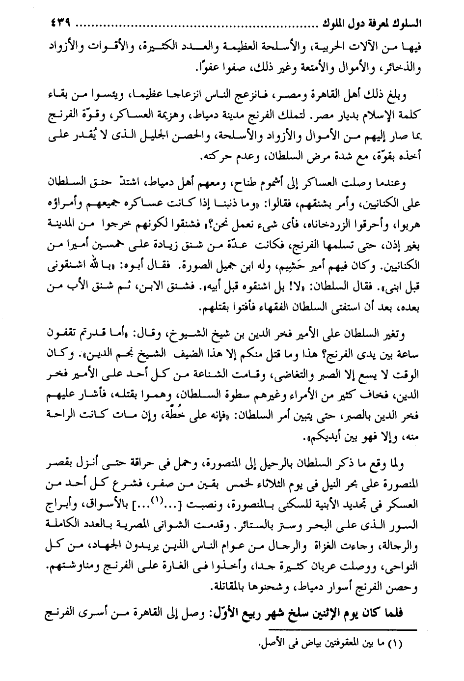 فِيهَا من الْآلَات الحربية والأسلحة الْعَظِيمَة وَالْعدَد الْكَثِيرَة والأقوات والأزواد والذخائر وَالْأَمْوَال والأمتعة وَغير ذَلِك صفواً عفوا. وَبلغ ذَلِك أهل الْقَاهِرَة ومصر فأنزعج النَّاس انزعاجاً عَظِيما ويئسوا من بَقَاء كلمة الْإِسْلَام بديار مصر. لتملك الفرنج مَدِينَة دمياط وهزيمة العساكر وَقُوَّة الفرنج بِمَا صَار إِلَيْهِم من الْأَمْوَال والأزواد والأسلحة والحصن الْجَلِيل الَّذِي لَا يقدر على أَخذه بِقُوَّة مَعَ شدَّة مرض السُّلْطَان وَعدم حركته. وعندما وصلت العساكر إِلَى أشموم طناح وَمَعَهُمْ أهل دمياط اشْتَدَّ حنق السُّلْطَان على الكنانيين وَأمر بشنقهم فَقَالُوا: وَمَا ذنبنا إِذا كَانَت عساكره جَمِيعهم وأمراؤه هربوا وأحرقوا الزردخاناه فَأَي شَيْء لعمل نَحن فشنقوا لكَوْنهم خَرجُوا من الْمَدِينَة بِغَيْر إِذن حَتَّى تسلمها الفرنج فَكَانَت عدَّة من شنق زِيَادَة على خمسين أَمِيرا من الكنانيين. وَكَانَ فيهم أَمِير حشيم وَله ابْن جميل الصُّورَة. فَقَالَ أَبوهُ: بِاللَّه اشنقوني قبل ابْني. فَقَالَ السُّلْطَان: لَا بل اشنقوه قبل أَبِيه. فشنق الابْن ثمَّ شنق الْأَب من بعده بعد أَن استفتى السُّلْطَان الْفُقَهَاء فأفتوا بِقَتْلِهِم. وَتغَير السُّلْطَان على الْأَمِير فَخر الدّين بن شيخ الشُّيُوخ وَقَالَ: أما قدرتم تقفون سَاعَة بَين يَدي الفرنج. هَذَا وَمَا قتل مِنْكُم إِلَّا هَذَا الضَّيْف الشَّيْخ نجم الدّين. وَكَانَ الْوَقْت لَا يسع إِلَّا الصَّبْر والتغاضي وَقَامَت الشناعة من كل أحد على الْأَمِير فَخر الدّين فخاف كثير من الْأُمَرَاء وَغَيرهم سطوة السُّلْطَان وهموا بقتْله فَأَشَارَ عَلَيْهِم فَخر الدّين بِالصبرِ حَتَّى يتَبَيَّن أَمر وَلما وَقع مَا ذكر السُّلْطَان بالرحيل إِلَى المنصورة وَحمل فِي حراقة حَتَّى أنزل بقصر المنصورة على بَحر النّيل فِي يَوْم الثُّلَاثَاء لخمس بَقينَ من صفر فشرع كل أحد من الْعَسْكَر فِي تَجْدِيد الْأَبْنِيَة للسُّكْنَى بالمنصورة ونصبت بالأسواق وأبراج السُّور الَّذِي على الْبَحْر وَستر بالستائر. وقدمت الشواني المصرية بِالْعدَدِ الْكَامِلَة والرجالة وَجَاءَت الْغُزَاة وَالرِّجَال من عوام النَّاس الَّذين يُرِيدُونَ الْجِهَاد من كل النواحي ووصلت عربان كَثِيرَة جدا وَأخذُوا فِي الْغَارة على الفرنج ومناوشتهم. وحصن الفرنج أسوار دمياط وشحنوها بالمقاتلة. فَلَمَّا كَانَ يَوْم الِاثْنَيْنِ سلخ شهر ربيع الأول: وصل إِلَى الْقَاهِرَة من أسرى الفرنج