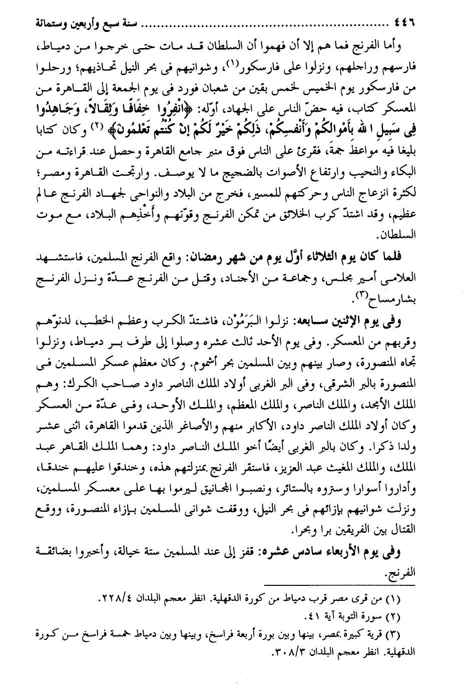 وَأما الفرنج فَمَا هم إِلَّا أَن فَهموا أَن السُّلْطَان قد مَاتَ حَتَّى خَرجُوا من دمياط فارسهم وراجلهم ونزلوا على فارسكور وشوانيهم فِي بَحر النّيل تحاذيهم ورحلوا من فارسكور يَوْم الْخَمِيس لخمس بَقينَ من شعْبَان فورد فِي يَوْم الْجُمُعَة إِلَى الْقَاهِرَة من المعسكر كتاب فِيهِ حض النَّاس على الْجِهَاد أَوله: انفروا خفافاً وثقالاً وَجَاهدُوا فِي سَبِيل الله بأموالكم وَأَنْفُسكُمْ ذَلِكُم خير لكم إِن كُنْتُم تعلمُونَ وَكَانَ كتابا بليغاً فِيهِ مواعظ جمة فقرئ على النَّاس فَوق مِنْبَر جَامع الْقَاهِرَة وَحصل عِنْد قِرَاءَته من الْبكاء والنحيب وارتفاع الْأَصْوَات بالضجيج مَا لَا يُوصف. وارتجت الْقَاهِرَة ومصر لِكَثْرَة انزعاج النَّاس وحركتهم للمسير فَخرج من الْبِلَاد والنواحي لجهاد الفرنج عَالم عَظِيم وَقد اشْتَدَّ كرب الْخَلَائق من تمكن الفرنج وقوتهم وَأَخذهم الْبِلَاد مَعَ موت السُّلْطَان. فَلَمَّا كَانَ يَوْم الثُّلَاثَاء أول يَوْم من شهر رَمَضَان: وَاقع الفرنج الْمُسلمين فاستشهد العلامي أَمِير مجْلِس وَجَمَاعَة من الأجناد وَقتل من الفرنج عدَّة وَنزل الفرنج بشارمساح. وَفِي يَوْم الِاثْنَيْنِ سابعه: نزلُوا البرمون فَاشْتَدَّ الكرب وَعظم الْخطب لدنوهم وقربهم من المعسكر. وَفِي يَوْم الْأَحَد ثَالِث عشره وصلوا إِلَى طرف بر دمياط ونزلوا تجاه المنصورة وَصَارَ بَينهم وَبَين الْمُسلمين بَحر أشموم. وَكَانَ مُعظم عَسْكَر الْمُسلمين فِي المنصورة بِالْبرِّ الشَّرْقِي وَفِي الْبر الغربي أَوْلَاد الْملك النَّاصِر دَاوُد صَاحب الكرك: وهم الْملك الأمجد وَالْملك النَّاصِر وَالْملك الْمُعظم وَالْملك الأوحد وَفِي عدَّة من الْعَسْكَر وَكَانَ أَوْلَاد الْملك النَّاصِر دَاوُد الأكابر مِنْهُم والأصاغر الَّذين قدمُوا الْقَاهِرَة اثْنَي عشر ولدا ذكرا. وَكَانَ بِالْبرِّ الغربي أَيْضا أَخُو الْملك النَّاصِر دَاوُد: وهما الْملك القاهر عبد الْملك وَالْملك المغيث عبد الْعَزِيز فاستقر الفرنج بمنزلتهم هَذِه وخندقوا عَلَيْهِم خَنْدَقًا وأداروا أسواراً وستروه بالستائر ونصبوا المجانيق ليرموا بهَا على معسكر الْمُسلمين وَنزلت شوانيهم بازائهم فِي بَحر النّيل ووقفت شواني الْمُسلمين بازاء المنصورة وَوَقع الْقِتَال بَين الْفَرِيقَيْنِ برا وبحراً. وَفِي يَوْم الْأَرْبَعَاء سادس عشره: قفز إِلَى عِنْد الْمُسلمين سِتَّة خيالة وأخبروا بضائقة الفرنج.