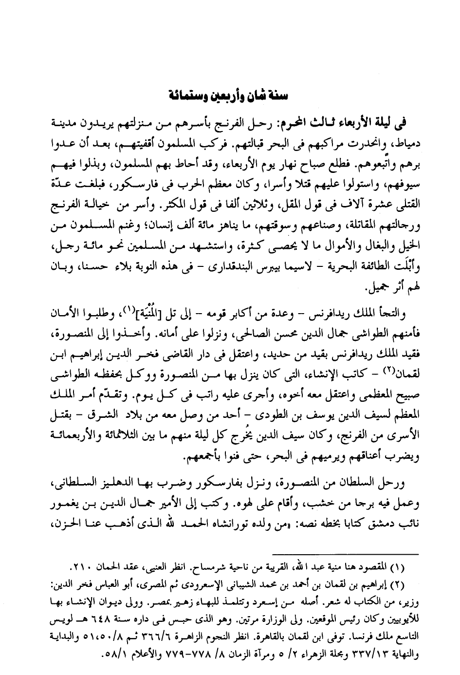فِي لَيْلَة الْأَرْبَعَاء ثَالِث الْمحرم: رَحل الفرنج بأسرهم من مَنْزِلَتهمْ يُرِيدُونَ مَدِينَة دمياط وانحدرت مراكبهم فِي الْبَحْر قبالتهم. فَركب الْمُسلمُونَ أقفيتهم بعد أَن عدوا برهم واتبعوهم. فطلع صباح نَهَار يَوْم الْأَرْبَعَاء وَقد أحَاط بهم الْمُسلمُونَ وبلوا فيهم سيوفهم واستولوا عَلَيْهِم قتلا وأسراً وَكَانَ مُعظم الْحَرْب فِي فارسكور فبلغت عدَّة الْقَتْلَى عشرَة آلَاف فِي قَول الْمقل وَثَلَاثِينَ ألفا فِي قَول المكثر. وَأسر من خيالة الفرنج ورجالتهم الْمُقَاتلَة وصناعهم وسوقتهم مَا يناهز مائَة ألف إِنْسَان وغنم الْمُسلمُونَ من الْخَيل وَالْبِغَال وَالْأَمْوَال مَا لَا يُحْصى كَثْرَة وَاسْتشْهدَ من الْمُسلمين نَحْو مائَة رجل وأبلت الطَّائِفَة البحرية - لاسيما بيبرس البندقداري - فِي هَذِه النّوبَة بلَاء حسنا وَبَان لَهُم أثر جميل. والتجأ الْملك ريدافرنس - وعدة من أكَابِر قومه - إِلَى تل الْمنية وطلبوا الْأمان فَأَمنَهُمْ الطواشي جمال الدّين محسن الصَّالِحِي ونزلوا على أَمَانه. وَأخذُوا إِلَى المنصورة فقيد الْملك ريدافرنس بِقَيْد من حَدِيد واعتقل فِي دَار القَاضِي فَخر الدّين إِبْرَاهِيم ابْن لُقْمَان كَاتب الْإِنْشَاء الَّتِي كَانَ ينزل بهَا من المنصورة ووكل بحفظه الطواشي صبيح المعظمي واعتقل مَعَه أَخُوهُ وأجرى عَلَيْهِ راتب فِي كل يَوْم. وَتقدم أَمر الْملك الْمُعظم لسيف الدّين يُوسُف بن الطودي - أحد من وصل مَعَه من بِلَاد الشرق - بقتل الأسرى من الفرنج وَكَانَ سيف الدّين يخرج كل لَيْلَة مِنْهُم مَا بَين الثلاثمائة والأربعمائة وَيضْرب أَعْنَاقهم ويرميهم فِي الْبَحْر حَتَّى فنوا بأجمعهم. ورحل السُّلْطَان من المنصورة وَنزل بفارسكور وَضرب بهَا الدهليز السلطاني وَعمل فِيهِ برجاً من خشب وَأقَام على لهوه. وَكتب إِلَى الْأَمِير جمال الدّين بن يغمور نَائِب دمشق كتابا بِخَطِّهِ نَصه: من وَلَده تورانشاه الْحَمد لله الَّذِي أذهب عَنَّا الْحزن