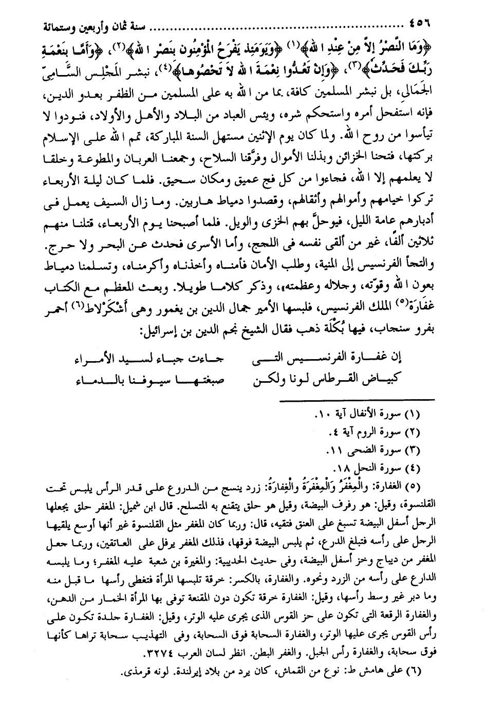 ويومئذ يفرح الْمُؤْمِنُونَ بنصر الله وَأما بِنِعْمَة رَبك فَحدث وَإِن تعدوا نعْمَة الله لَا تحصوها نبشر الْمجْلس السَّامِي الجمالي بل نبشر الْمُسلمين كَافَّة بِمَا من الله بِهِ على الْمُسلمين من الظفر بعدو الدّين فَإِنَّهُ استفحل أمره واستحكم شَره ويئس الْعباد من الْبِلَاد والأهل وَالْأَوْلَاد فنودوا لَا تيأسوا من روح الله. وَلما كَانَ يَوْم الِاثْنَيْنِ مستهل السّنة الْمُبَارَكَة تمم الله على الْإِسْلَام بركتها فتحنا الخزائن وبذلنا الْأَمْوَال وفرقنا السِّلَاح وجمعنا العربان والمطوعة وخلقاً لَا يعلمهُمْ إِلَّا الله فَجَاءُوا من كل فج عميق وَمَكَان سحيق. فَلَمَّا كَانَ لَيْلَة الْأَرْبَعَاء تركُوا خيامهم وَأَمْوَالهمْ وأثقالهم وقصدوا دمياط هاربين. وَمَا زَالَ السَّيْف يعْمل فِي أدبارهم عَامَّة اللَّيْل فيوحل بهم الخزي وَالْوَيْل. فَلَمَّا أَصْبَحْنَا يَوْم الْأَرْبَعَاء قتلنَا مِنْهُم ثَلَاثِينَ ألفا غير من ألْقى نَفسه فِي اللجج وَأما الأسرى فَحدث عَن الْبَحْر وَلَا حرج. والتجأ الفرنسيس إِلَى الْمنية وَطلب الْأمان فأمناه وأخذناه وأكرمناه وتسلمنا دمياط بعون الله وقوته وجلاله وعظمته وَذكر كلَاما طَويلا. وَبعث الْمُعظم مَعَ الْكتاب غفارة الْملك الفرنسيس فلبسها الْأَمِير جمال الدّين بن يغمور وَهِي أشكرلاط أَحْمَر بِفَرْوٍ سنجاب فِيهَا بكلة ذهب فَقَالَ الشَّيْخ نجم الدّين بن إِسْرَائِيل: إِن غفارة الفرنسيس الَّتِي جَاءَت جباء لسَيِّد الْأُمَرَاء كبياض القرطاس لوناً وَلَكِن صبغتها سُيُوفنَا بالدماء