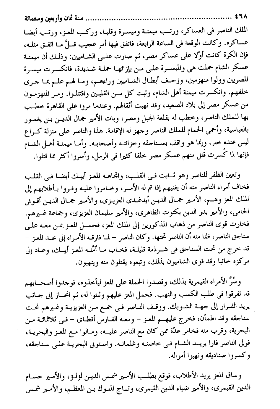 الْملك النَّاصِر فِي العساكر ورتب ميمنة وميسرة وَقَلْبًا وَركب الْمعز ورتب أَيْضا عساكره. وَكَانَت الْوَقْعَة فِي السَّاعَة الرَّابِعَة فاتفق فِيهَا أَمر عَجِيب قل مَا اتّفق مثله فَإِن الكرة كَانَت أَولا على عَسَاكِر مصر ثمَّ صَارَت على الشاميين: وَذَلِكَ أَن ميمنة عَسْكَر الشَّام حملت هِيَ والميسرة على من بازائها حَملَة شَدِيدَة فَانْكَسَرت ميسرَة المصريين وولوا منهزمين وزحف أبطال الشاميين وَرَاءَهُمْ وَمَا لَهُم علم بِمَا جرى خَلفهم. وانكسرت ميمنة أهل الشَّام وَثَبت كل من القلبين واقتتلوا. وَمر المنهزمون من عَسْكَر مصر إِلَى بِلَاد الصَّعِيد وَقد نهبت أثقالهم. وعندما مروا على الْقَاهِرَة خطب بهَا للْملك النَّاصِر وخطب لَهُ بقلعة الْجَبَل ومصر وَبَات الْأَمِير جمال الدّين بن يغمور بالعباسية وأحمي الْحمام للْملك النَّاصِر وجهز لَهُ الْإِقَامَة. هَذَا والناصر على منزلَة كرَاع لَيْسَ عِنْده خبر وَإِنَّمَا هُوَ وَاقِف بسناجقه وخزائنه وَأَصْحَابه. وَأما ميمنة أهل الشَّام فَإِنَّهَا لما كسرت قتل مِنْهُم عَسْكَر مصر خلقا كثيرا فِي الرمل وأسروا أَكثر مِمَّا قتلوا. وَتعين الظفر للناصر وَهُوَ ثَابت فِي الْقلب واتجاهه الْمعز أيبك أَيْضا فِي الْقلب فخاف أُمَرَاء النَّاصِر مِنْهُ أَن لمجنيهم إِذا تمّ لَهُ الْأَمر وخامروا عَلَيْهِ وفروا بأطلابهم إِلَى الْملك الْمعز وهم الْأَمِير جمال الدّين أيدغدي العزيزي والأمير جمال الدّين أقوش الحامي والأمير بدر الدّين بكتوت الظَّاهِرِيّ والأمير سُلَيْمَان العزيزي وَجَمَاعَة غَيرهم. فخارت قوى النَّاصِر من ذهَاب الْمَذْكُورين إِلَى الْملك الْمعز فَحمل الْمعز بِمن مَعَه على سناجق النَّاصِر ظنا مِنْهُ أَن النَّاصِر تحتهَا. وَكَانَ النَّاصِر - لما فَارقه الْأُمَرَاء إِلَى عِنْد الْمعز - قد خرج من تَحت السناجق فِي شردمة قَليلَة فخاب مَا أمله الْمعز أيبك وَعَاد إِلَى مركزه خائباً وَقد قوى الشاميون بذلك وتبعوه يقتلُون مِنْهُ وينهبون. وسر الْأُمَرَاء القيمرية بذلك وقصدوا الحملة على الْمعز ليأخذوه فوجدوا أَصْحَابهم قد تفَرقُوا فِي طلب الْكسْب والنهب. فَحمل الْمعز عَلَيْهِم وثبتوا لَهُ ثمَّ انحاز إِلَى جَانب يُرِيد الْفِرَار إِلَى جِهَة الشوبك. ووقف النَّاصِر فِي جمع من العزيزية وَغَيرهم تَحت سناجقه وَقد اطْمَأَن فَخرج عَلَيْهِم الْمعز - وَمَعَهُ الْفَارِس أقطاي - فِي ثَلَاثمِائَة من البحرية وَقرب مِنْهُ فخامر عدَّة مِمَّن كَانَ مَعَ النَّاصِر عَلَيْهِ ومالوا مَعَ الْمعز والبحرية فولى النَّاصِر فَارًّا يُرِيد الشَّام فِي خاصته وغلمانه. وَاسْتولى وسَاق الْمعز يُرِيد الأطلاب فَوَقع بِطَلَب الْأَمِير شمس الدّين لُؤْلُؤ والأمير حسام الدّين القيمري والأمير ضِيَاء الدّين القيمري وتاج الْمُلُوك بن الْمُعظم والأمير شمس