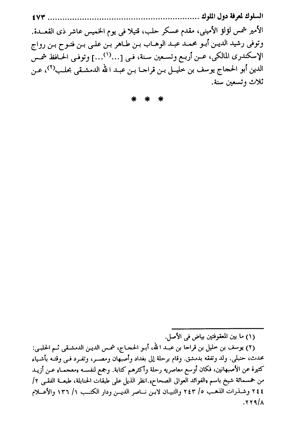 الْأَمِير شمس لُؤْلُؤ الأميني مقدم عَسْكَر حلب قَتِيلا فِي يَوْم الْخَمِيس عَاشر ذِي الْقعدَة وَتُوفِّي رشيد الدّين أَبُو مُحَمَّد عبد الْوَهَّاب بن طَاهِر بن عَليّ بن فتوح بن رواج الإسكندري الْمَالِكِي عَن أَربع وَتِسْعين سنة فِي وَتُوفِّي الْحَافِظ شمس الدّين أَبُو الْحجَّاج يُوسُف بن خَلِيل بن قراجا بن عبد الله الدِّمَشْقِي بحلب عَن ثَلَاث وَتِسْعين سنة.