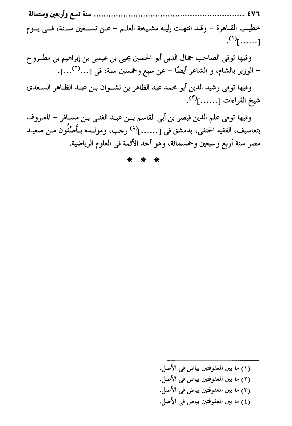 خطيب الْقَاهِرَة وَقد انْتَهَت إِلَيْهِ مشيخة الْعلم عَن تسعين سنة فِي يَوْم. وفيهَا توفّي الصاحب جمال الدّين أَبُو الْحُسَيْن يحيى بن عِيسَى بن إِبْرَاهِيم بن مطروح - الْوَزير بِالشَّام والشاعر أَيْضا - عَن سبع وَخمسين سنة فِي. . وفيهَا توفّي رشيد الدّين أَبُو مُحَمَّد عبد الظَّاهِر بن نشوان بن عبد الظَّاهِر السَّعْدِيّ شيخ الْقرَاءَات 000 وفيهَا توفّي علم الدّين قَيْصر بن أبي الْقَاسِم بن عبد الْغَنِيّ بن مُسَافر - الْمَعْرُوف بتعاسيف الْفَقِيه الْحَنَفِيّ بِدِمَشْق فِي 10 رَجَب ومولده بأصفون من صَعِيد مصر سنة أَربع وَسبعين وَخَمْسمِائة وَهُوَ أحد الْأَئِمَّة فِي الْعُلُوم الرياضية.