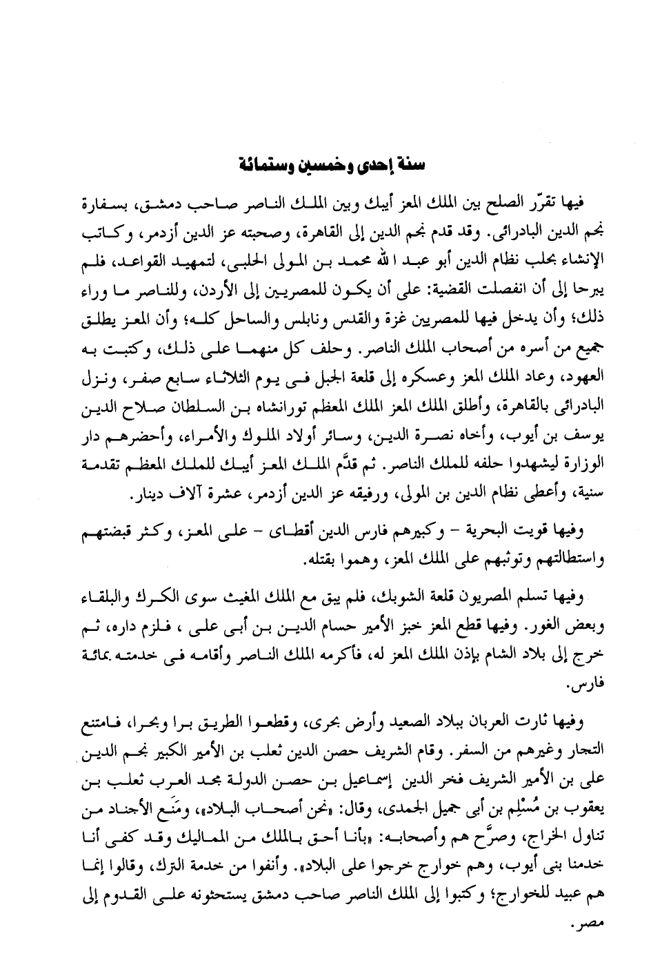 سنة إِحْدَى وَخمسين وسِتمِائَة فِيهَا تقرر الصُّلْح بَين الْملك الْمعز أيبك وَبَين الْملك النَّاصِر صَاحب دمشق بسفارة نجم الدّين البادرائي. وَقد قدم نجم الدّين إِلَى الْقَاهِرَة وصحبته عز الدّين أزدمر وَكَاتب الْإِنْشَاء بحلب نظام الدّين أَبُو عبد الله مُحَمَّد بن الْمولى الْحلَبِي لتمهيد الْقَوَاعِد فلي يبرحا إِلَى أَن انفصلت الْقَضِيَّة: على أَن يكون للمصريين إِلَى الْأُرْدُن وللناصر مَا وَرَاء ذَلِك وَأَن يدْخل فِيهَا للمصريين غَزَّة والقدس ونابلس والساحل كُله وَأَن الْمعز يُطلق جَمِيع من أسره من أَصْحَاب الْملك النَّاصِر. وَحلف كل مِنْهُمَا على ذَلِك وكتبت بِهِ العهود وَعَاد الْملك الْمعز وَعَسْكَره إِلَى قلعة الْجَبَل فِي يَوْم الثُّلَاثَاء سَابِع صفر وَنزل البادرائي بِالْقَاهِرَةِ وَأطلق الْملك الْمعز الْملك الْمُعظم تورانشاه بن السُّلْطَان صَلَاح الدّين يُوسُف بن أَيُّوب وأخاه نصْرَة الدّين وَسَائِر أَوْلَاد الْمُلُوك والأمراء وأحضرهم دَار الوزارة ليشهدوا حلفه للْملك النَّاصِر. ثمَّ قدم الْملك الْمعز أيبك للْملك الْمُعظم تقدمة سنية وَأعْطى نظام الدّين بن الْمولى ورفيقه عز الدّين أزدمر عشره آلَاف دِينَار. وفيهَا قويت البحرية - وَكَبِيرهمْ فَارس الدّين أقطاي - على الْمعز وَكثر قبضتهم واستطالتهم وتوثبهم على الْملك الْمعز وهموا بقتْله. وفيهَا تسلم المصريون قلعة الشوبك فَلم يبْق مَعَ الْملك المغيث سوى الكرك والبلقاء وَبَعض الْغَوْر. وفيهَا قطع الْمعز خبز الْأَمِير حسام الدّين بن أبي عَليّ فَلَزِمَ دَاره ثمَّ خرج إِلَى بِلَاد الشَّام وفيهَا ثارت العربان بِبِلَاد الصَّعِيد وَأَرْض بحري وَقَطعُوا الطَّرِيق برا وبحراً فَامْتنعَ التُّجَّار وَغَيرهم من السّفر. وَقَامَ الشريف حصن الدّين ثَعْلَب بن الْأَمِير الْكَبِير نجم الدّين عَليّ بن الْأَمِير الشريف فَخر الدّين إِسْمَاعِيل بن حصن الدولة مجد الْعَرَب ثَعْلَب بن يَعْقُوب بن مُسلم بن أبي جميل الجمدي وَقَالَ: نَحن أَصْحَاب الْبِلَاد وَمنع الأجناد من ناول الْخراج وَصرح هم وَأَصْحَابه: بِأَنا أَحَق بِالْملكِ من المماليك وَقد كفى أَنا خدمنا بني أَيُّوب وهم خوارج خَرجُوا على الْبِلَاد. وأنفوا من خدمَة التّرْك وَقَالُوا إِنَّمَا هم عبيد للخوارج وَكَتَبُوا إِلَى الْملك النَّاصِر صَاحب دمشق يستحثونه على الْقدوم إِلَى مصر.