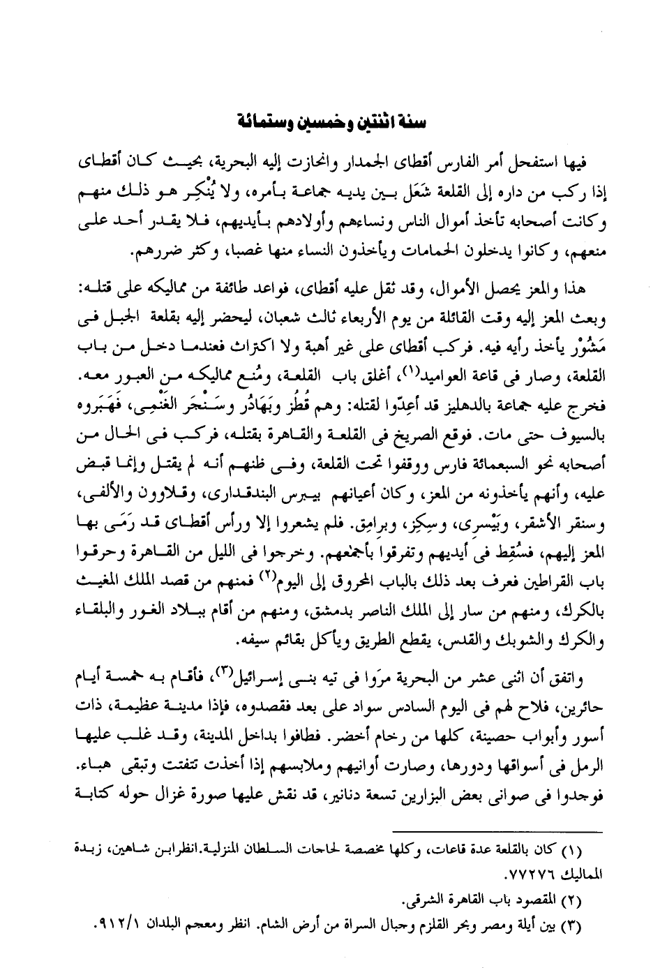 سنة اثْنَتَيْنِ وَخمسين وسِتمِائَة فِيهَا استفحل أَمر الْفَارِس أقطاي الجمدار وانحازت إِلَيْهِ البحرية بِحَيْثُ كَانَ أقطاي إِذا ركب من دَاره إِلَى القلعة شعل بَين يَدَيْهِ جمَاعَة بأَمْره وَلَا يُنكر هُوَ ذَلِك مِنْهُم وَكَانَت أَصْحَابه تَأْخُذ أَمْوَال النَّاس ونساءهم وَأَوْلَادهمْ بِأَيْدِيهِم فَلَا يقدر أحد على مَنعهم وَكَانُوا يدْخلُونَ الحمامات وَيَأْخُذُونَ النِّسَاء مِنْهَا غصبا وَكثر ضررهم. هَذَا والمعز يحصل الْأَمْوَال وَقد ثقل عَلَيْهِ أقطاي فواعد طَائِفَة من مماليكه على قَتله: وَبعث الْمعز إِلَيْهِ وَقت القائلة من يَوْم الْأَرْبَعَاء ثَالِث شعْبَان ليحضر إِلَيْهِ بقلعة الْجَبَل فِي مشور يَأْخُذ رَأْيه فِيهِ. فَركب أقطاي على غير أهبة وَلَا اكتراث فعندما دخل من بَاب القلعة وَصَارَ فِي قاعة العواميد أغلق بَاب القلعة وَمنع مماليكه من العبور مَعَه. فَخرج عَلَيْهِ جمَاعَة بالدهليز قد أعدُّوا لقَتله: وهم قطز وبهادر وسنجر الغنمي فهبروه بِالسُّيُوفِ حَتَّى مَاتَ. فَوَقع الصَّرِيخ فِي القلعة والقاهرة بقتْله فَركب فِي الْحَال من أَصْحَابه نَحْو السبعمائة فَارس ووقفوا تَحت القلعة وَفِي ظنهم أَنه لم يقتل وَإِنَّمَا قبض عَلَيْهِ وَأَنَّهُمْ يأخذونه من الْمعز وَكَانَ أعيانهم بيبرس البندقداري وقلاوون والألفي وسنقر الْأَشْقَر وبيسرى وسكز وبرامق. فَلم يشعروا إِلَّا وَرَأس أقطاي قد رمي بهَا الْمعز إِلَيْهِم فَسقط فِي أَيْديهم وَتَفَرَّقُوا بأجمعهم. وَخَرجُوا فِي اللَّيْل من الْقَاهِرَة وحرقوا بَاب القراطين فَعرف بعد ذَلِك بِالْبَابِ المحروق إِلَى الْيَوْم فَمنهمْ من قصد الْملك المغيث بالكرك وَمِنْهُم من سَار إِلَى الْملك النَّاصِر بِدِمَشْق وَمِنْهُم من أَقَامَ بِبِلَاد الْغَوْر والبلقاء والكرك والشوبك والقدس يقطع الطَّرِيق وَيَأْكُل بقائم سَيْفه. وَاتفقَ أَن اثْنَي عشر من البحرية مروا فِي تيه بني إِسْرَائِيل فَأَقَامَ بِهِ خَمْسَة أَيَّام حائرين فلاح لَهُم فِي الْيَوْم السَّادِس سَواد على بعد فقصدوه فَإِذا مَدِينَة عَظِيمَة ذَات أسور وأبواب حَصِينَة كلهَا من رُخَام أَخْضَر. فطافوا بداخل الْمَدِينَة وَقد غلب عَلَيْهَا الرمل فِي أسواقها ودورها وَصَارَت أوانيهم وملابسهم إِذا أخذت تتفتت وَتبقى هباء. فوجدوا فِي صواني بعض البزارين تِسْعَة دَنَانِير قد نقش عَلَيْهَا صُورَة غزال حوله كِتَابَة