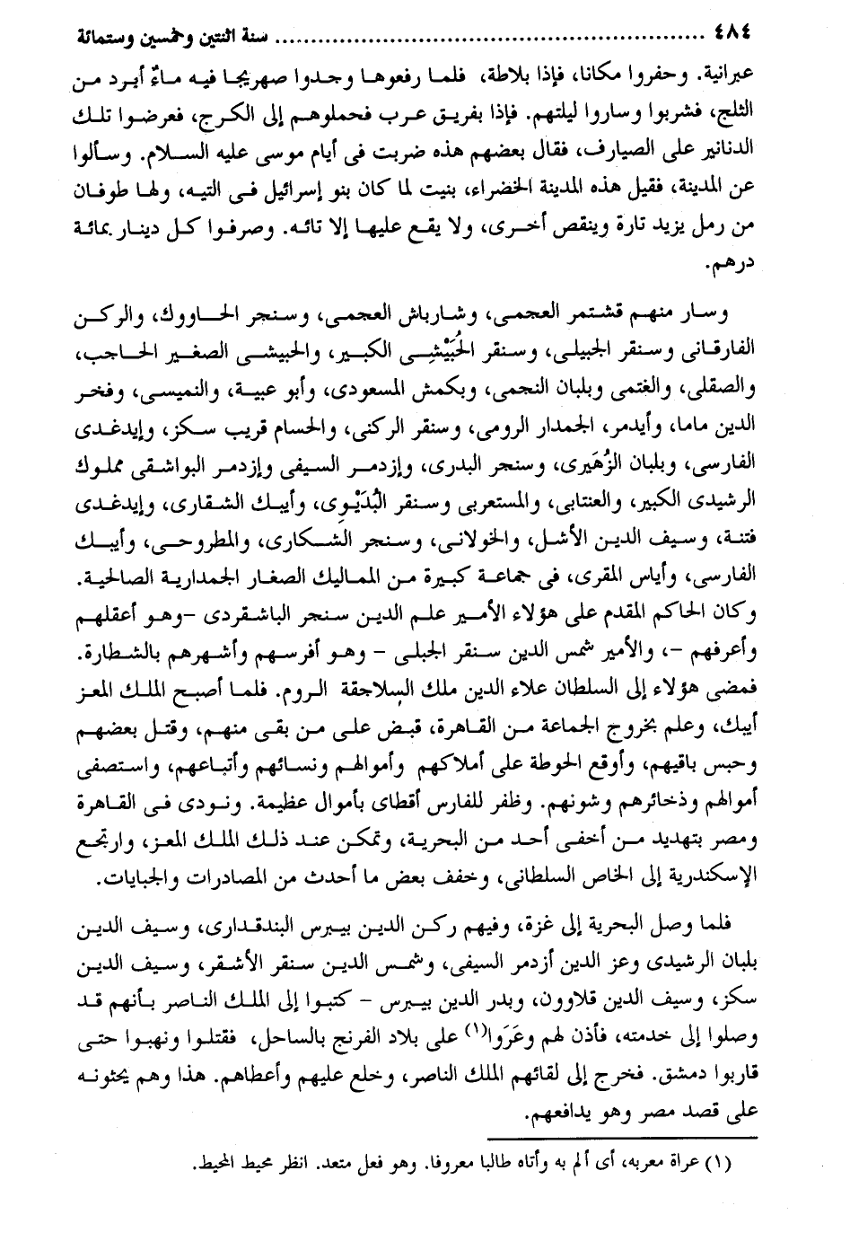 عبرانية. وحفروا مَكَانا فَإِذا بلاطة فَلَمَّا رفعوها وجدوا صهريجاً فِيهِ مَاء أبرد من الثَّلج فَضربُوا وَسَارُوا ليلتهم. فَإِذا بفريق عرب فحملوهم إِلَى الكرج فعرضوا تِلْكَ الدَّنَانِير على الصيارف فَقَالَ بَعضهم هَذِه ضربت فِي أَيَّام مُوسَى عَلَيْهِ السَّلَام. وسألوا عَن الْمَدِينَة فَقيل هَذِه الْمَدِينَة الخضراء بنيت لما كَانَ بَنو إِسْرَائِيل فِي التيه وَلها طوفان من رمل يزِيد تَارَة وَينْقص أُخْرَى وَلَا يَقع عَلَيْهَا إِلَّا تائه. وصرفوا كل دِينَار بِمِائَة دِرْهَم. وَسَار مِنْهُم قشتمر العجمي وشارباش العجمي وسنجر الحاووك والركن الفارقاني وسنقر الجبيلي وسنقر المجيشي الْكَبِير والحبيشي الصَّغِير الْحَاجِب والصقلي والغتمي وبلبان النجمي وبكمش المَسْعُودِيّ وَأَبُو عبِّيَّة والنميسي وفخر الدّين ماما وأيدمر الجمدار الرُّومِي وسنقر الركني والحسام قريب سكز وإيدغدي الْفَارِسِي وبلبان الزهيري وسنجر البحري وإزدمر السيفي وإزدمر البواشقي مَمْلُوك الرَّشِيدِيّ الْكَبِير والعنتابي والمستعربي وسنقر البديوي وأيبك الشقاري وإيدغدي فتْنَة وَسيف الدّين الأشل والخولاني وسنجر الشكاري والمطروحي وأيبك الْفَارِسِي وأياس الْمقري فِي جمَاعَة كَبِيرَة من المماليك الصغار الجمدارية الصالحية. وَكَانَ الْحَاكِم الْمُقدم على هَؤُلَاءِ الْأَمِير علم الدّين سنجر الباشقردي - وَهُوَ أعقلهم وأعرفهم - والأمير شمس الدّين سنقر الْجبلي - وَهُوَ أفرسهم وأشهرهم بالشطارة. فمضي هَؤُلَاءِ إِلَى السُّلْطَان عَلَاء الدّين ملك السلاجقة الرّوم. فَلَمَّا أصبح الْملك الْمعز أيبك وَعلم بِخُرُوج الْجَمَاعَة من الْقَاهِرَة قبض على من بَقِي مِنْهُم وَقتل بَعضهم وَحبس باقيهم وأوقع الحوطة على أملاكهم وَأَمْوَالهمْ وَنِسَائِهِمْ وأتباعهم واستصفى أَمْوَالهم وذخائرهم وشونهم. وظفر للفارس أقطاي بأموال عَظِيمَة. وَنُودِيَ فِي الْقَاهِرَة ومصر بتهديد من أخْفى أحد من البحرية وَتمكن عِنْد ذَلِك الْملك الْمعز وارتجع الْإسْكَنْدَريَّة إِلَى الْخَاص السلطاني وخفف بعض مَا أحدث من المصادرات والجبايات. فَلَمَّا وصل البحرية إِلَى غَزَّة وَفِيهِمْ ركن الدّين بيبرس البندقداري وَسيف الدّين بلبان الرَّشِيدِيّ وَعز الدّين إزدمر السيفي وشمس الدّين سنقر الْأَشْقَر وَسيف الدّين سكز وَسيف الدّين قلاوون وَبدر الدّين بيبرس - كتبُوا إِلَى الْملك النَّاصِر بِأَنَّهُم قد وصلوا إِلَى خدمته فَأذن لَهُم وعروا على بِلَاد الفرنج بالسَّاحل فَقتلُوا ونهبوا حَتَّى قاربوا دمشق. فَخرج إِلَى لقائهم الْملك النَّاصِر وخلع عَلَيْهِم وَأَعْطَاهُمْ. هَذَا وهم يحثونه على قصد مصر وَهُوَ يدافعهم.