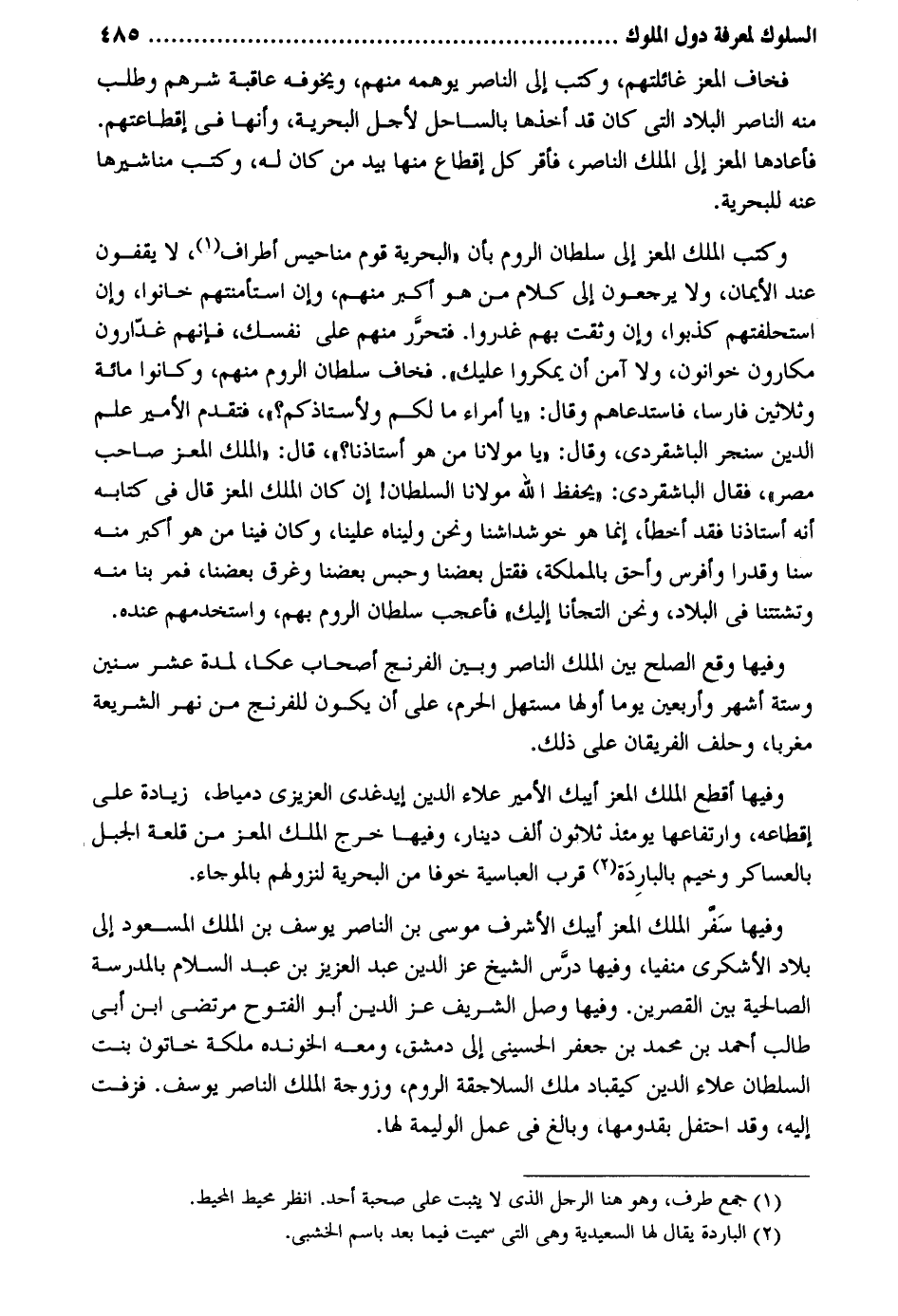 فخاف الْمعز غائلتهم وَكتب إِلَى النَّاصِر يُوهِمهُ مِنْهُم ويخوفه عَاقِبَة شرهم وَطلب مِنْهُ النَّاصِر الْبِلَاد الَّتِي كَانَ قد أَخذهَا بالسَّاحل لأجل البحرية وَأَنَّهَا فِي إقطاعتهم. فَأَعَادَهَا الْمعز إِلَى الْملك وَكتب الْملك الْمعز إِلَى سُلْطَان الرّوم بِأَن البحرية قوم مناحيس أَطْرَاف لَا يقفون عِنْد الْأَيْمَان وَلَا يرجعُونَ إِلَى كَلَام من هُوَ أكبر مِنْهُم وَإِن استأمنتهم خانوا وَإِن استحلفتهم كذبُوا وَإِن وثقت بهم غدروا. فَتحَرَّر مِنْهُم على نَفسك فَإِنَّهُم غدارون مكارون خوانون وَلَا أَمن أَن يَمْكُرُوا عَلَيْك. فخاف سُلْطَان الرّوم مِنْهُم وَكَانُوا مائَة وَثَلَاثِينَ فَارِسًا فاستدعاهم وَقَالَ: يَا أُمَرَاء مَا لكم ولأستاذكم فَتقدم الْأَمِير علم الدّين سنجر الباشقردي وَقَالَ: يَا مَوْلَانَا من هُوَ أستاذنا قَالَ: الْملك الْمعز صَاحب مصر فَقَالَ الباشقردي: يحفظ الله مَوْلَانَا السُّلْطَان إِن كَانَ الْملك الْمعز قَالَ فِي كِتَابه أَنه أستاذنا فقد أَخطَأ إِنَّمَا هُوَ خوشداشنا وَنحن وليناه علينا وَكَانَ فِينَا من هُوَ أكبر مِنْهُ سنا وَقدرا وأفرس وأحق بالمملكة فَقتل بَعْضنَا وَحبس بَعْضنَا وغرق بَعْضنَا فَمر بِنَا مِنْهُ وتشتتنا فِي الْبِلَاد وَنحن التجأنا إِلَيْك فأعجب سُلْطَان الرّوم بهم واستخدمهم عِنْده. وفيهَا وَقع الصُّلْح بَين الْملك النَّاصِر وَبَين الفرنج أَصْحَاب عكا لمُدَّة عشر سِنِين وَسِتَّة أشهر وَأَرْبَعين يَوْمًا أَولهَا مستهل الْحرم على أَن يكون للفرنج من نهر الشَّرِيعَة مغرباً وَحلف الْفَرِيقَانِ على ذَلِك. وفيهَا أقطع الْملك الْمعز أيبك الْأَمِير عَلَاء الدّين أيدغدي العزيزي دمياط زِيَادَة على إقطاعه وارتفاعها يَوْمئِذٍ ثَلَاثُونَ ألف دِينَار وفيهَا خرج الْملك الْمعز من قلعة الْجَبَل بالعساكر وخيم وفيهَا سفر الْملك الْمعز أيبك الْأَشْرَف مُوسَى بن النَّاصِر يُوسُف بن الْملك المسعود إِلَى بِلَاد الأشكري منفياً وفيهَا درس الشَّيْخ عز الدّين عبد الْعَزِيز بن عبد السَّلَام بِالْمَدْرَسَةِ الصالحية بَين القصرين. وفيهَا وصل الشريف عز الدّين أَبُو الْفتُوح مرتضى ابْن أبي طَالب أَحْمد بن مُحَمَّد بن جَعْفَر الْحُسَيْنِي إِلَى دمشق وَمَعَهُ الخونده ملكة خاتون بنت السُّلْطَان عَلَاء الدّين كيقباد ملك السلاجقة الرّوم وَزَوْجَة الْملك النَّاصِر يُوسُف. فزفت إِلَيْهِ وَقد احتفل بقدومها وَبَالغ فِي عمل الْوَلِيمَة لَهَا.