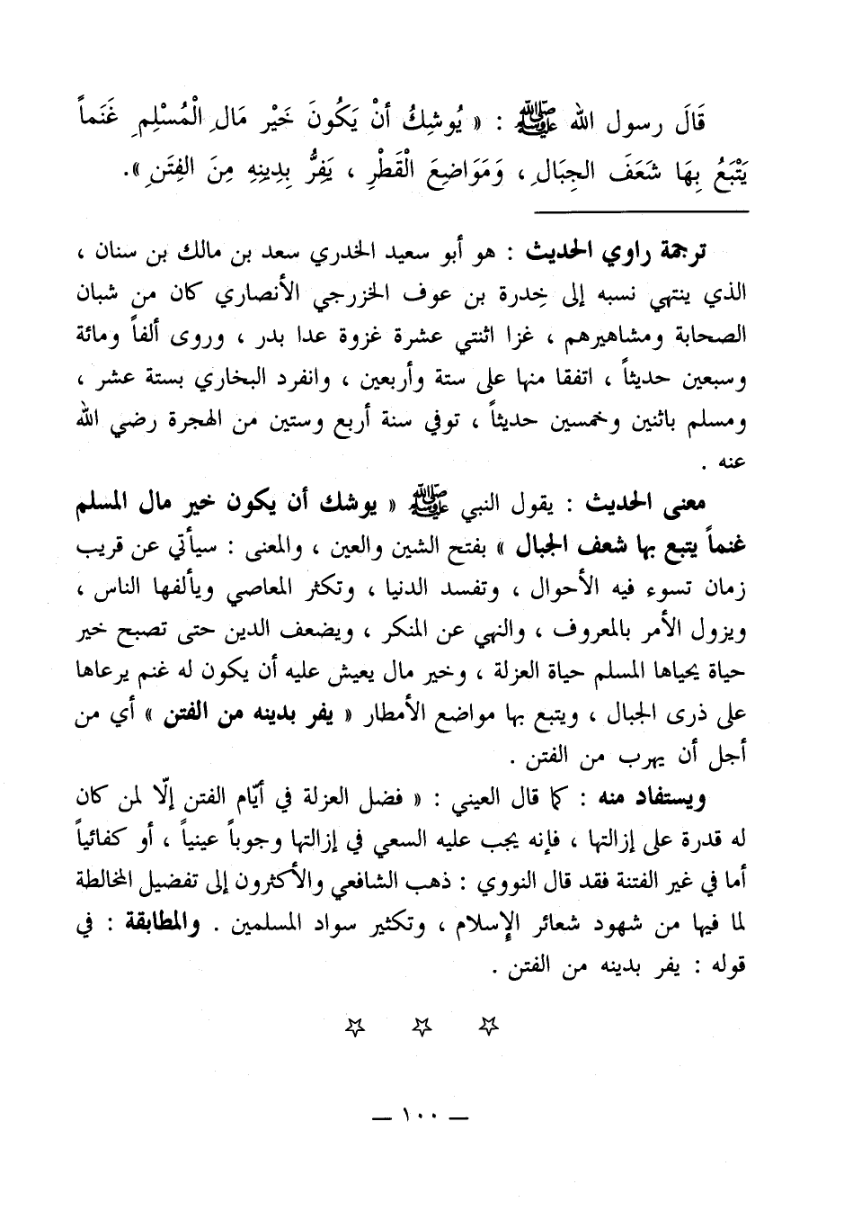 معنى الحديث: يقول النبي - صلى الله عليه وسلم - " يوشك أن يكون خير مال المسلم غنماً يتبع بما شعف الجبال " بفتح الشين والعين، والمعنى: سيأتي عن قريب زمان تسوء فيه الأحوال، وتفسد الدنيا، وتكثر المعاصي ويألفها الناس، ويزول الأمر بالمعروف، والنهي عن المنكر، ويضعف الدين حتى تصبح خير حياة يحياها المسلم حياة العزلة، وخير مال يعيش عليه أن يكون له غنم يرعاها على ذرى الجبال، ويتبع بها مواضع الأمطار " يفر بدينه من - صلى الله عليه وسلم - " أي من أجل أن يهرب من الفتن.