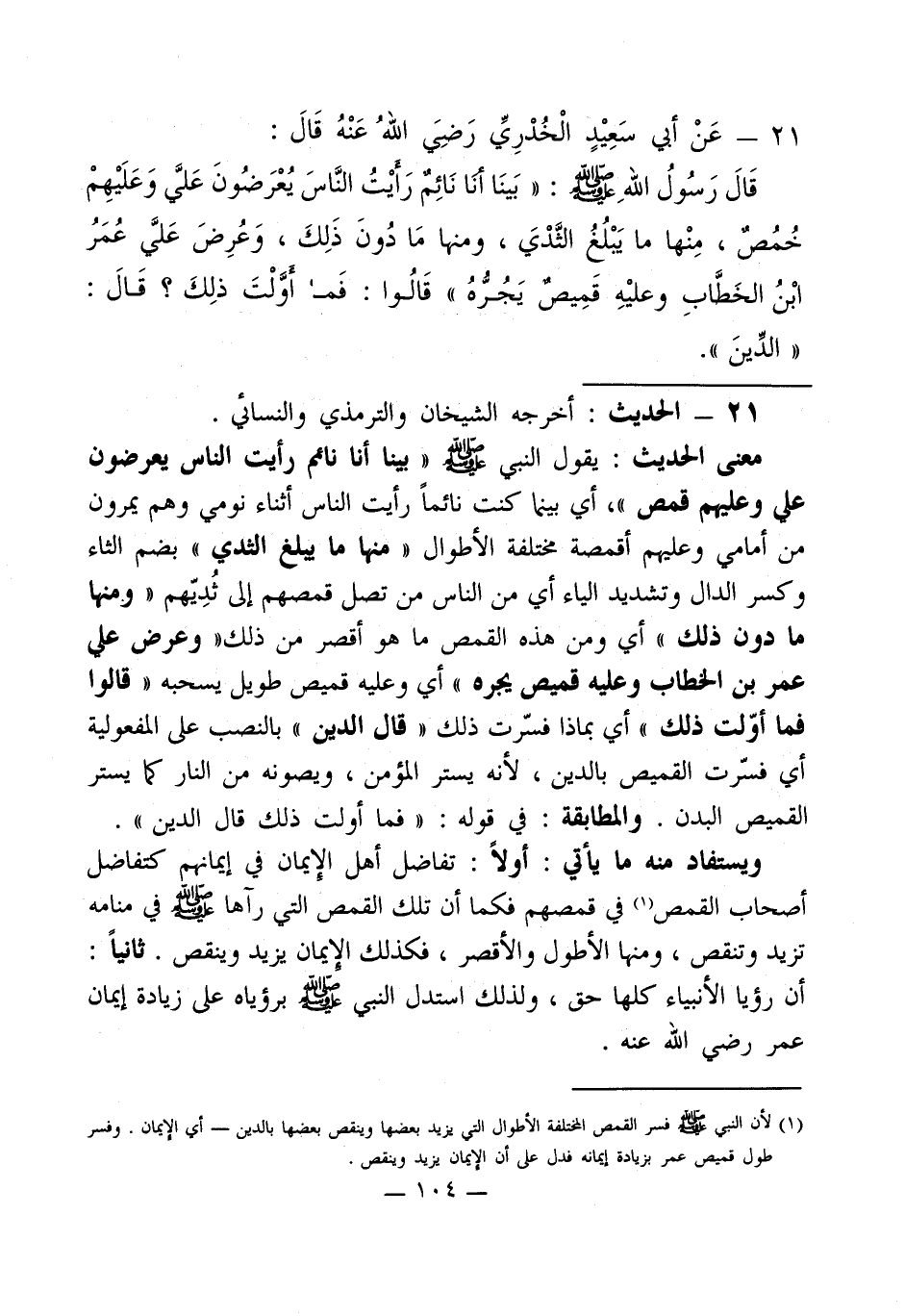 معنى الحديث: يقول النبي - صلى الله عليه وسلم - " بينا أنا نائم رأيت الناس يعرضون علي وعليهم قمص "، أي بينما كنت نائماً رأيت الناس أثناء نومي وهم يمرون من أمامي وعليهم أقمصة مختلفة الأطوال " منها ما يبلغ الثدي " بضم الثاء وكسر الدال وتشديد الياء أي من الناس من تصل قمصهم إلى ثُدِيّهم " ومنها ما دون ذلك " أي ومن هذه القمص ما هو أقصر من ذلك " وعرض علي عمر بن الخطاب وعليه قميص يجره " أي وعليه قميص طويل يسحبه " قالوا فما أوّلت ذلك " أي بماذا فسّرت ذلك " قال الدين " بالنصب على المفعولية أى فسّرت القميص بالدين، لأنه يستر المؤمن، ويصونه من النار كما يستر القميص البدن. والمطابقة: في قوله " فما أولت ذلك قال الدين ".