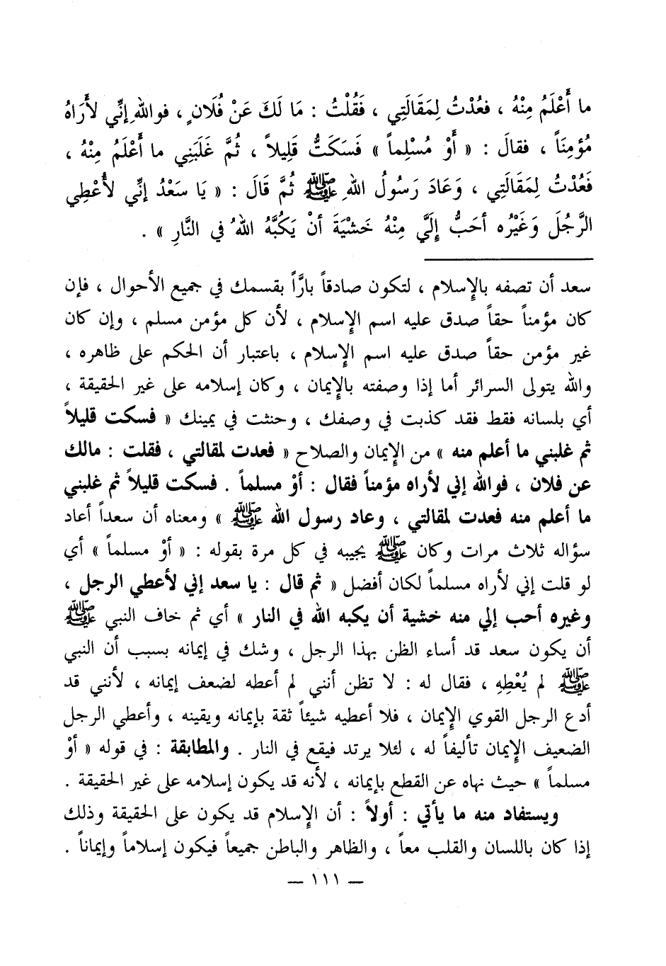 ما أعْلَمُ مِنْهُ، فعُدْتُ لِمَقَالَتِي، فَقُلْتُ: مَا لَك عَنْ فُلَان، فواللهِ إنِّي لأرَاهُ مُؤمِنَاً، فقالَ: " أوْ مُسْلِماً " فَسَكَتُّ قَلِيلاً، ثُمَّ غَلَبَنِي ما أعْلَمُ مِنْهُ، فَعُدْتُ لِمَقَالَتِي، وَعَادَ رَسُولُ اللهِ - صلى الله عليه وسلم - ثُمَّ قَالَ: " يَا سَعْدُ إنِّي لأعْطِي الرَّجُلَ وَغَيْرُه أحَبُّ إِلَيَّ مِنْهُ خَشْيَةَ أنْ يَكُبَّهُ اللهُ في النَّارِ ".
