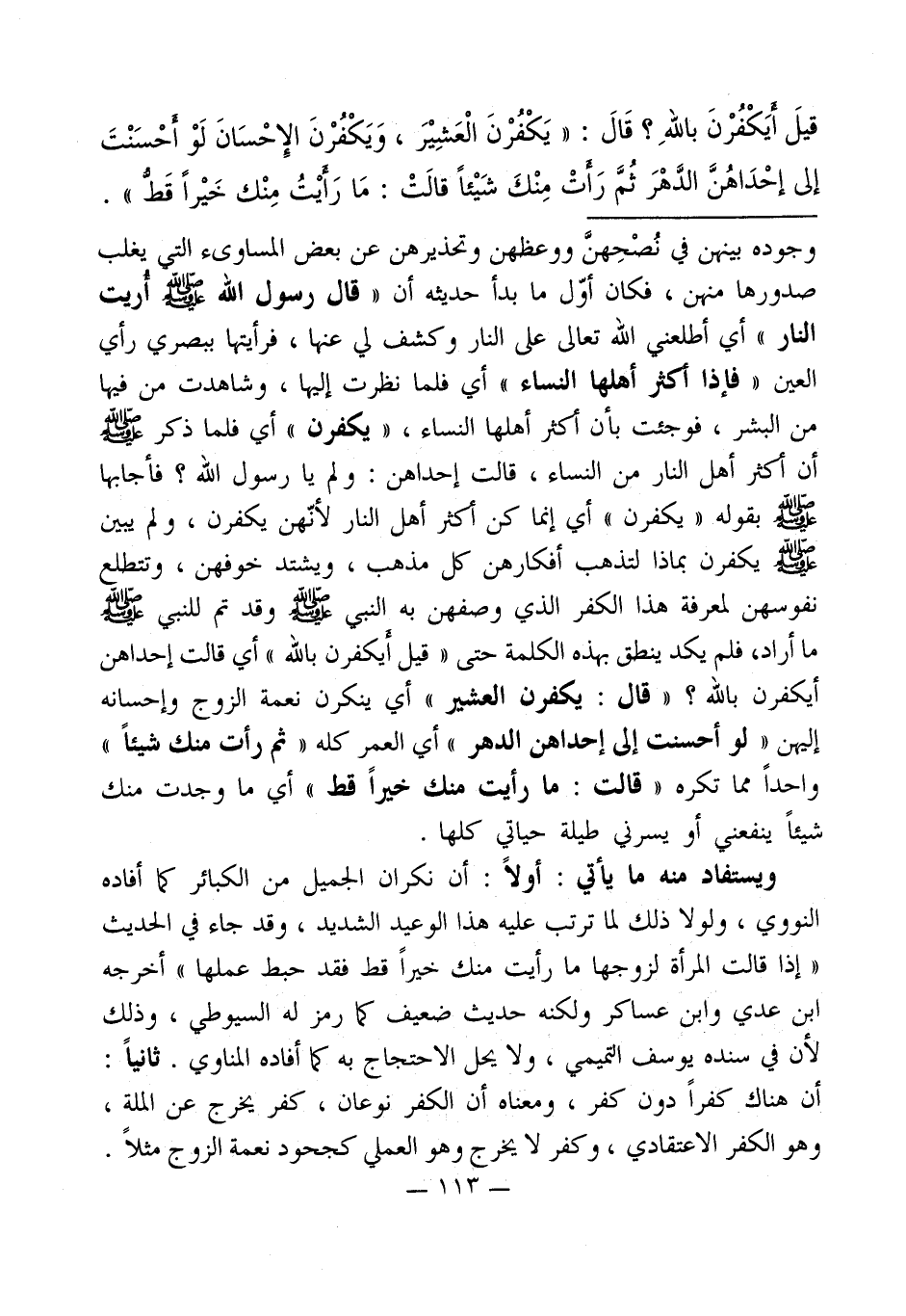 قيلَ أيَكْفُرْنَ باللهِ؟ قَالَ: " يَكْفُرْنَ الْعَشيْرَ، وَيَكْفُرْنَ الإِحْسَانَ لَوْ أحْسَنْتَ إلى إحْدَاهُنَّ الدَّهْرَ ثُمَّ رَأتْ مِنْكَ شَيْئاً قالَتْ: مَا رَأيْتُ مِنْك خَيْراً قَط ".