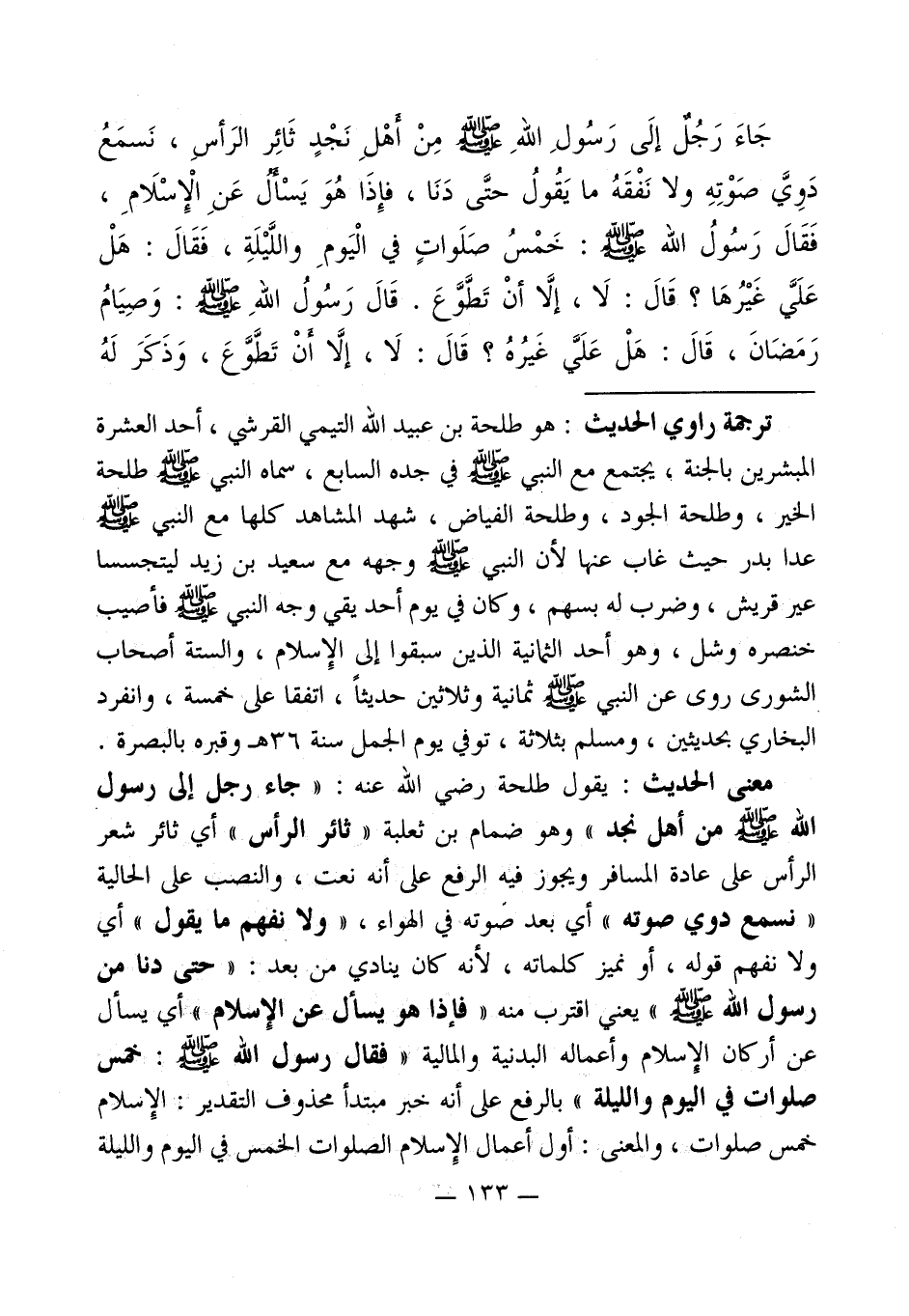 معنى الحديث: يقول طلحة رضي الله عنه: " جاء رجل إلى رسول - صلى الله عليه وسلم - من أهل نجد " وهو ضمام بن ثعلبة " ثائر الرأس " أي ثائر شعر الرأس على عادة المسافر ويجوز فيه الرفع على أنه نعت، والنصب على الحالية " نسمع دوي صوته " أي بعد صوته في الهواء، " ولا نفهم ما يقول " أي ولا نفهم قوله، أو نميز كلماته، لأنه كان ينادي من بعد: " حتى دنا من رسول الله - صلى الله عليه وسلم - " يعني اقترب منه " فإذا هو يسأل عن الإِسلام " أي يسأل عن أركان الإِسلام وأعماله البدنية والمالية " فقال رسول - صلى الله عليه وسلم -: خمس صلوات في اليوم والليلة " بالرفع على أنه خبر مبتدأ محذوف التقدير: الإِسلام خمس صلوات، والمعنى: أول أعمال الإِسلام الصلوات الخمس في اليوم والليلة