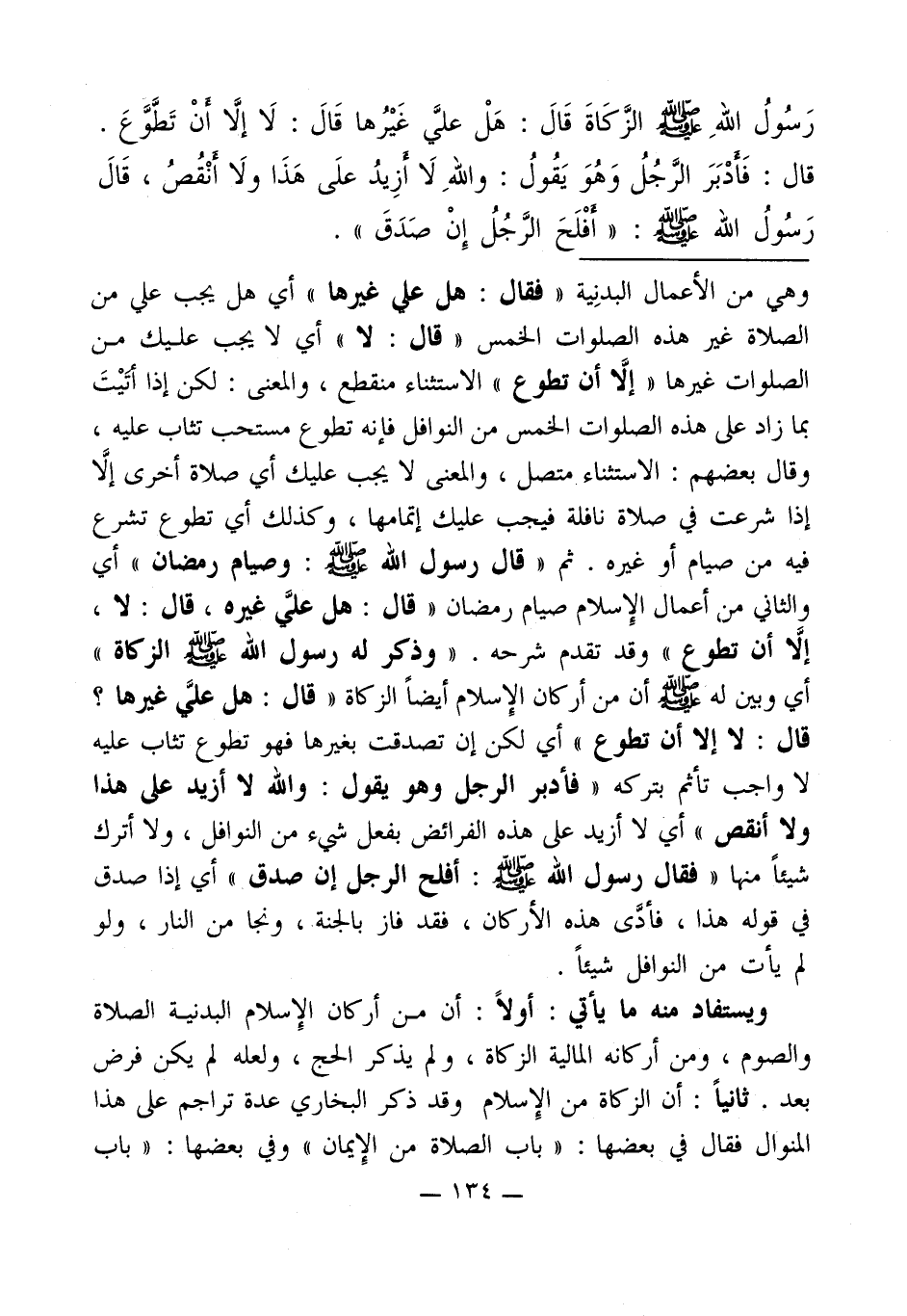 رَسُولُ اللهِ - صلى الله عليه وسلم - الزَّكَاةَ قَالَ: هَلْ عليَّ غَيْرُها قَالَ: لَا إلَّا أنْ تَطَّوَّعَ.