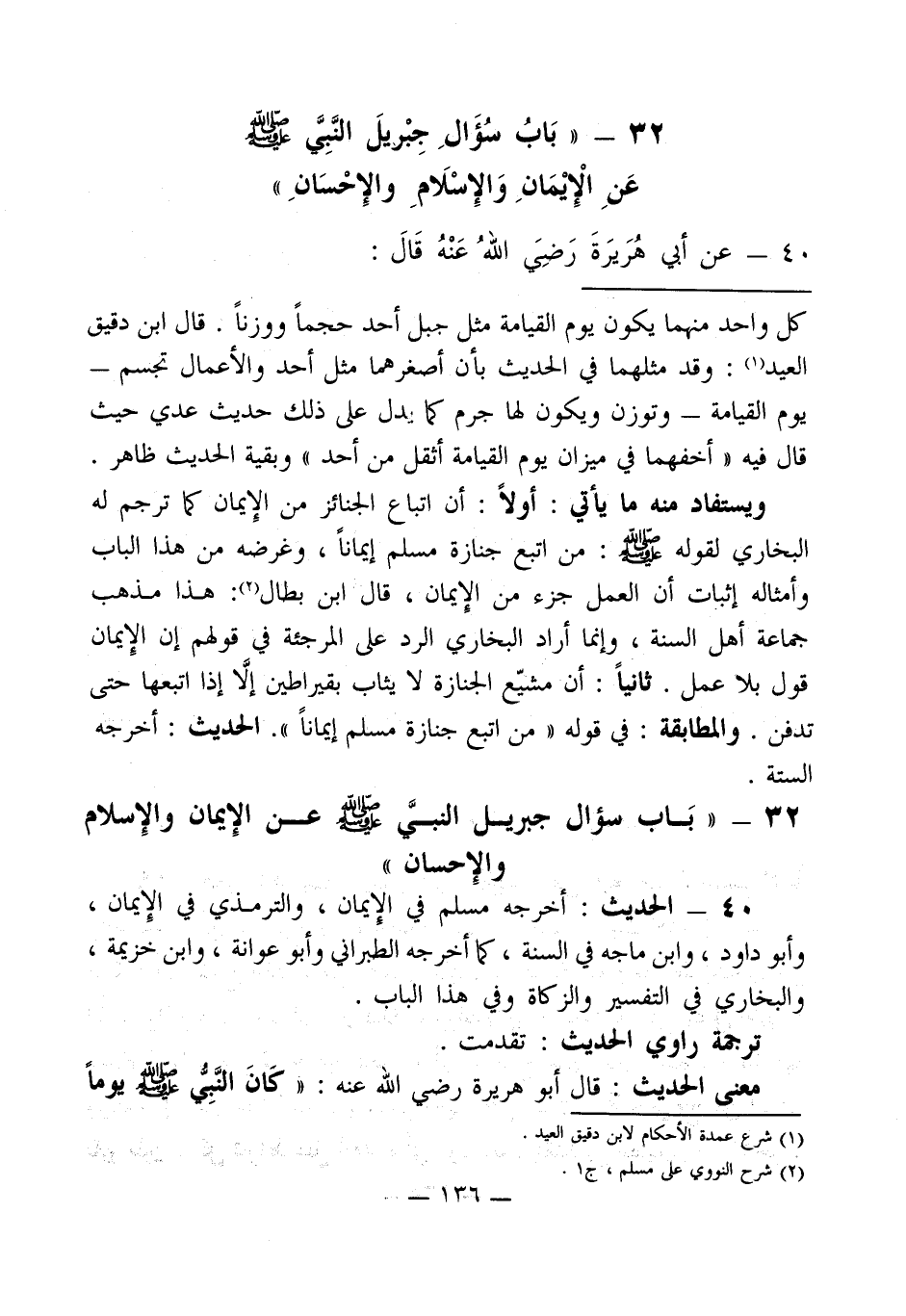 32 - " بَابُ سُؤَالِ جِبْريلَ النَّبِيَّ - صلى الله عليه وسلم - عَنِ الإيْمَانِ وَالإِسْلَامِ والإِحْسَانِ "