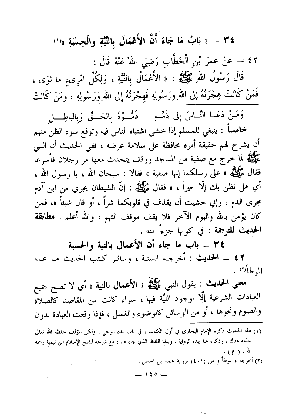 (¬1) هذا الحديث ذكره الإمام البخاري في أول الكتاب، في باب بدء الوحي، ولكن المؤلف حفظه الله تعالى حذفه هناك، وذكره هنا بهذه الرواية، وبهذا اللفظ الذي جاء هنا، مع شرحه لشيخ الإسلام ابن تيمية رحمه الله. (ع).