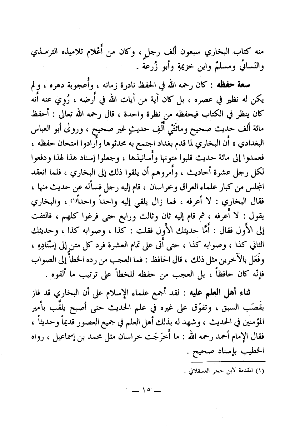سعة حفظه: كان رحمه الله في الحفظ نادرة زمانه، وأعجوبة دهره، ولم يكن له نظير في عصره، بل كان آية من آيات الله في أرضه، رُوِى عنه أنه كان ينظر في الكتاب فيحفظه من نظرة واحدة، قال رحمه الله تعالى: أحفظ مائة ألف حديث صحيح ومائَتَيْ أَلفِ حديثٍ غير صحيح، وروى أبو العباس البغدادي "أن البخاري لما قدم بغداد اجتمع به محدثوها وأَرادوا امتحان حفظه، فعمدوا إلى مائة حديث قلبوا متونها وأسانيدَها، وجعلوا إسناد هذا لهذا ودفعوا لكل رجل عشرة أحاديث، وأمروهم أن يلقوا ذلك إلى البخاري، فلما انعقد المجلس من كبار علماء العراق وخراسان، قام إليه رجل فسأله عن حديث منها، فقال البخاري: لا أعرفه، فما زال يلقى إليه واحداً واحداً (¬1)، والبخاري يقول: لا أَعرفه، ثم قام إليه ثان وثالث ورابع حتى فرغوا كلهم، فالتفت إلى الأَول فقال: أمَّا حديثك الأول فقلت: كذا، وصوابه كذا، وحديثك الثاني كذا، وصوابه كذا، حتى أَتى على تمام العشرة فرد كل متنٍ إلى إسْنَادِهِ، وفَعَل بالآخرين مثل ذلك، قال الحافظ: فما العجب من رده الخطأ إلى الصواب فإنّه كان حافظاً، بل العجب من حفظه للخطأ على ترتيب ما ألقوه.