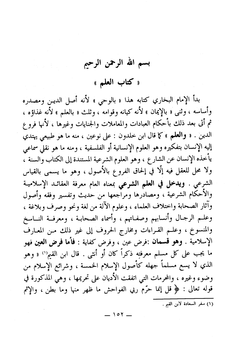 بدأ الإِمام البخاري كتابه هذا " بالوحي " لأنه أصل الدين ومصدره وأساسه، وثنى " بالإِيمان " لأنه كيانه وقوامه، وثلث " بالعلم " لأنه غذاؤه، ثم أَتى بعد ذلك بأحكام العبادات والمعاملات والجنايات وغيرها، لأنها فروع الدين. " والعلم " كما قال ابن خلدون: على نوعين، منه ما هو طبيعي يهتدي إليه الإنسان بتفكيره وهو العلوم الإِنسانية أو الفلسفية، ومنه ما هو نقلي سماعي يأخذه الإِنسان عن الشارع، وهو العلوم الشرعية المستندة إلى الكتاب والسنة، ولا محل للعقل فيه إلاّ في إلحاق الفروع بالأصول، وهو ما يسمى بالقياس الشرعي. ويدخل في العلم الشرعي بمعناه العام معرفة العقائد الإِسلامية والأحكام الشرعية، ومصادرها ومراجعها من حديث وتفسير وفقه وأصول وآثار الصحابة واختلاف العلماء، وعلوم الآلة من لغة ونحو وصرف وبلاغة، وعلم الرجال وأنسابهم وصفاتهم، وأسماء الصحابة، ومعرفة الناسخ والمنسوخ، وعلم القراءات ومخارج الحروف إلى غير ذلك من المعارف الإِسلامية. وهو قسمان: فرض عين، وفرض كفاية: فأما فرض العين فهو ما يجب على كل مسلم معرفتِه ذكراً كان أو أنثى. قال ابن القيم (¬1) " وهو الذي لا يسع مسلماً جهله كأصول الإِسلام الخمسة، وشرائع الإِسلام من وضوء وغيره، والمحرمات التي اتفقت الأديان على تحريمها، وهي المذكورة في قوله تعالى: (قُلْ إِنَّمَا حَرَّمَ رَبِّيَ الْفَوَاحِشَ مَا ظَهَرَ مِنْهَا وَمَا بَطَنَ وَالْإِثْمَ