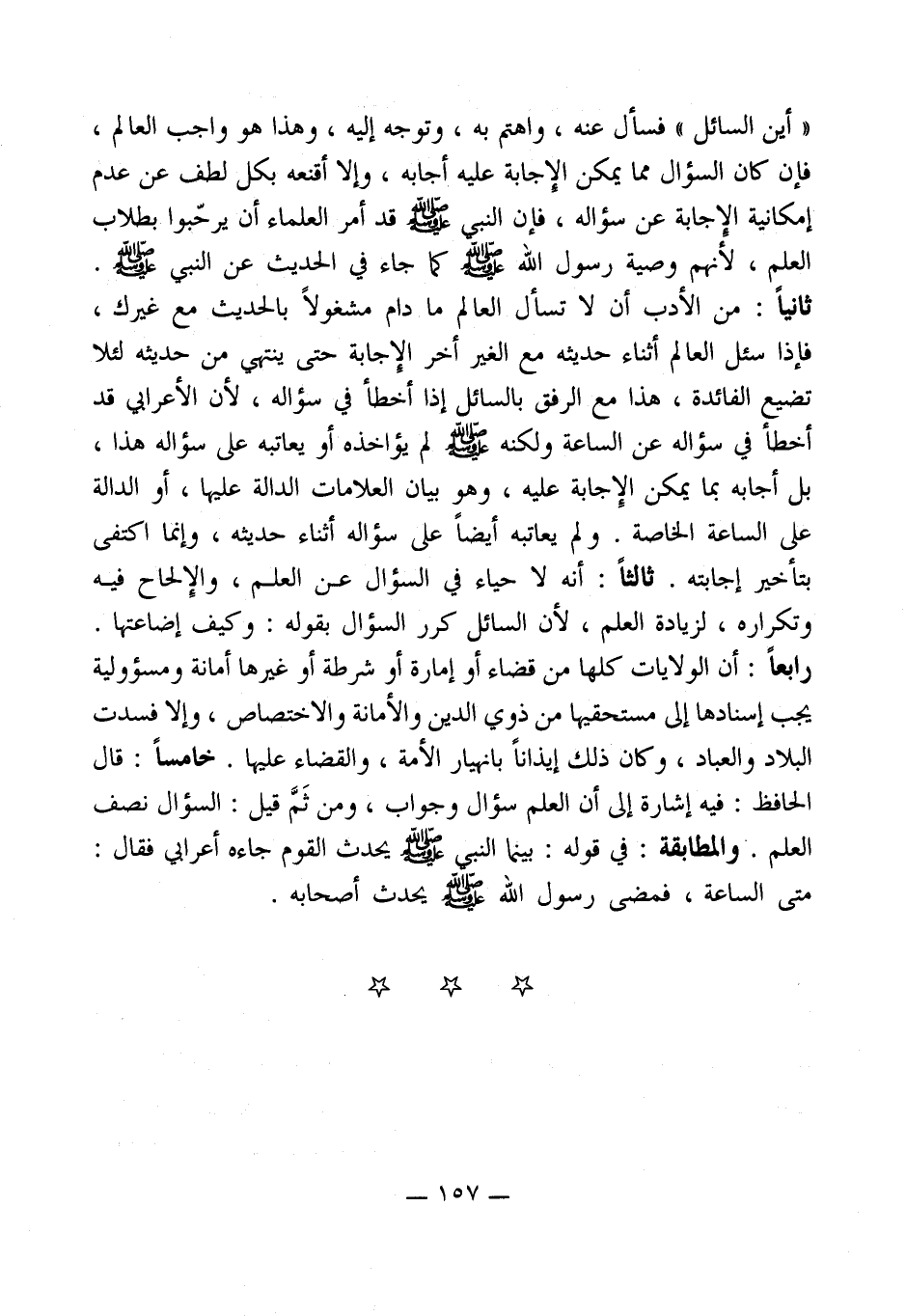ثانياً: من الأدب أن لا تسأل العالم ما دام مشغولاً بالحديث مع غيرك، فإذا سئل العالم أثناء حديثه مع الغير أخر الإجابة حتى ينتهي من حديثه لئلا تضيع الفائدة، هذا مع الرفق بالسائل إذا أخطأ في سؤاله، لأن الأعرابي قد أخطأ في سؤاله عن الساعة ولكنه - صلى الله عليه وسلم - لم يؤاخذه أو يعاتبه على سؤاله هذا، بل أجابه بما يمكن الإِجابة عليه، وهو بيان العلامات الدالة عليها، أو الدالة على الساعة الخاصة. ولم يعاتبه أيضاً على سؤاله أثناء حديثه، وإنما اكتفى بتأخير إجابته. ثالثاً: أنه لا حياء في السؤال عن العلم، والإِلحاح فيه وتكراره، لزيادة العلم، لأن السائل كرر السؤال بقوله: وكيف إضاعتها.