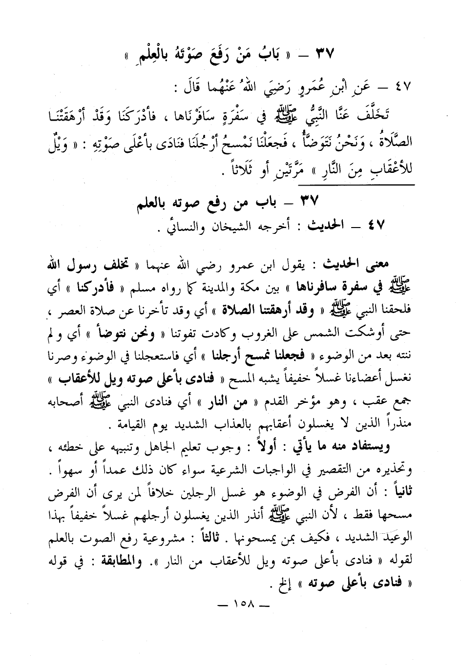 ثانياً: أن الفرض في الوضوء هو غسل الرجلين خلافاً لمن يرى أن الفرض مسحها فقط، لأن النبي - صلى الله عليه وسلم - أنذر الذين يغسلون أرجلهم غسلاً خفيفاً بهذا الوعَيد الشديد، فكيف بمن يمسحونها. ثالثاً: مشروعية رفع الصوت بالعلم لقوله " فنادى بأعلى صوته ويل للأعقاب من النار ". والمطابقة: في قوله " فنادى بأعلى صوته " إلخ.