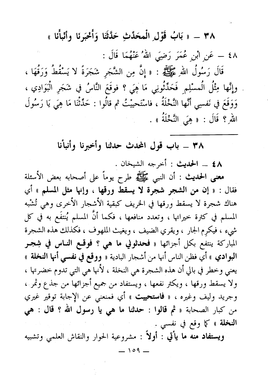 قَالَ رَسُولُ اللهِ - صلى الله عليه وسلم -: " إِنَّ مِن الشَّجَرِ شَجَرَةً لا يَسْقُطُ وَرَقُهَا، وِإنَّها مِثْلُ الُمسْلِمِ فَحَدِّثُونِي مَاْ هِيَ؟ فوقَعَ النَّاسُ في شَجَرِ الْبَوَادِي، وَوَقَعَ في نَفسِي أنَها النَّخْلَةُ، فاسْتَحييْتُ ثم قالُوا: حَدِّثْنَا مَا هِيَ يَا رَسُولَ اللهَ؟ قَالَ: " هِي النَّخْلَةُ ".