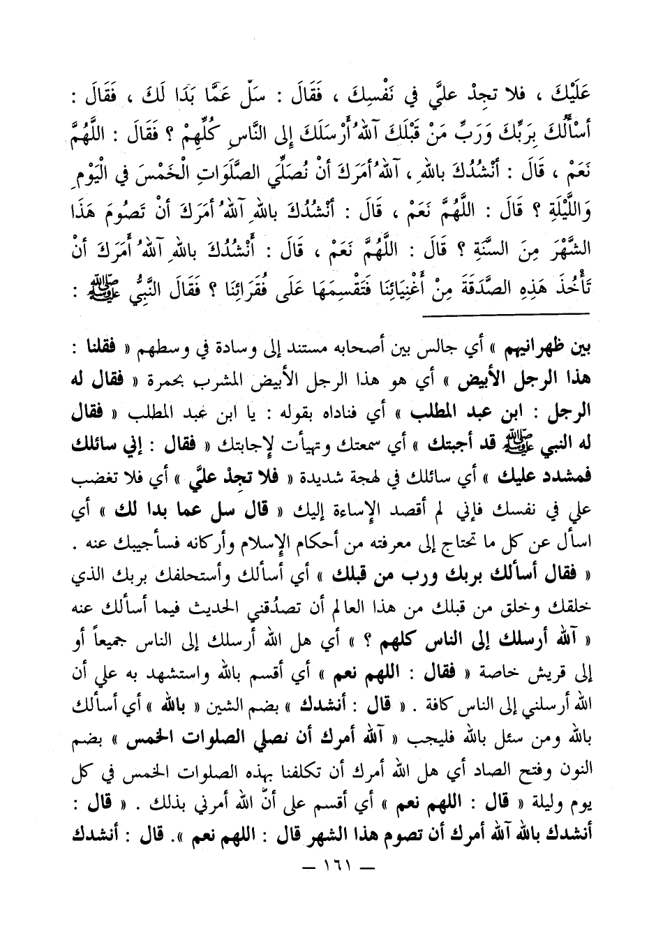 عَلَيْكَ، فلا تجِدْ عليَّ في نَفْسِكَ، فَقَالَ: سَل عَمّا بَدَا لَكَ، فَقَالَ: أسْألكَ بِرَبِّكَ وَرَبِّ مَنْ قَبْلَكَ آللهُ أرْسَلَكَ إِلى النَّاس كُلِّهِمْ؟ فَقَالَ: اللَّهُمَّ نَعَمْ، قَالَ: أنشُدُكَ باللهِ، آللهُ أمَرَكَ أنْ نُصَلِّيَ الصَّلَوَاتِ الْخَمْسَ في الْيَوْمِ وَاللَّيْلَةِ؟ قَالَ: اللَّهُمَّ نَعَمْ، قَالَ: أنشُدُكَ باللهِ آللهُ أمَرَكَ أنْ تَصُومَ هَذَا الشَّهْرَ مِنَ السَنّةَ؟ قَالَ: اللَّهُمَّ نَعَمْ، قَالَ: أنْشُدُكَ باللهِ آللهُ أمَرَكَ أنْ تَأخُذَ هَذِهِ الصَّدَقَةَ مِنْ أغْنِيَائِنَا فَتَقْسِمَهَا عَلَى فُقَرَائِنَا؟ فَقَالَ النَّبِيُّ - صلى الله عليه وسلم -: