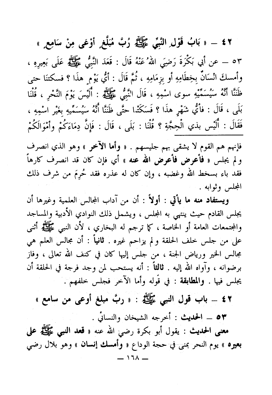 53 - عن أبي بَكْرَةَ رَضِيَ اللهُ عَنْهُ قَالَ: قَعَدَ النَّبِيُّ - صلى الله عليه وسلم - عَلَى بَعِيرِهِ، وأمسكَ انْسَان بِخِطَامِهِ أو بِزِمَامِهِ، ثُمَّ قَالَ: أيُّ يَوْم هذَا؟ فسكتنَا حتى ظَنَنَّا أنَّهُ سَيُسَمِّيْهِ سوى اسْمِهِ، قَالَ النَّبِيُّ - صلى الله عليه وسلم -: أليْس يَوْمَ النَّحْرِ، قُلْنَا بَلَى، قَالَ: فأيُّ شَهْرٍ هذَا؟ فَسَكَتنا حتَّى ظَنَنَّا أنَّهُ سَيُسَمِّيهِ بِغَيْر اسْمِهِ، فَقَالَ: أليْس بذي الْحِجَّةِ؟ قُلْنَا: بَلَى، قَالَ: فَإِنَّ دِمَاءَكُمْ وأمْوَالَكُمْ