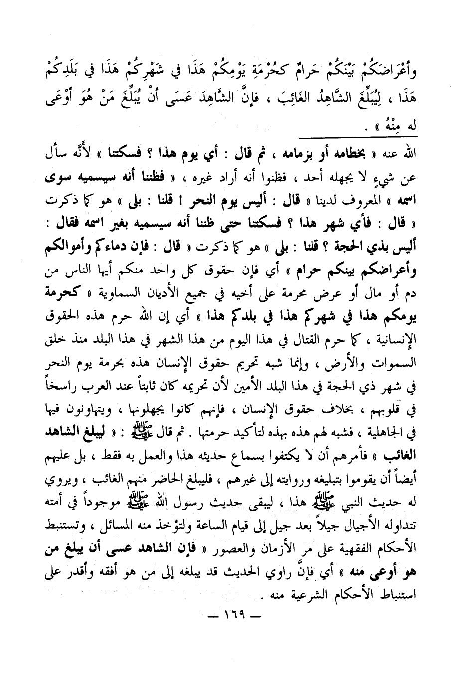 الله عنه " بخطامه أو بزمامه، ثم قال: أي يوم هذا؟ فسكتنا " لأنَّه سأل عن شيءٍ لا يجهله أحد، فظنوا أنه أراد غيره، " فظننا أنه سيسميه سوى اسمه " المعروف لدينا " قال: أليس يوم النحر! قلنا: بلى " هو كما ذكرت " قال: فأي شهر هذا؟ فسكتنا حتى ظننا أنه سيسميه بغير اسمه فقال: أليس بذي الحجة؟ قلنا: بلى " هو كما ذكرت " قال: فإن دماءكم وأموالكم وأعراضكم بينكم حرام " أي فإن حقوق كل واحد منكم أيها الناس من دم أو مال أو عرض محرمة على أخيه في جميع الأديان السماوية " كحرمة يومكم هذا في شهركم هذا في بلدكم هذا " أي إن الله حرم هذه الحقوق الإِنسانية، كما حرم القتال في هذا اليوم من هذا الشهر في هذا البلد منذ خلق السموات والأرض، وإنما شبه تحريم حقوق الإنسان هذه بحرمة يوم النحر في شهر ذي الحجة في هذا البلد الأمين لأن تحريمه كان ثابتاً عند العرب راسخاً في قلوبهم، بخلاف حقوق الإنسان، فإنهم كانوا يجهلونها، ويتهاونون فيها في الجاهلية، فشبه لهم هذه بهذه لتأكيد حرمتها. ثم قال - صلى الله عليه وسلم -: " ليبلغ الشاهد الغائب " فأمرهم أن لا يكتفوا بسماع حديثه هذا والعمل به فقط، بل عليهم أيضاً أن يقوموا بتبليغه وروايته إلى غيرهم، فليبلغ الحاضر منهم الغائب، ويروي له حديث النبي - صلى الله عليه وسلم - هذا، ليبقى حديث رسول الله - صلى الله عليه وسلم - موجوداً في أمته تتداوله الأجيال جيلاً بعد جيل إلى قيام الساعة ولتؤخذ منه المسائل، وتستنبط الأحكام الفقهية على مر الأزمان والعصور " فإن الشاهد عسى أن ييلغ من هو أوعى منه " أي فإنَّ راوي الحديث قد يبلغه إلى من هو أفقه وأقدر على استنباط الأحكام الشرعية منه.