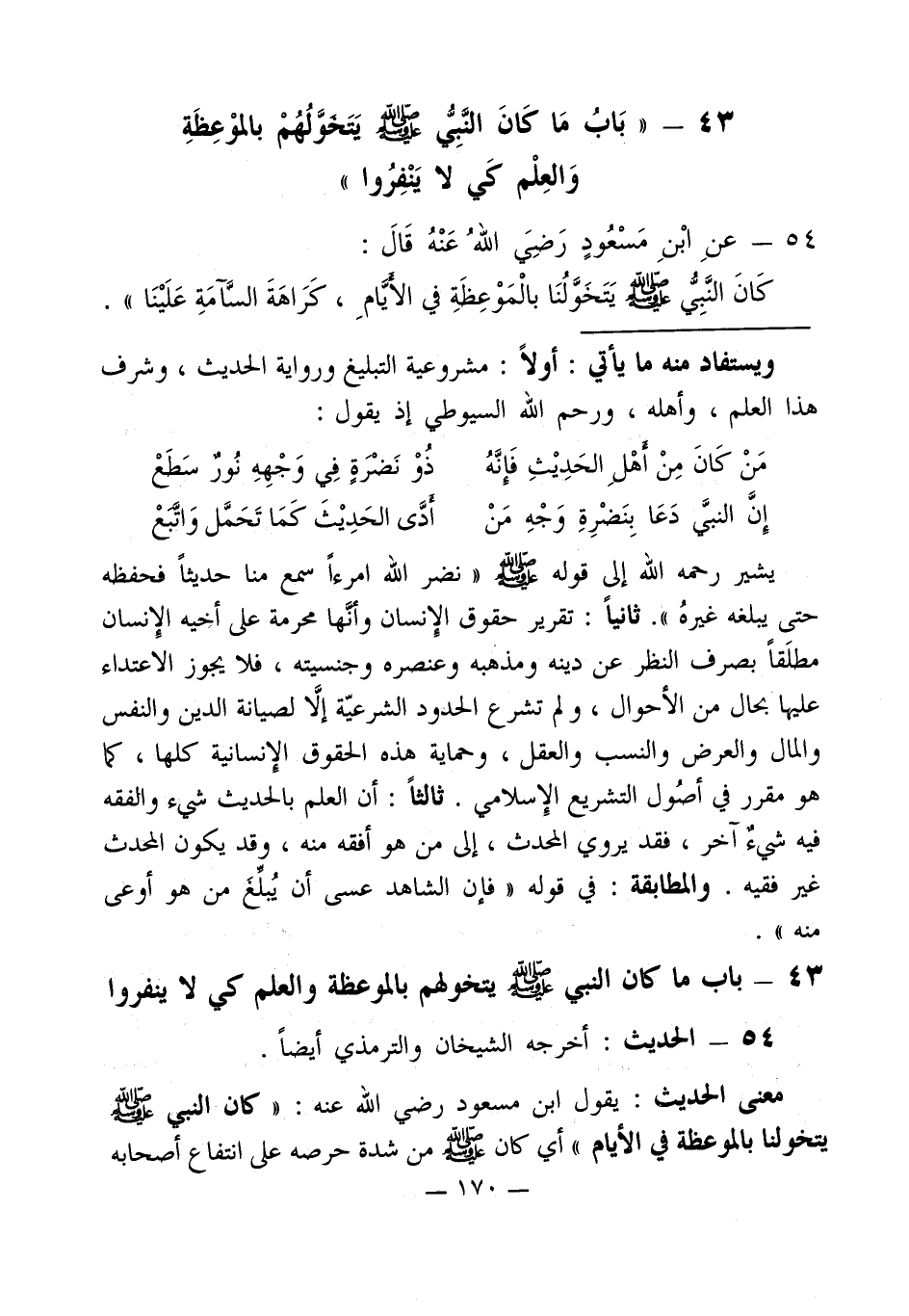 43 - " بَابُ مَا كَانَ النَّبِيُّ - صلى الله عليه وسلم - يَتَخوَّلُهُمْ بالموْعِظَةِ وَالعِلْم كَي لا يَنْفِرُوا "