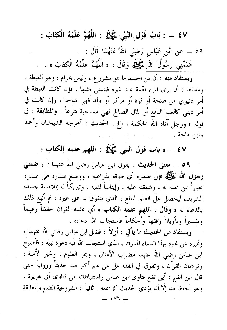 59 - معنى الحديث: يقول ابن عباس رضي الله عنهما: " ضمني رسول الله - صلى الله عليه وسلم - " إلى صدره أي طوقه بذراعيه، ووضع صدره على صدره تعبيراً عن محبته له، وشفقته عليه، وإيناساً لقلبه، وتبريكاً له بملامسة جسده الشريف ليحصل على العلم النافع، الذي يتفوق به على غيره، ثم أتبع ذلك بالدعاء له " وقال: اللهم علمه الكتاب " أي علمه القرآن حفظاً وفهماً وتفسيراً وتأويلاً وفقهاً وأحكاماً فاستجاب الله دعاءه.