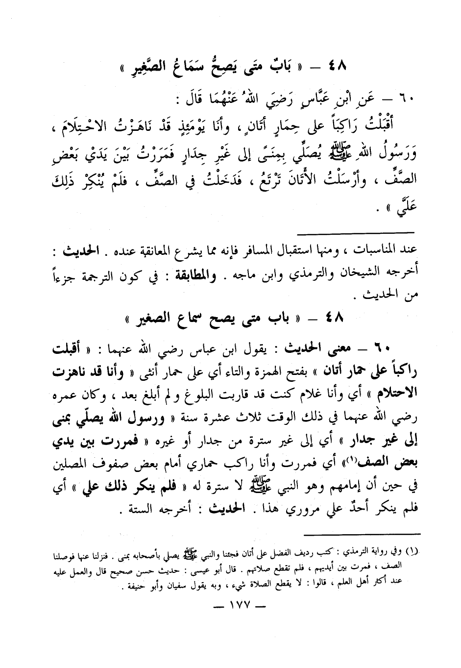 60 - معنى الحديث: يقول ابن عباس رضي الله عنهما: " أقبلت راكباً على حمار أتان " بفتح الهمزة والتاء أي على حمار أنثى " وأنا قد ناهزت الاحتلام " أي وأنا غلام كنت قد قاربت البلوغ ولم أبلغ بعد، وكان عمره رضي الله عنهما في ذلك الوقت ثلاث عشرة سنة " ورسول الله يصلّي بمنى إلى غير جدار " أي إلى غير سترة من جدار أو غيره " فمررت بين يدي بعض الصف (¬1) " أي فمررت وأنا راكب حماري أمام بعض صفوف المصلين في حين أن إمامهم وهو النبي - صلى الله عليه وسلم - لا سترة له " فلم ينكر ذلك علي " أي فلم ينكر أحدٌ علي مروري هذا. الحديث: أخرجه الستة.