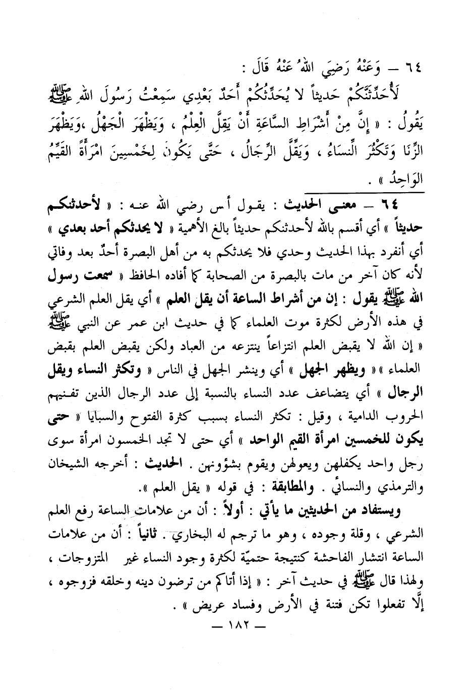 64 - معنى الحديث: يقول أنس رضي الله عنه: " لأحدثنكم حديثاً " أي أقسم بالله لأحدثنكم حديثاً بالغ الأهمية " لا يحدثكم أحد بعدي " أي أنفرد بهذا الحديث وحدي فلا يحدثكم به من أهل البصرة أحدٌ بعد وفاتي لأنه كان آخر من مات بالبصرة من الصحابة كما أفاده الحافظ " سمعت رسول - صلى الله عليه وسلم - يقول: إن من أشراط الساعة أن يقل العلم " أي يقل العلم الشرعي في هذه الأرض لكثرة موت العلماء كما في حديث ابن عمر عن النبي - صلى الله عليه وسلم - " إن الله لا يقبض العلم انتزاعاً ينتزعه من العباد ولكن يقبض العلم بقبض العلماء " " ويظهر الجهل " أي وينشر الجهل في الناس " وتكثر النساء ويقل الرجال " أي يتضاعف عدد النساء بالنسبة إلى عدد الرجال الذين تفنيهم الحروب الدامية، وقيل: تكثر النساء بسبب كثرة الفتوح والسبايا " حتى يكون للخمسين امرأة القيم الواحد " أي حتى لا تجد الخمسون امرأة سوى رجل واحد يكفلهن ويعولهن ويقوم بشؤونهن. الحديث: أخرجه الشيخان والترمذي والنسائي. والمطابقة: في قوله " يقل العلم ".