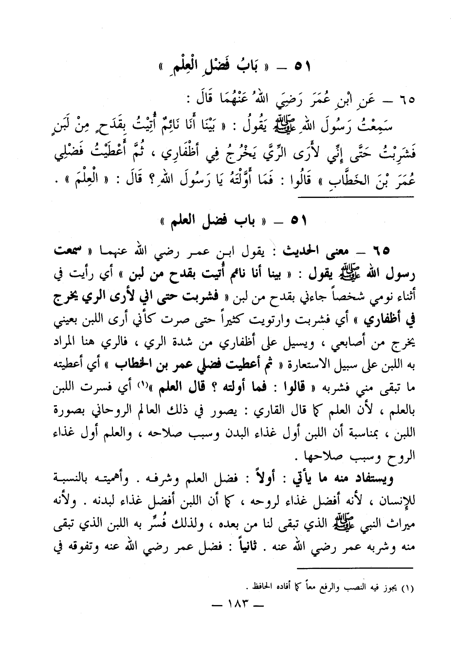 65 - معنى الحديث: يقول ابن عمر رضي الله عنهما " سمعت رسول الله - صلى الله عليه وسلم - يقول: " بينا أنا نائم أتيت بقدح من لبن " أي رأيت في أثناء نومي شخصاً جاءني بقدح من لبن " فشربت حتى اني لأرى الري يخرج في أظفاري " أي فشربت وارتويت كثيراً حتى صرت كأني أرى اللبن بعيني يخرج من أصابعي، ويسيل على أظفاري من شدة الري، فالري هنا المراد به اللبن على سبيل الاستعارة " ثم أعطيت فضلي عمر بن الخطاب " أي أعطيته ما تبقى مني فشربه " دلوا: فما أولته؟ قال العلم " (¬1) أي فسرت اللبن بالعلم، لأن العلم كما قال القاري: يصور في ذلك العالم الروحاني بصورة اللبن، بمناسبة أن اللبن أول غذاء البدن وسبب صلاحه، والعلم أول غذاء الروح وسبب صلاحها.