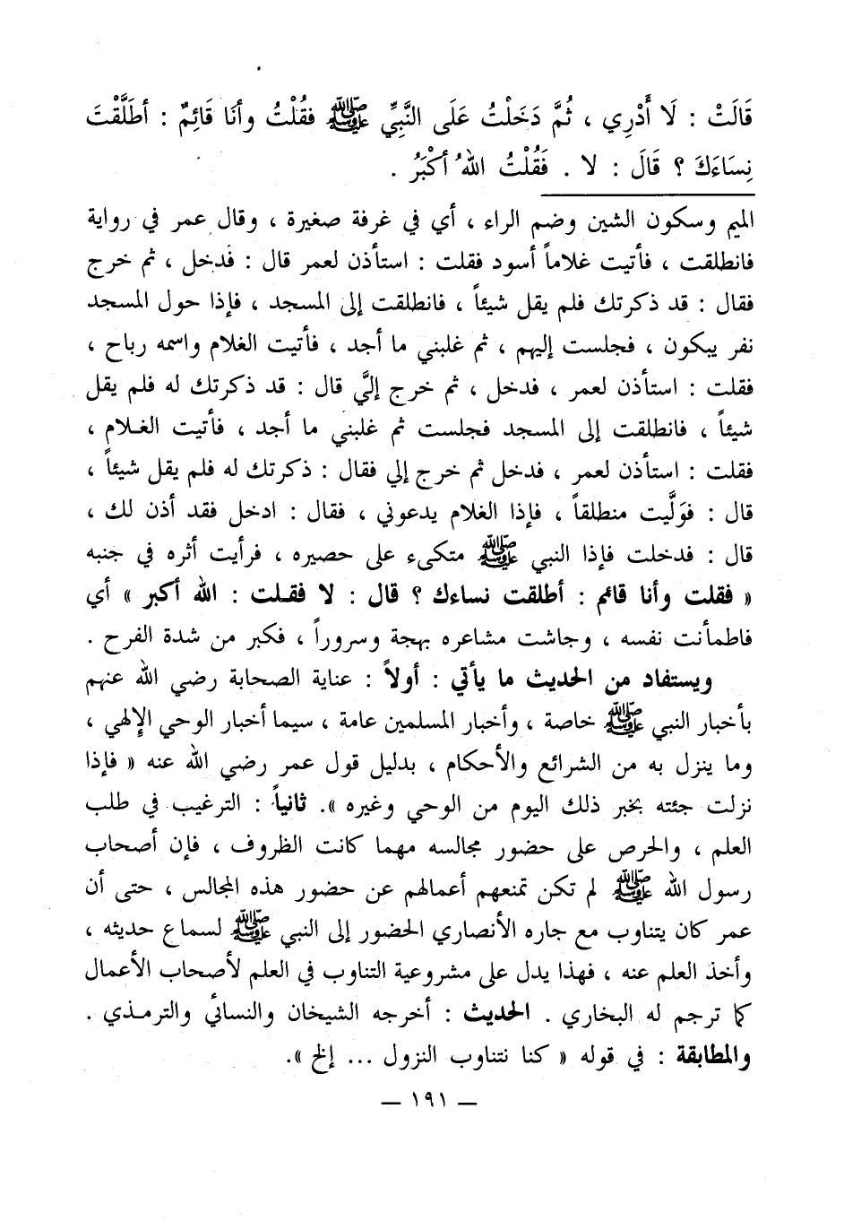 ويستفاد من الحديث ما يأتي: أولاً: عناية الصحابة رضي الله عنهم بأخبار النبي - صلى الله عليه وسلم - خاصة، وأخبار المسلمين عامة، سيما أخبار الوحي الإِلهي، وما ينزل به من الشرائع والأحكام، بدليل قول عمر رضي الله عنه " فإذا نزلت جئته بخبر ذلك اليوم من الوحي وغيره ". ثانياً: الترغيب في طلب العلم، والحرص على حضور مجالسه مهما كانت الظروف، فإن أصحاب رسول الله - صلى الله عليه وسلم - لم تكن تمنعهم أعمالهم عن حضور هذه المجالس، حتى أن عمر كان يتناوب مع جاره الأنصاري الحضور إلى النبي - صلى الله عليه وسلم - لسماع حديثه، وأخذ العلم عنه، فهذا يدل على مشروعية التناوب في العلم لأصحاب الأعمال كما ترجم له البخاري. الحديث: أخرجه الشيخان والنسائي والترمذي.