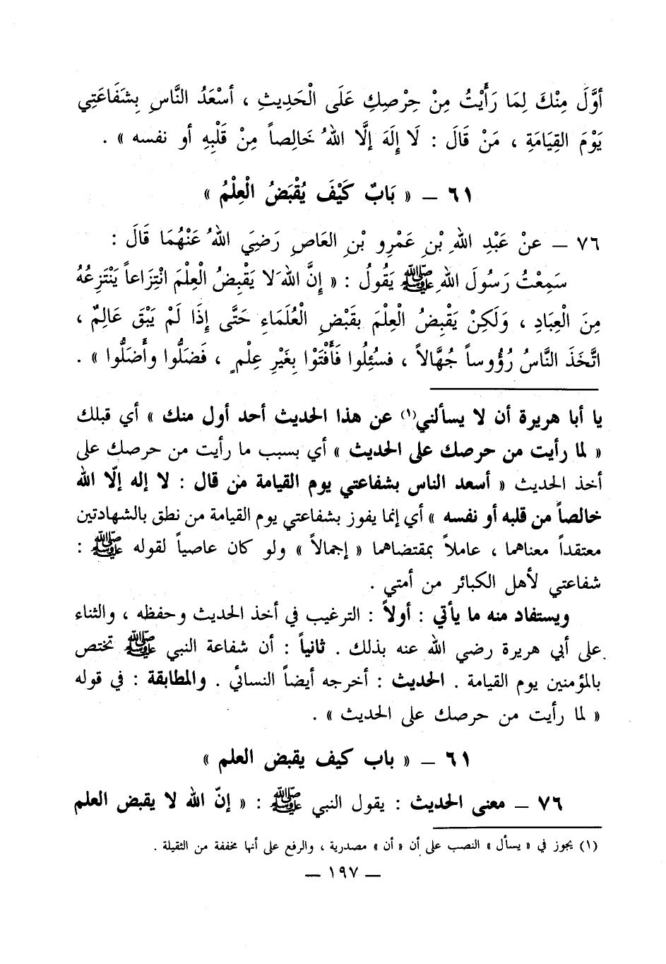 76 - عنْ عَبْدِ اللهِ بْنِ عَمْرِو بْنِ العَاص رَضِيَ اللهُ عَنْهُمَا قَالَ: سَمِعْتُ رَسُولَ اللهِ - صلى الله عليه وسلم - يَقُولُ: " إِنَّ اللهَ لا يَقْبِضُ العِلْمَ انْتِزَاعاً يَنْتَزِعُهُ مِنَ الْعِبَادِ، وَلَكِنْ يَقْبِضُ الْعِلْمَ بقَبْض الْعُلَمَاءِ حَتَّى إِذَا لَمْ يَبْقَ عَالِم، اتَّخَذَ النَّاسُ رُؤوساً جُهَّالاً، فسُئِلُوا فَأفتَوْا بِغَيْرِ عِلْم، فَضَلُّوا وأضلوا ".